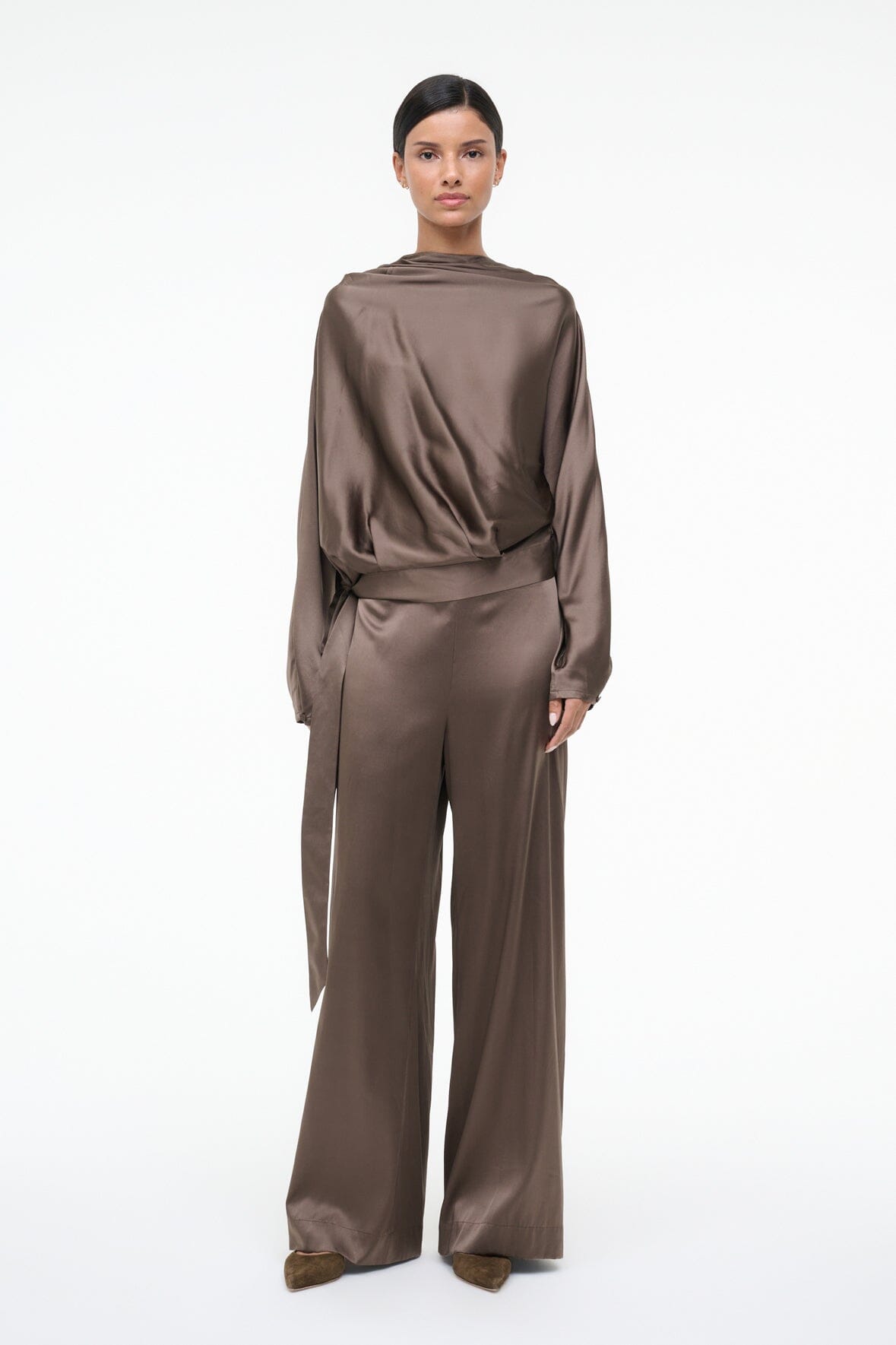 The Phoebe Silk Top is a dolman sleeved top crafted from a stretch silk satin fabric with a side tie detail at the waist and draped neckline.