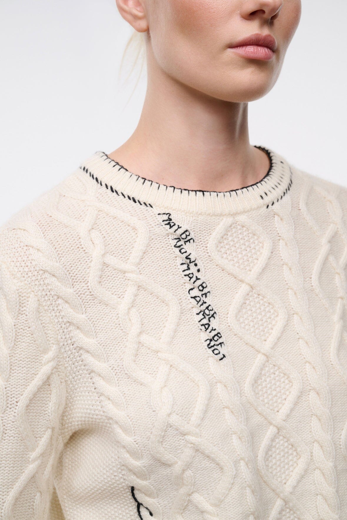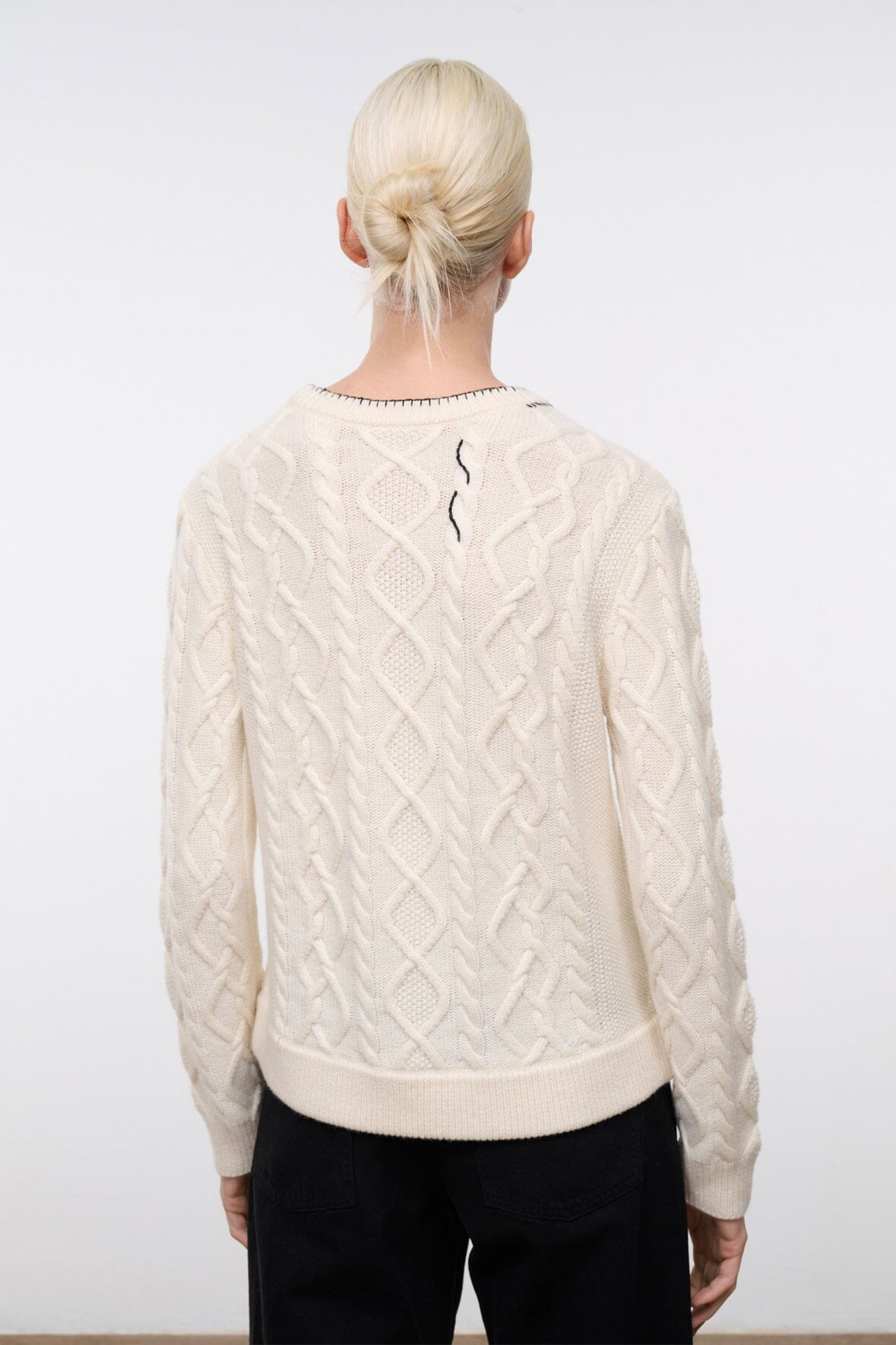 Timeless wool pullover featuring a classic cable knit construction. Elevated with contrast stitching at the neckline and side seams for subtle textural interest.