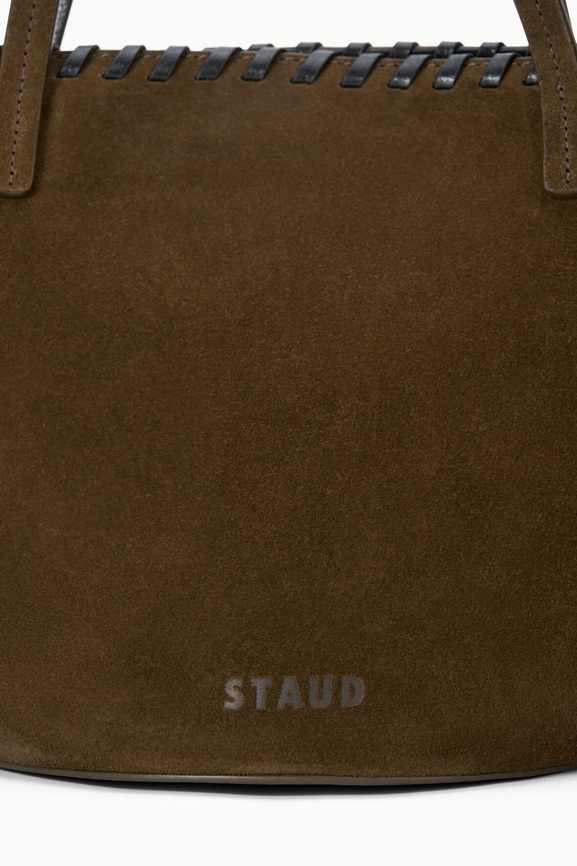 The Caro Mini Bucket Bag is a suede bag with whipstitch details, a magnet tab closure and an interior zip pocket.