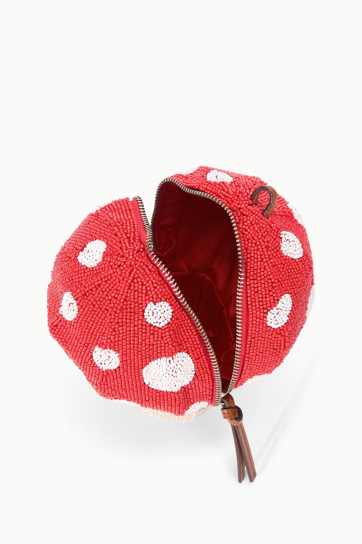 A hand-beaded handheld bag with detachable crossbody strap, the Shroom features a leather-wrapped handle and zipper opening.