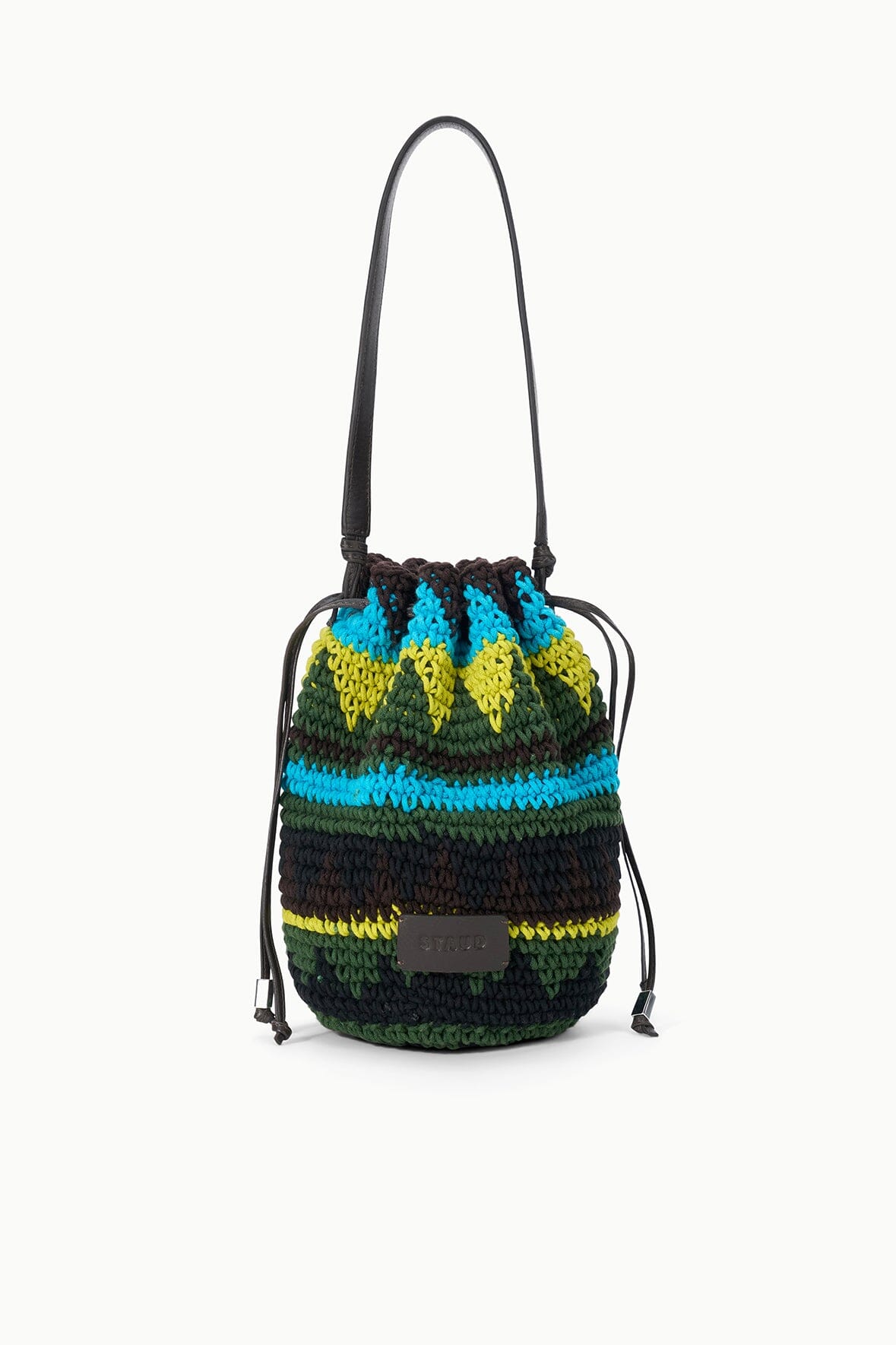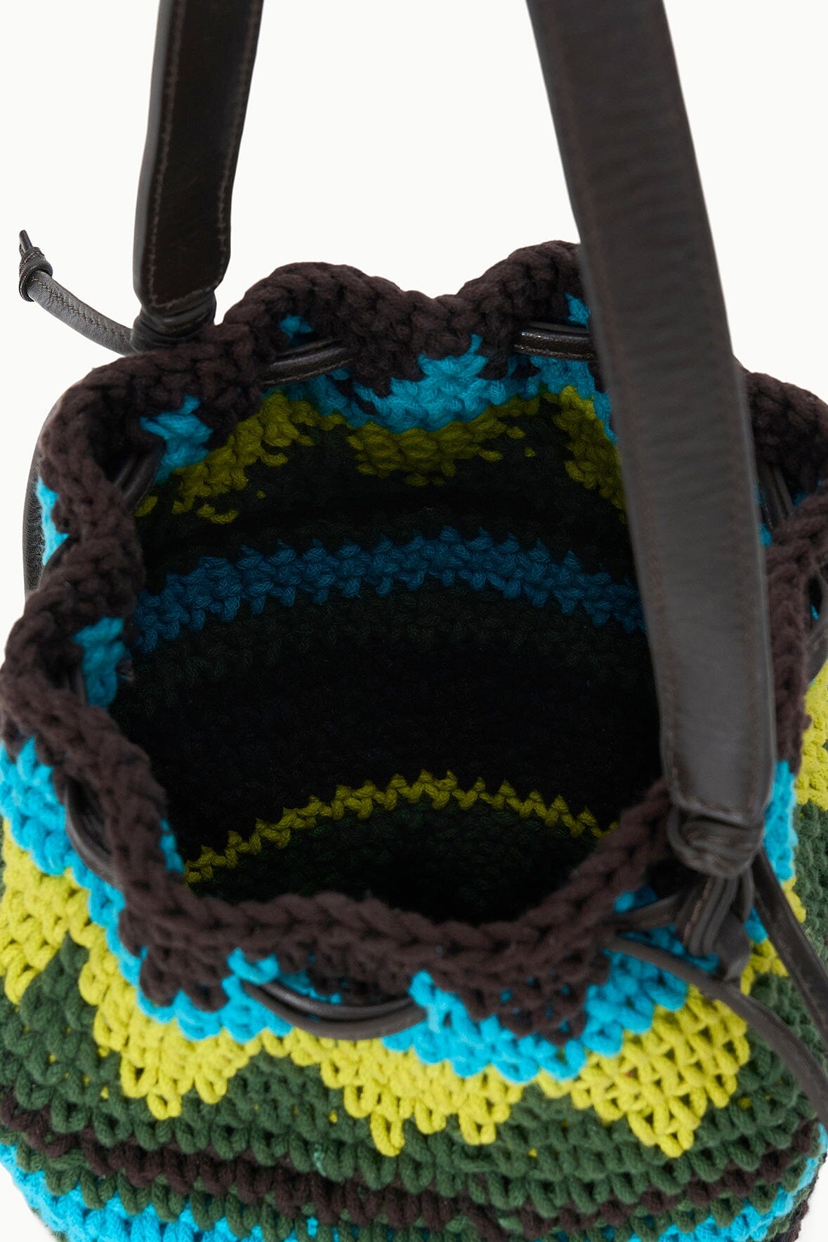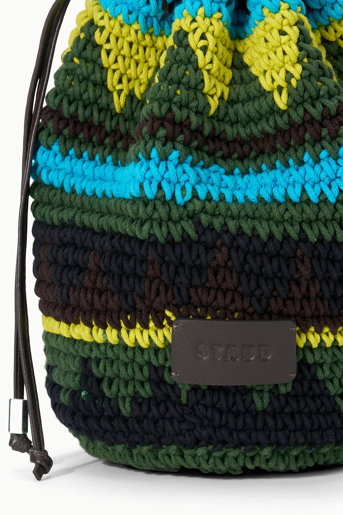 Playful crochet drawstring bag featuring a striped hacky sack pattern. Choose between a compact handheld strap or the longer knotted strap for crossbody styling. Nostalgic charm meets modern versatility in this fun, functional piece.