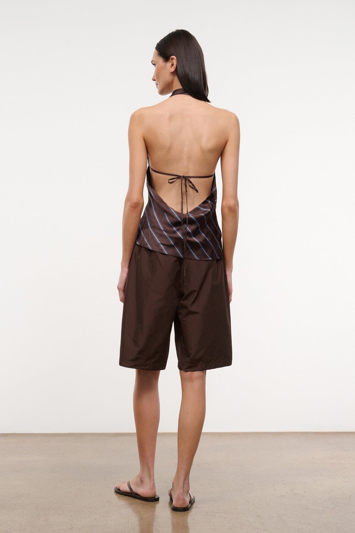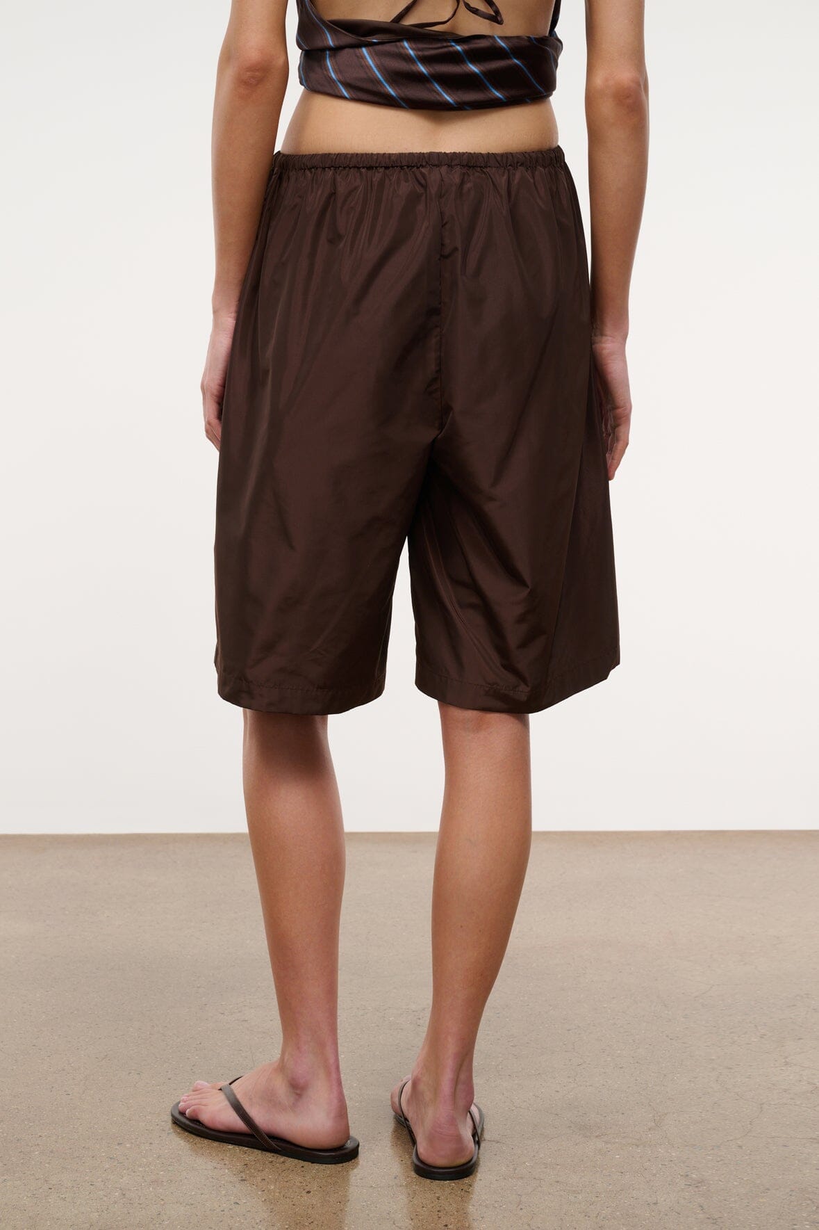 The Mateo Bermuda Short combines relaxed wide-leg styling with structured taffeta fabric that holds its shape. An adjustable tie waistband ensures a custom fit, while the bermuda length offers versatile coverage.