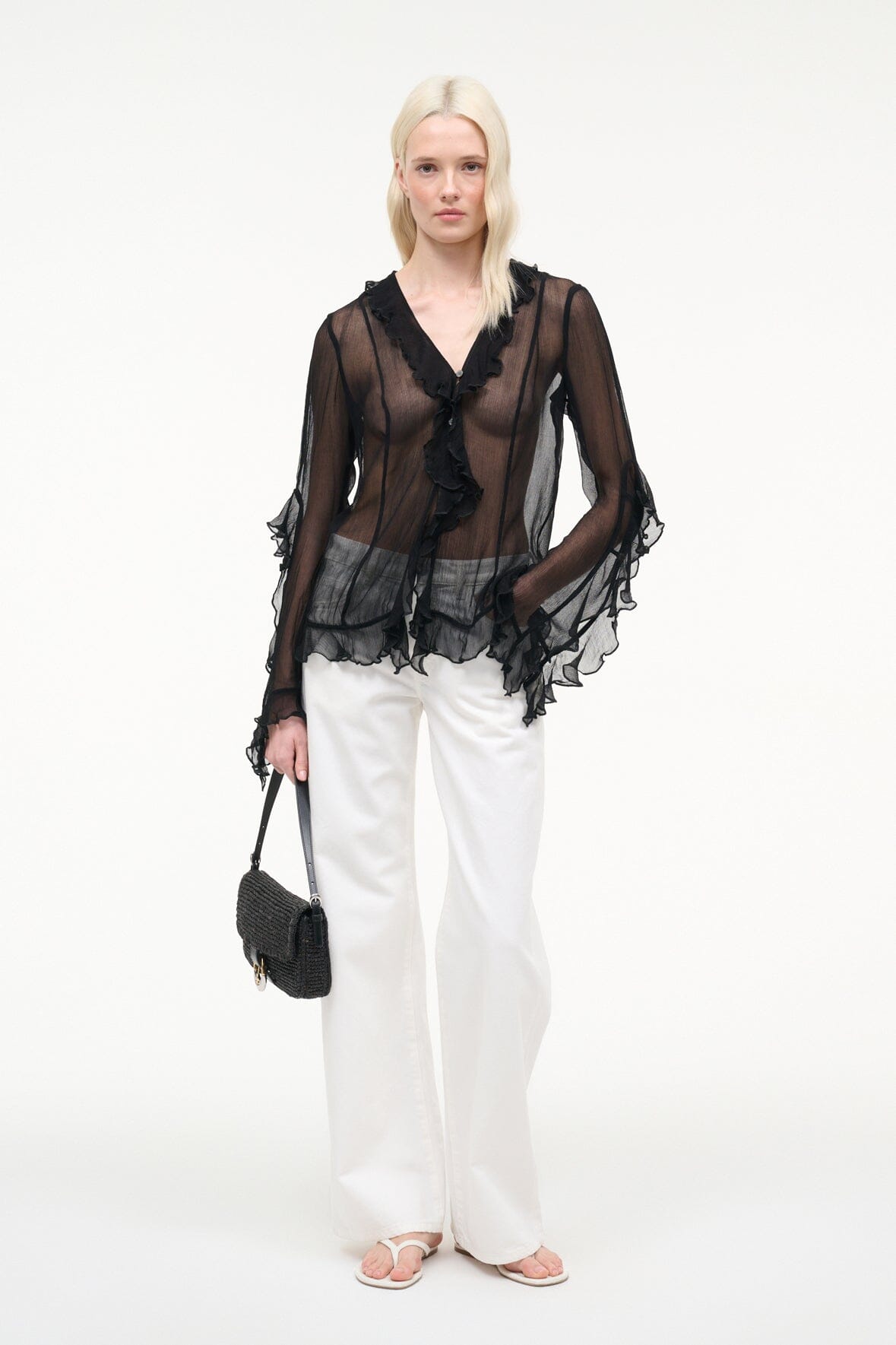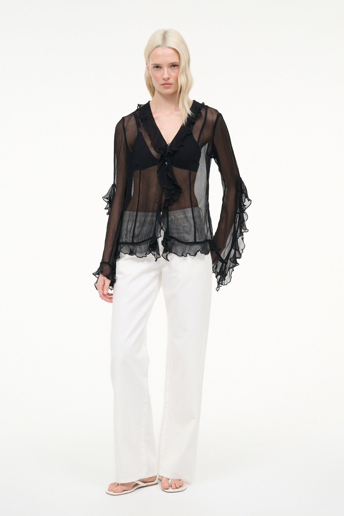 The Kellcy Top is a sheer crinkle chiffon long sleeve top featuring cascading ruffles at the front and sleeves.