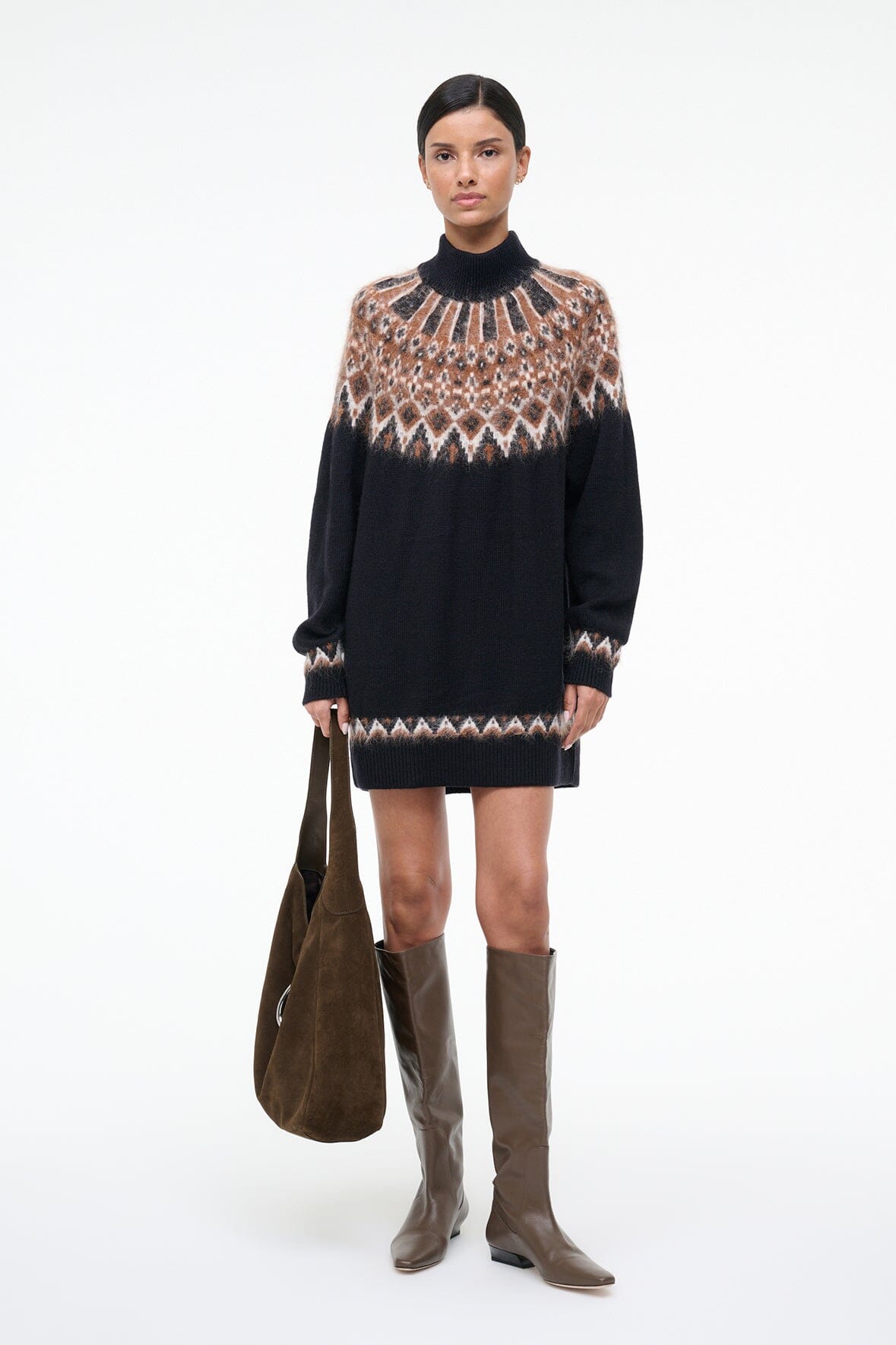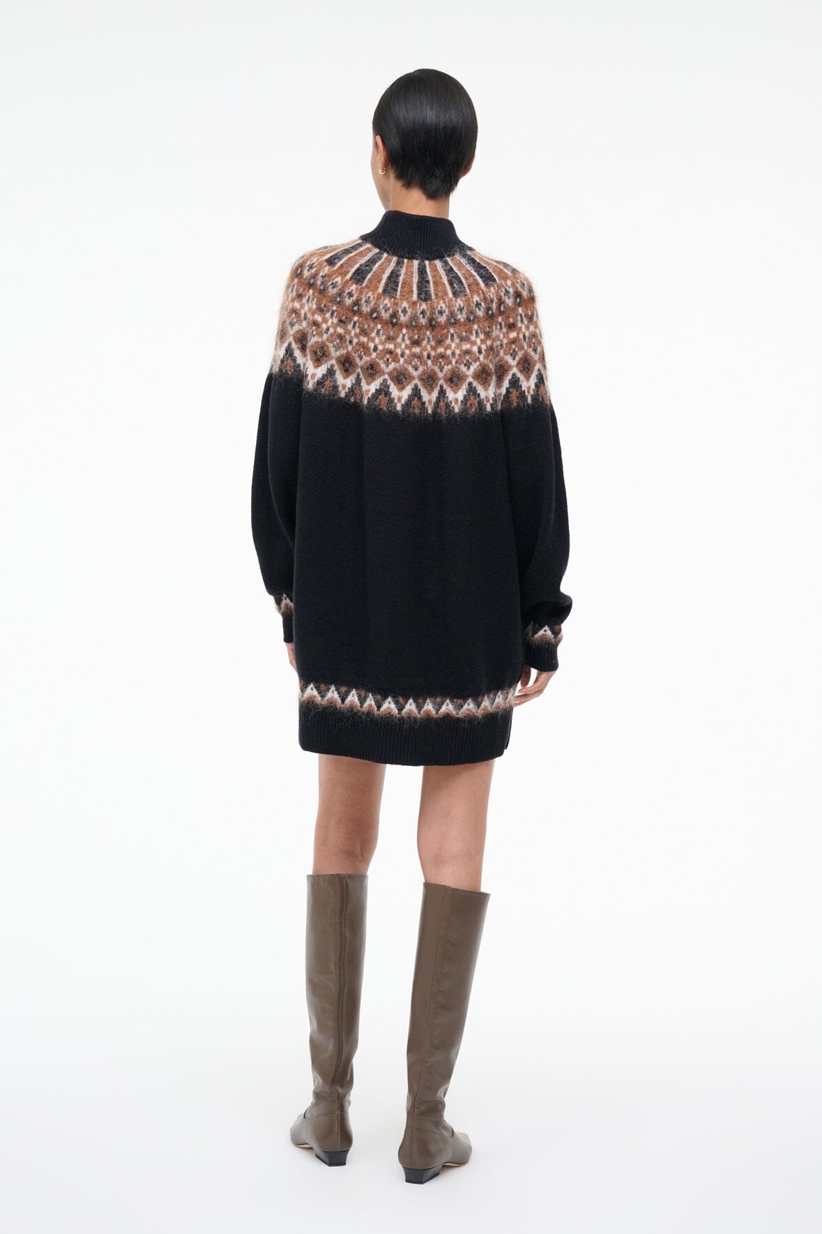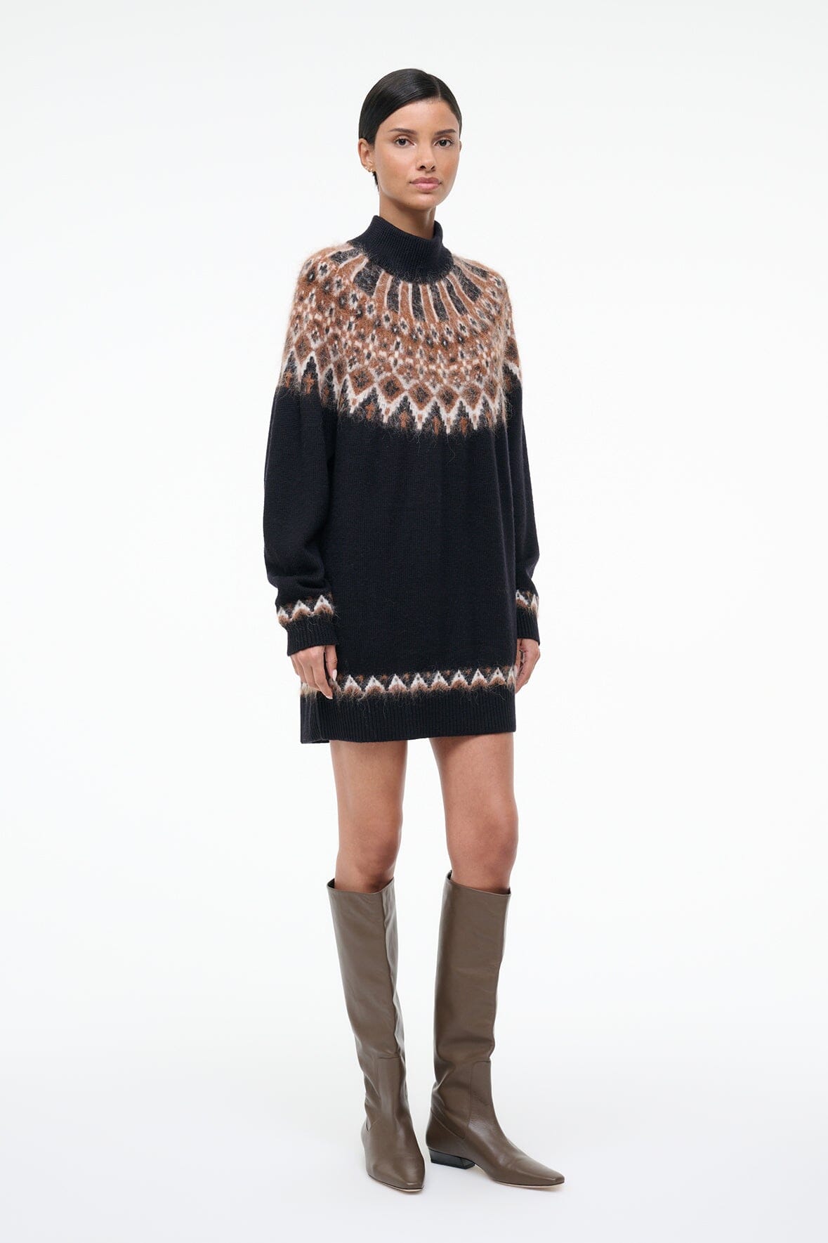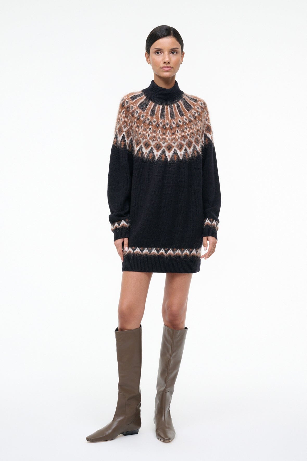 A cozy wool blend turtleneck dress, the Liza features a fairisle jacquard pattern and slightly boxy fit.