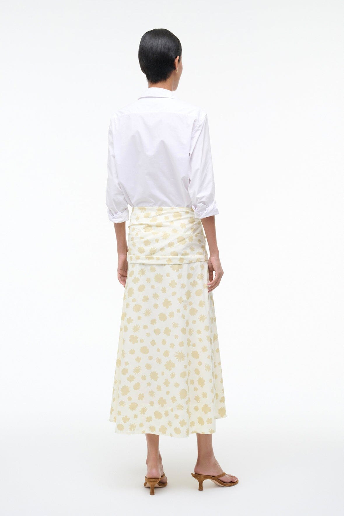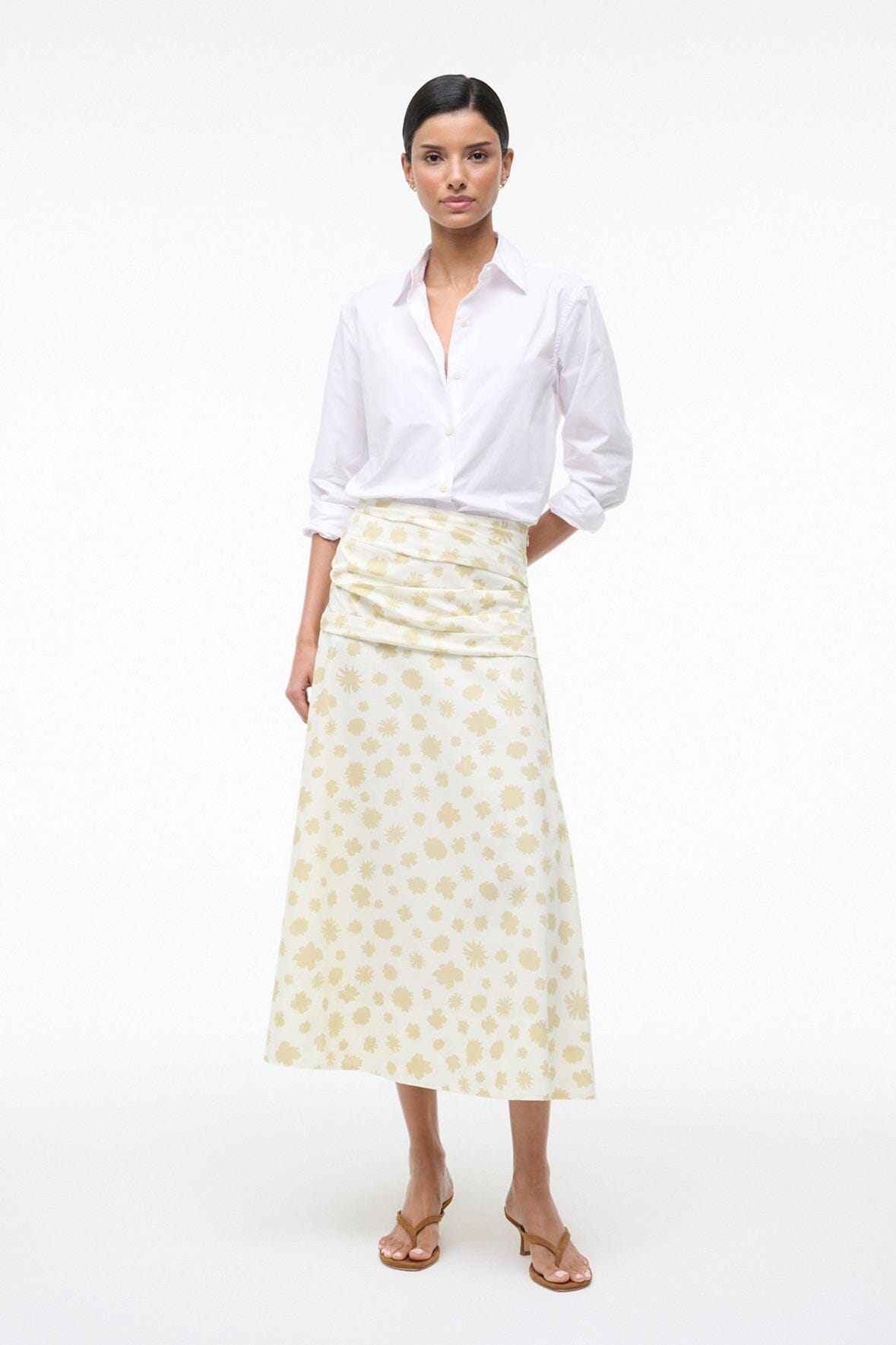 The Sol Skirt features an A-line silhouette with flattering mid-rise fit and subtle ruching details. Crafted from crisp poplin for a polished, structured look that moves with you. This style can be paired with the Lorenzo top for a matching set.