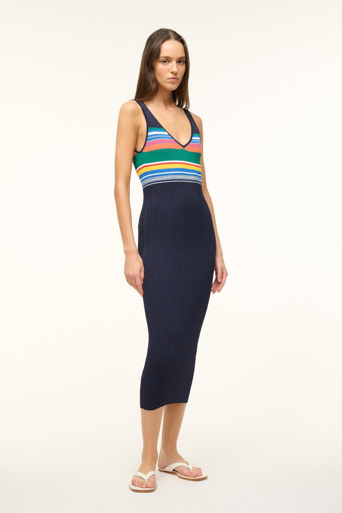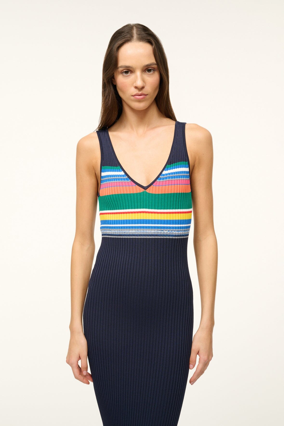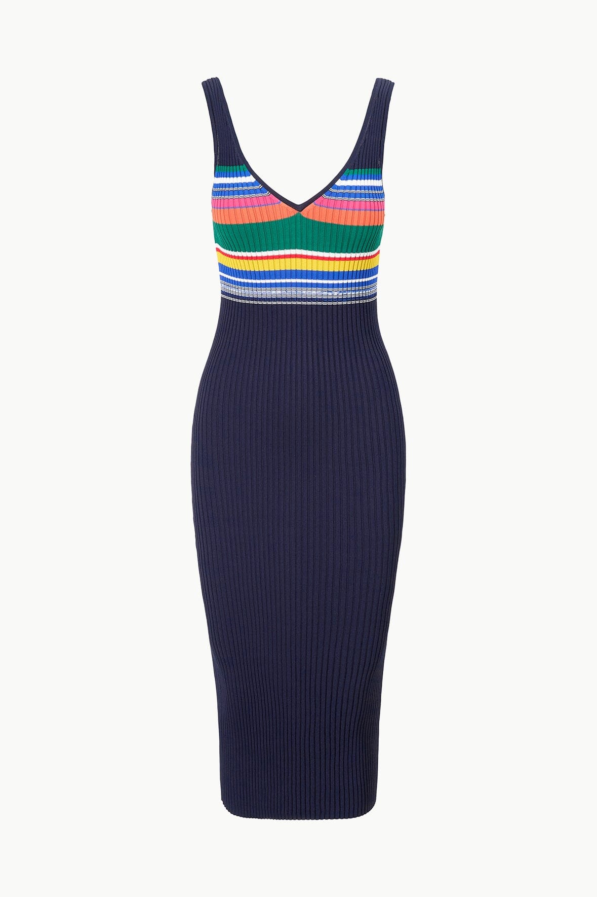 The Dana Dress in a new color block stripe pattern. A sleeveless midi dress constructed out of our signature ribbed knit fabric, this style pairs perfectly with our Shoko & Cargo cardigans.