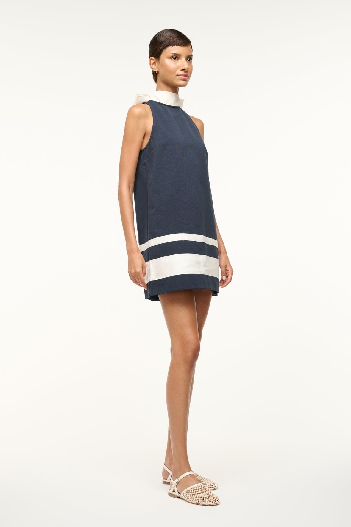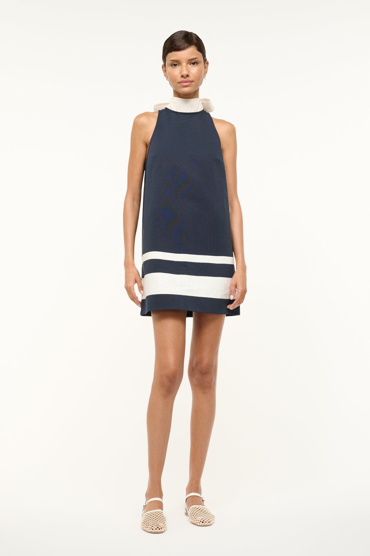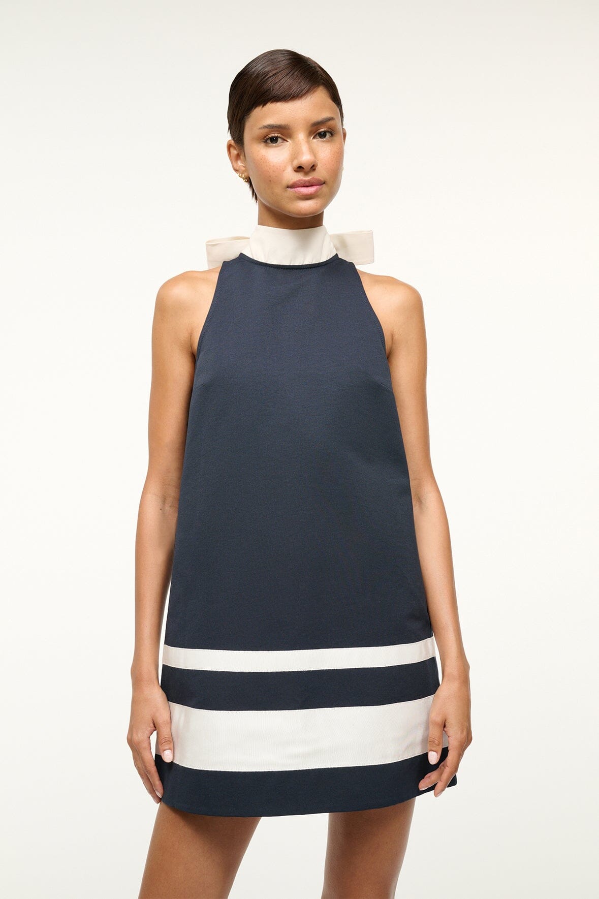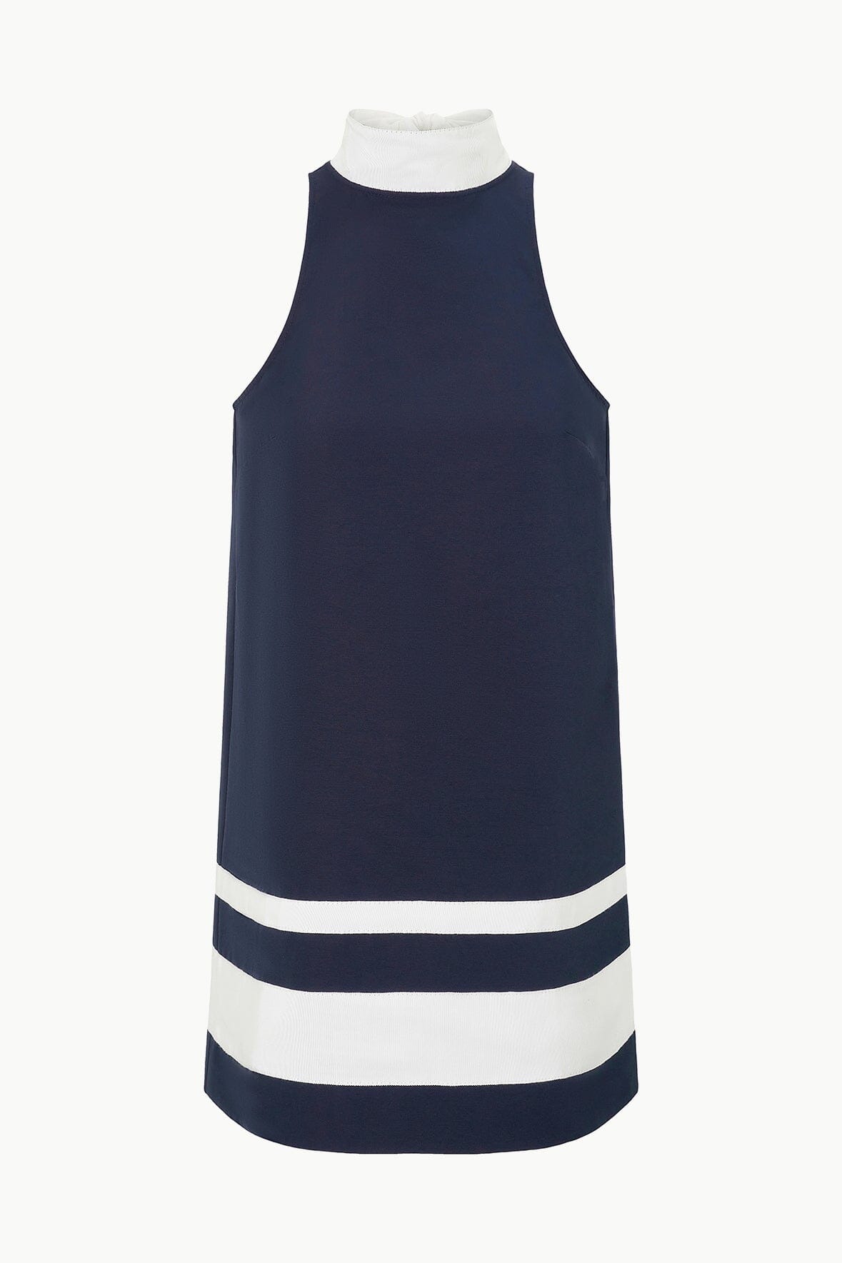 A mini shift dress made out of grosgrain, the Finn features a self-tie bow at the neck and contrast stripe detail at the them.