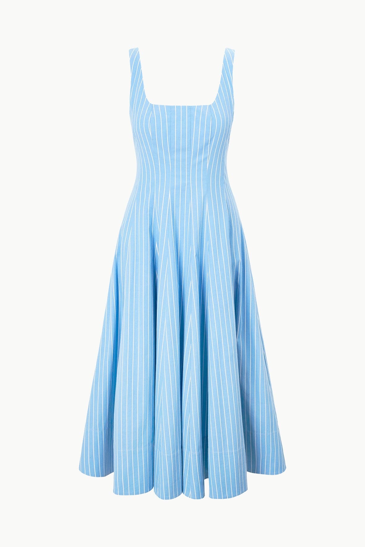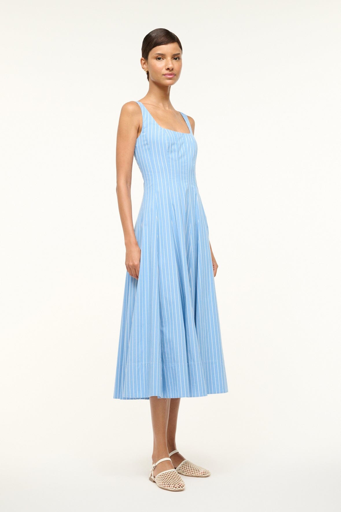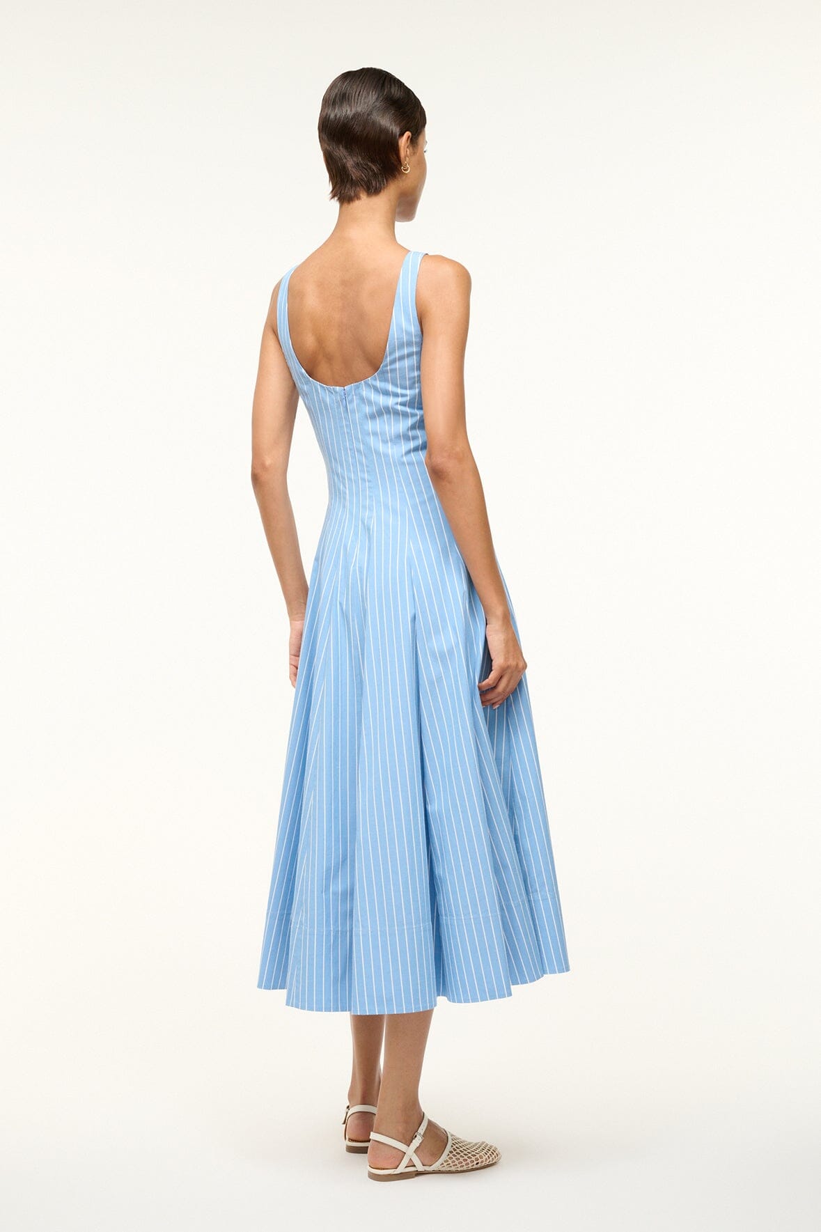 The Wells Dress features a corset-inspired paneled bodice to create a flattering, fitted shape through the waist and has a full skirt which hits just below the knee. It is made out of a lightweight cotton poplin and has a center back zipper.