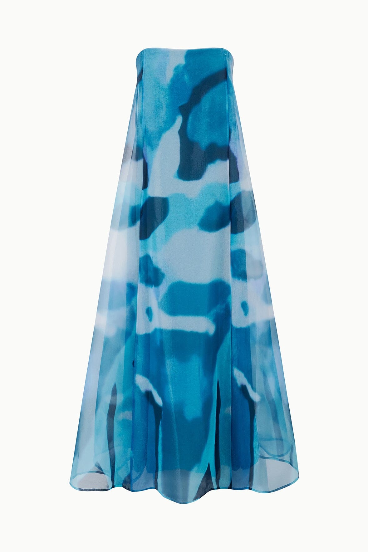 The Allyson Dress features a strapless tent silhouette with an internal corset for structured support. Sheer overlayer drapes elegantly over a solid lining, creating dimension and movement.