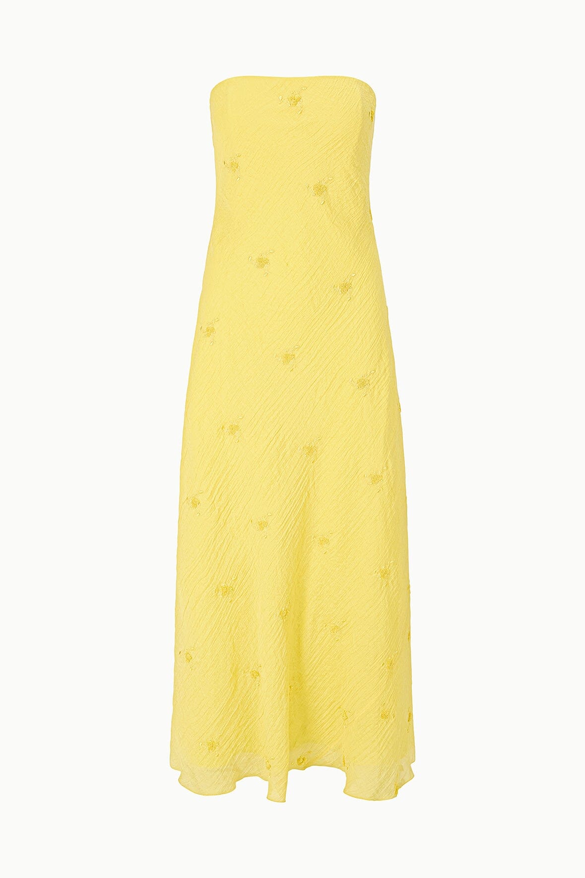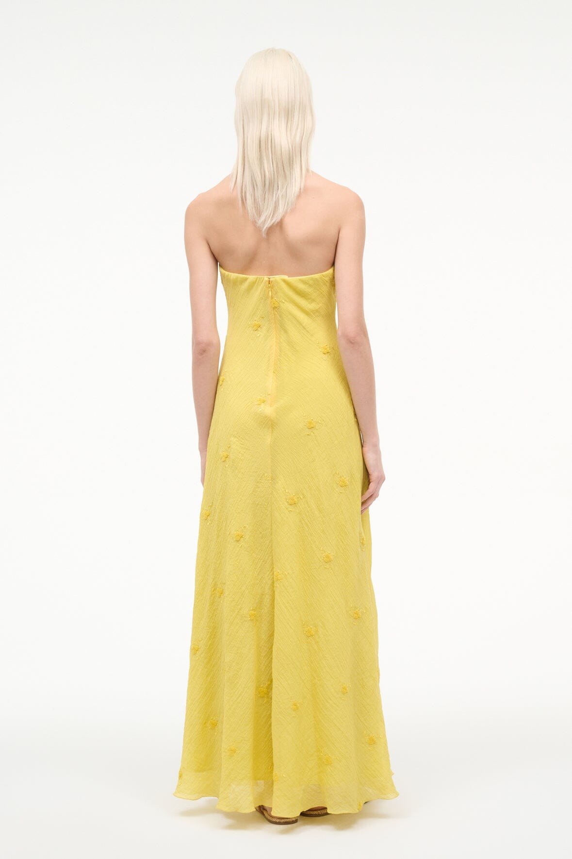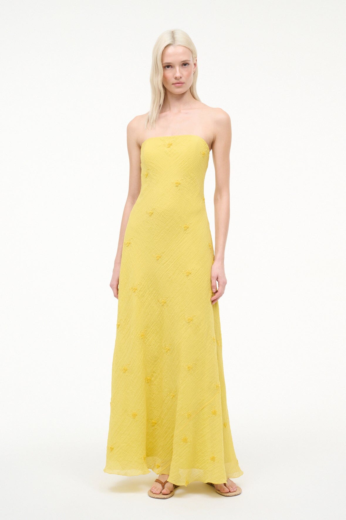 The Cassie is a strapless maxi length dress with an interior corset and a-line skirt.