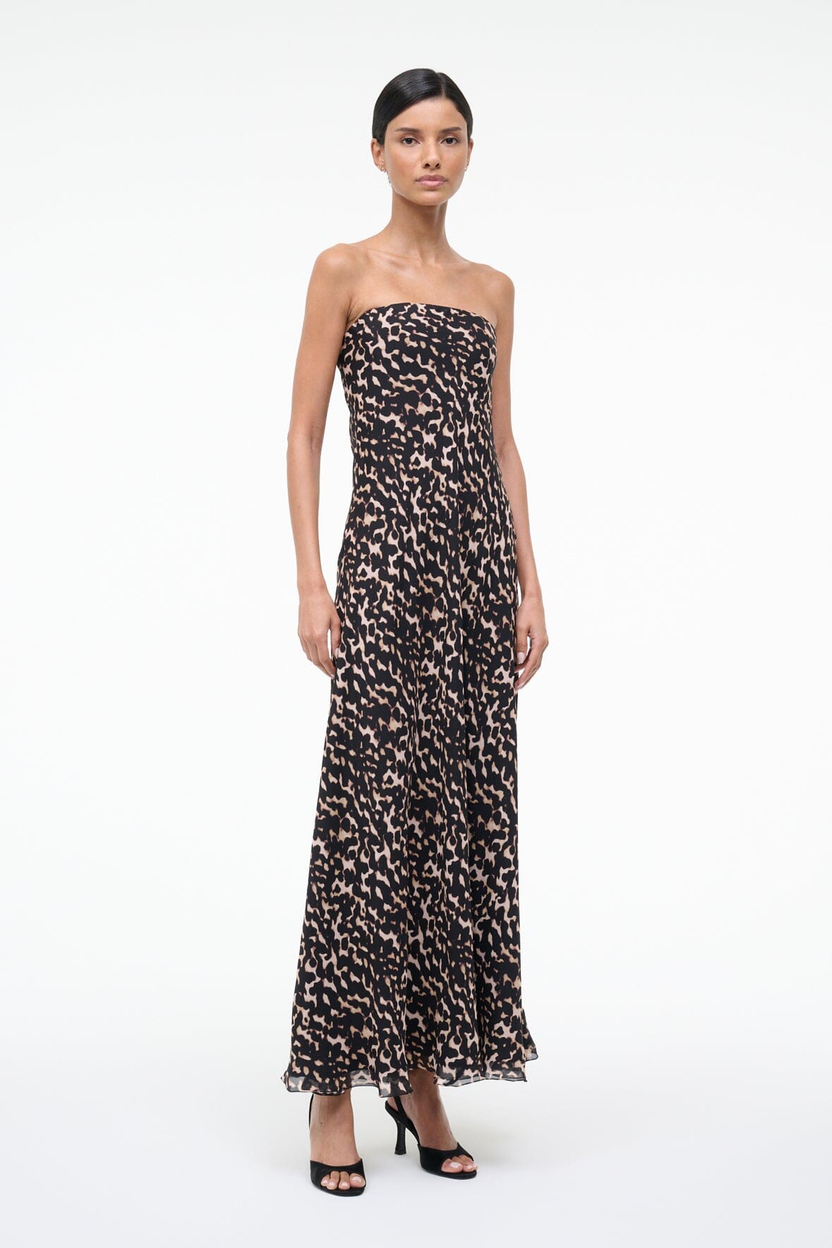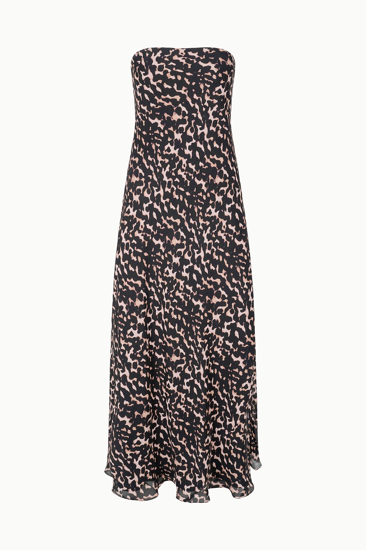 The Cassie Silk Dress features a strapless silhouette with an interior corset for support and a flattering A-line skirt. Crafted in silk with a subtle light tortoise pattern, this versatile maxi dress transitions effortlessly from day to night—dress it down with flats or up with heels.