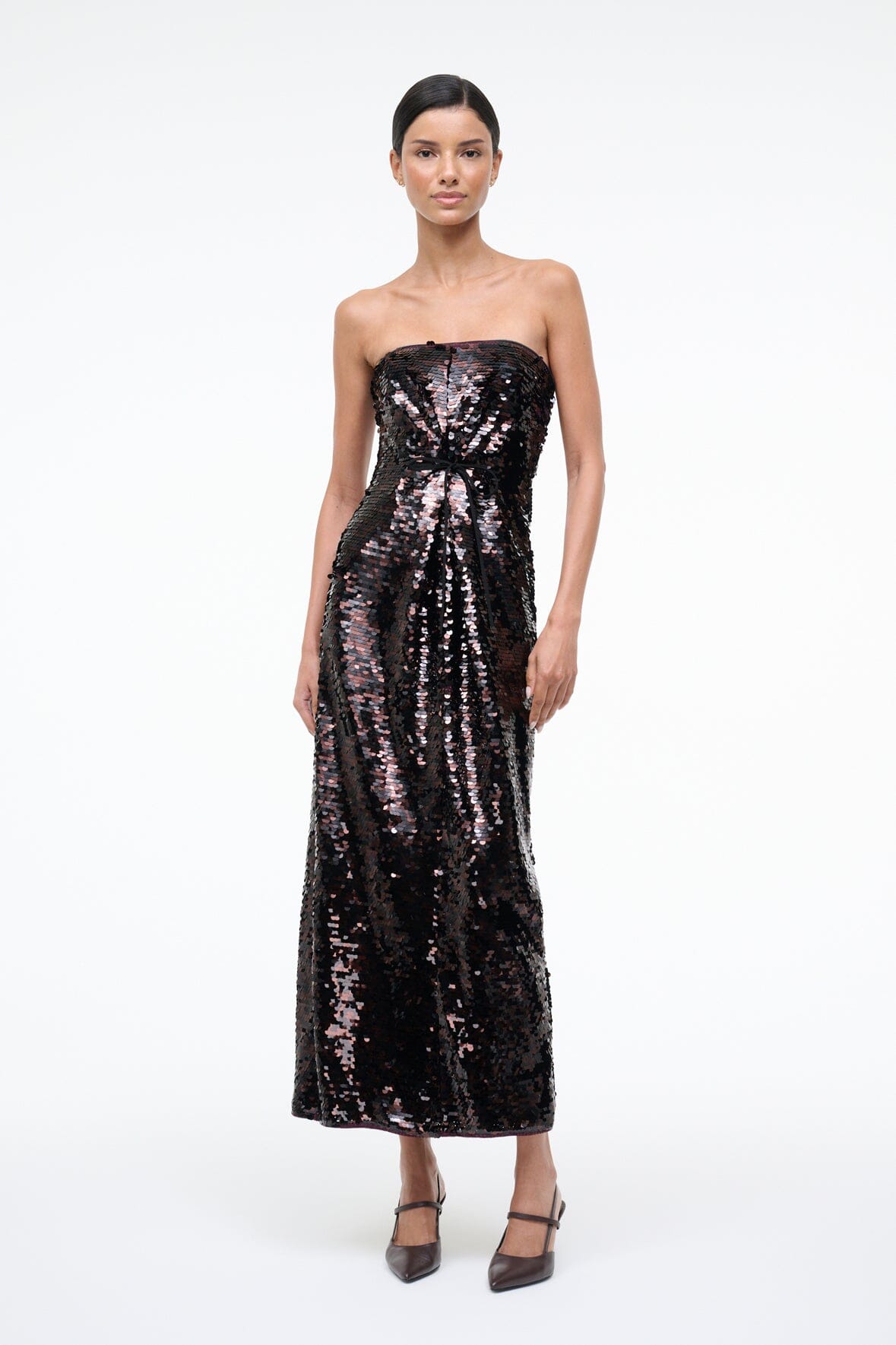Inspired by or best-selling Casey Dress, the Cece Dress is a fully sequined strapless dress with a cinched empire waist detail.