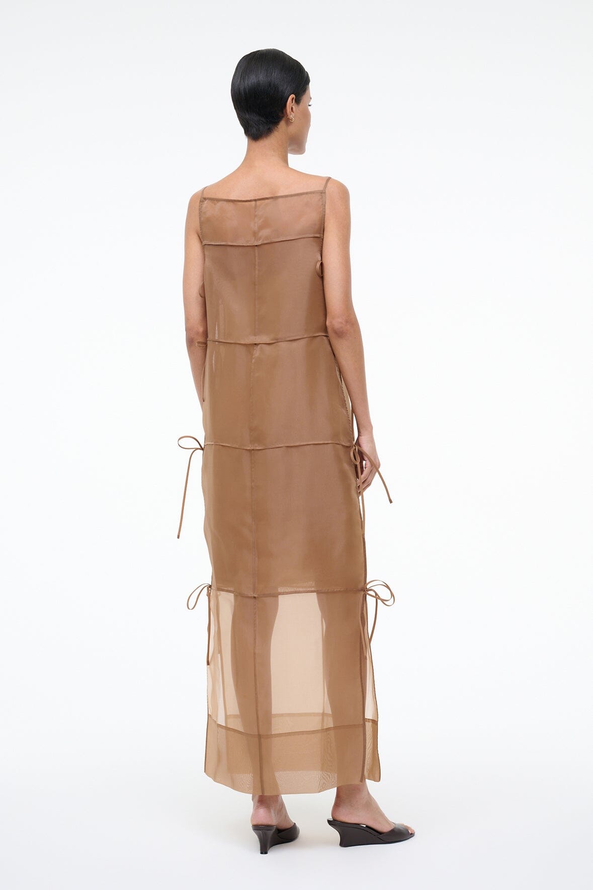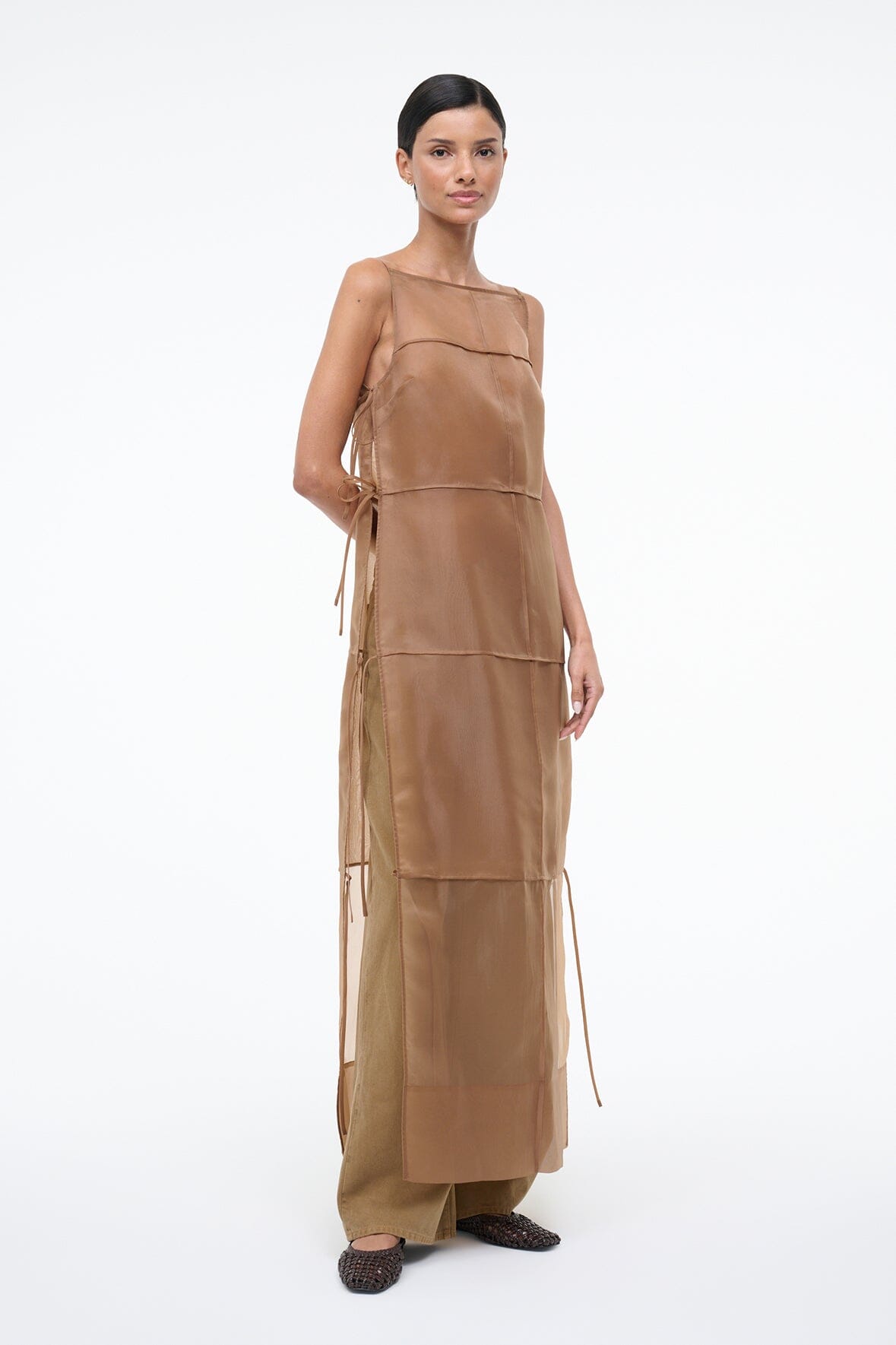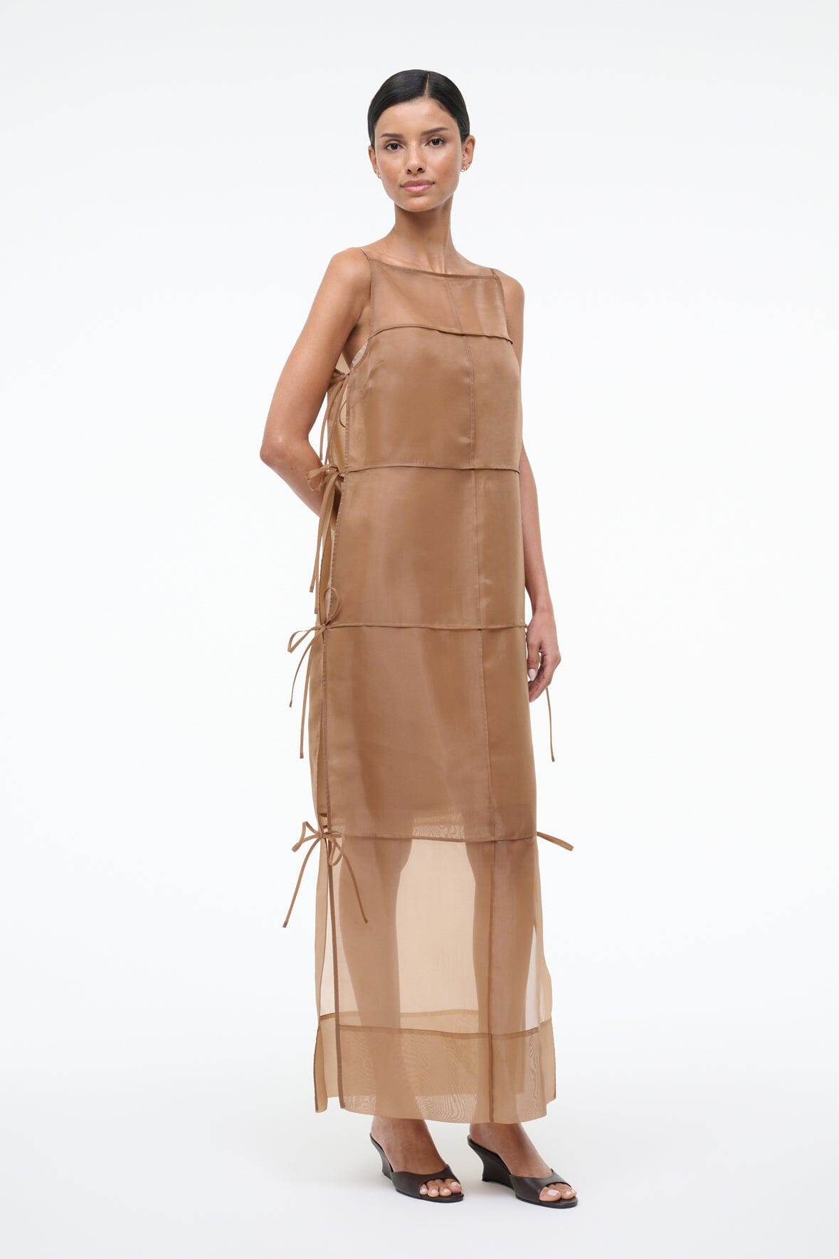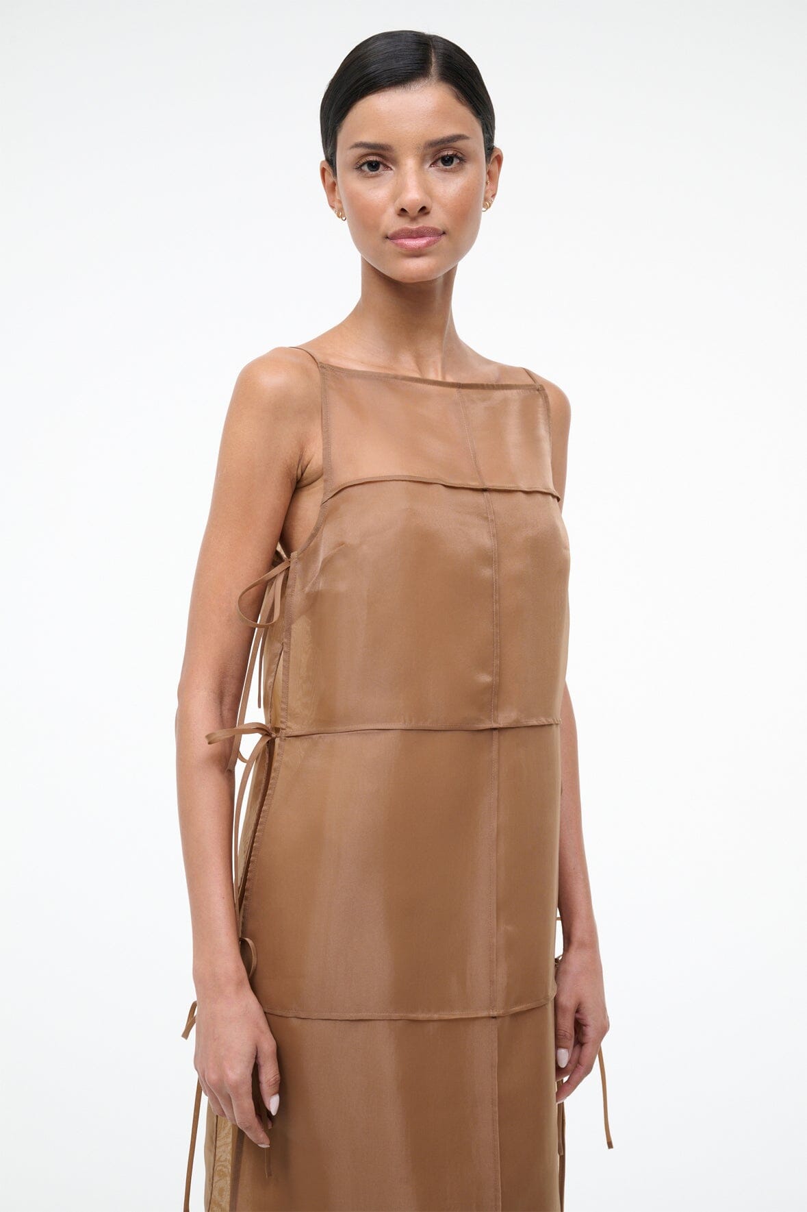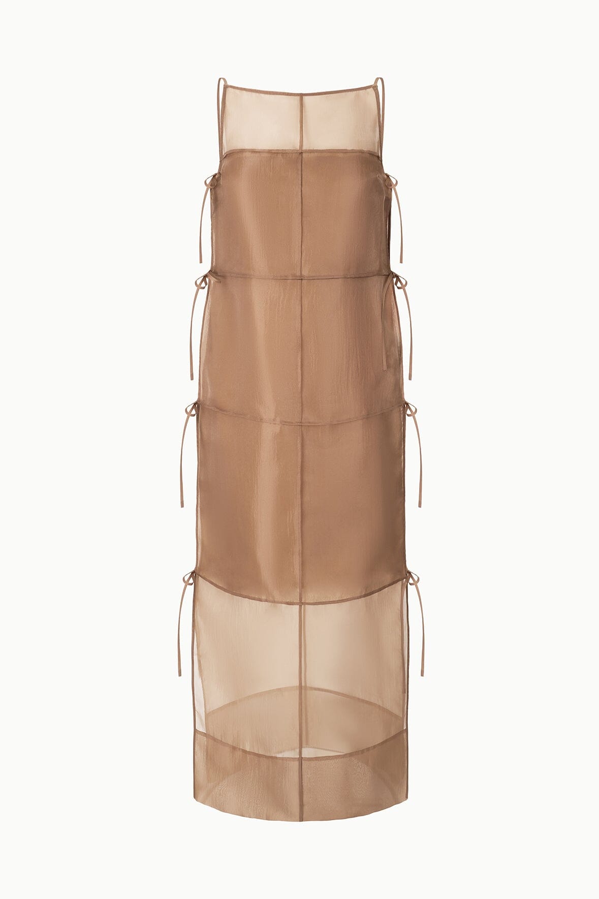 A sheer, panelled dress crafted from floaty organza, the Chandler features self-tie side details and a square neckline. This versatile style can be worn as a long sheer tunic or as a statement dress, and includes a removable strapless slip for additional coverage.