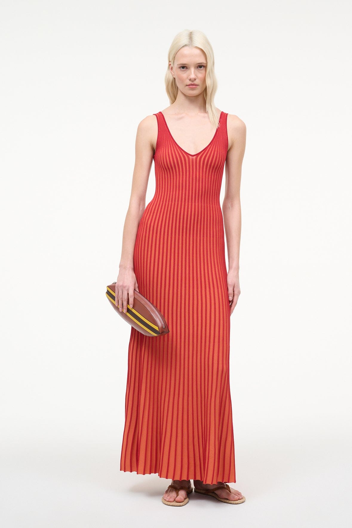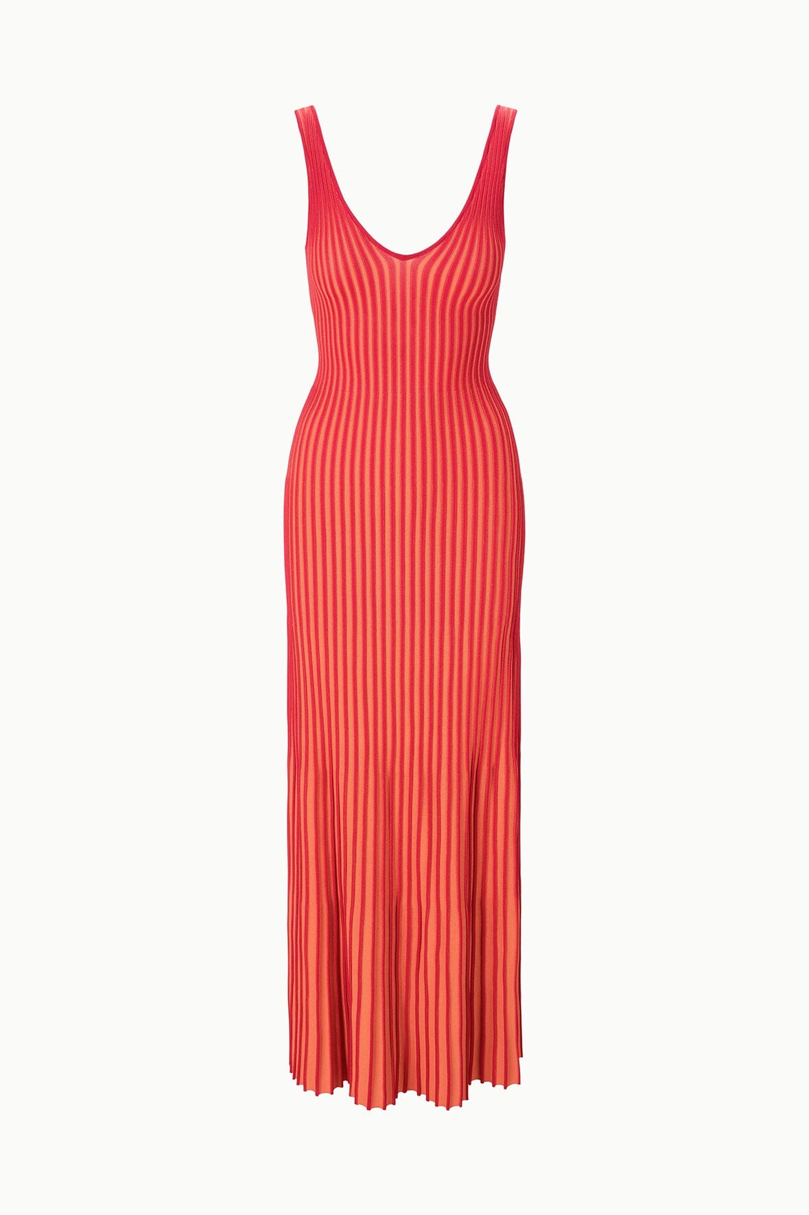 A sleeveless, maxi length dress made out of a flattering two-toned pleated rib knit fabric. This slip-on dress features a deep v neckline and slightly fluted skirt.