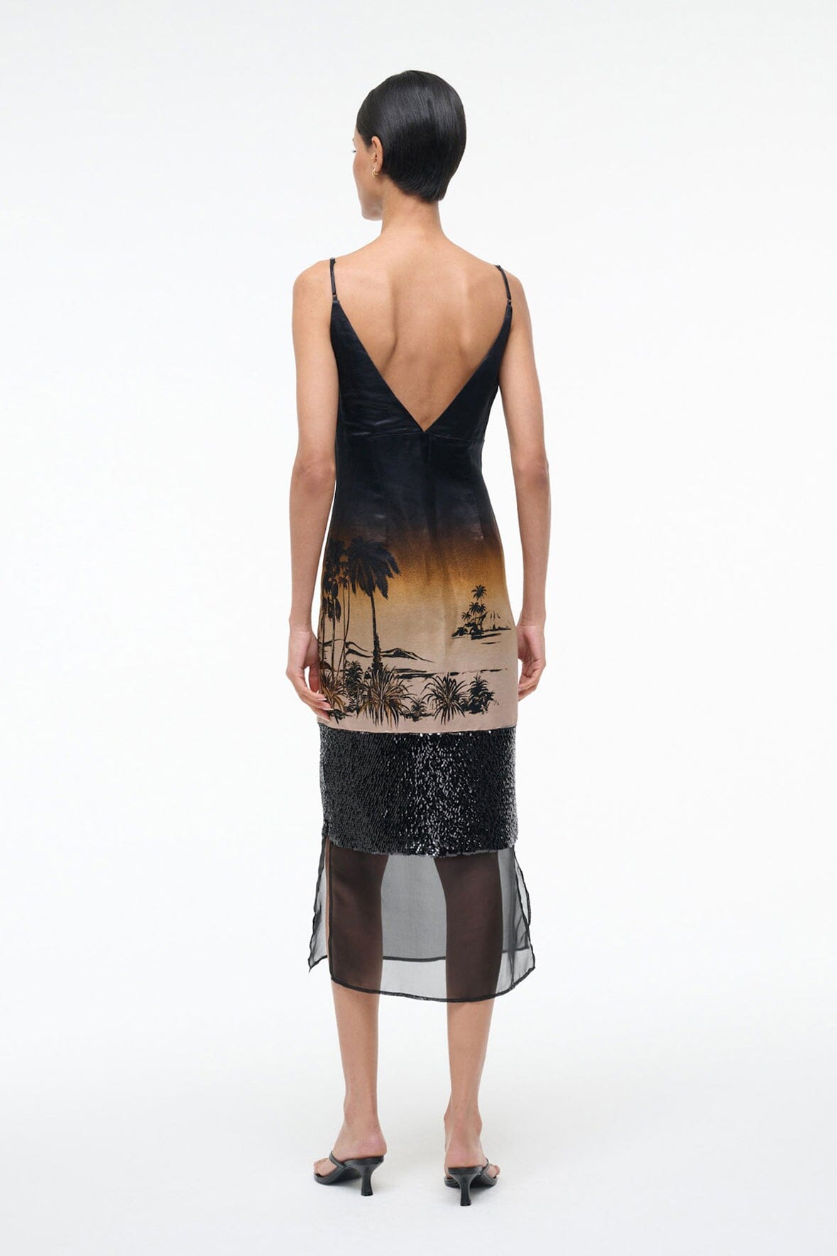 Adjustable cami sleeves, sheer hem, and side slits define The Nalu Dress silk linen dress. Sequin paneling adds glamorous shimmer for an effortless evening look.