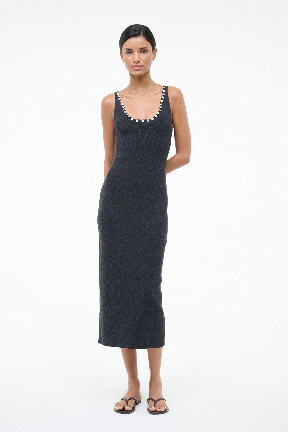 A sophisticated midi dress crafted from a compact merino wool and cotton blend for breathable comfort. The Neva Dress features an elegant neckline adorned with iridescent mother of pearl buttons that catch the light.