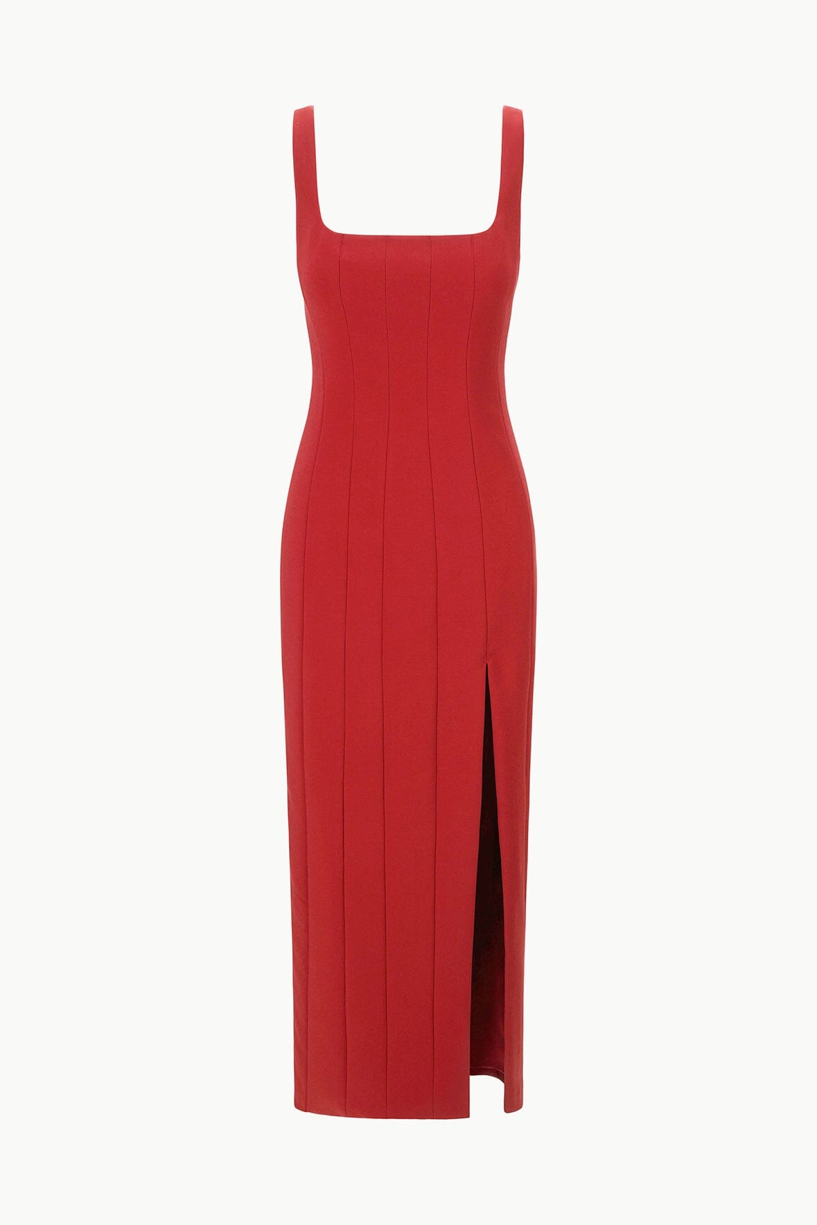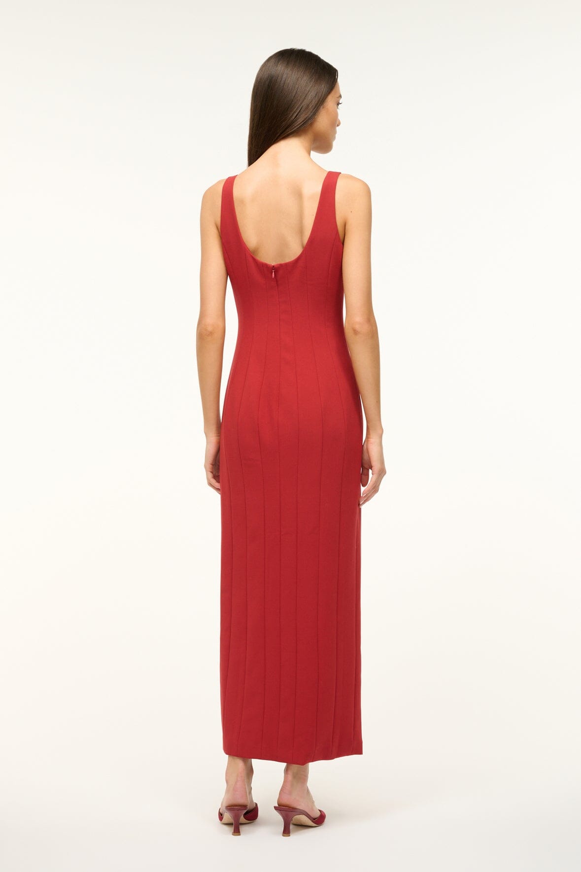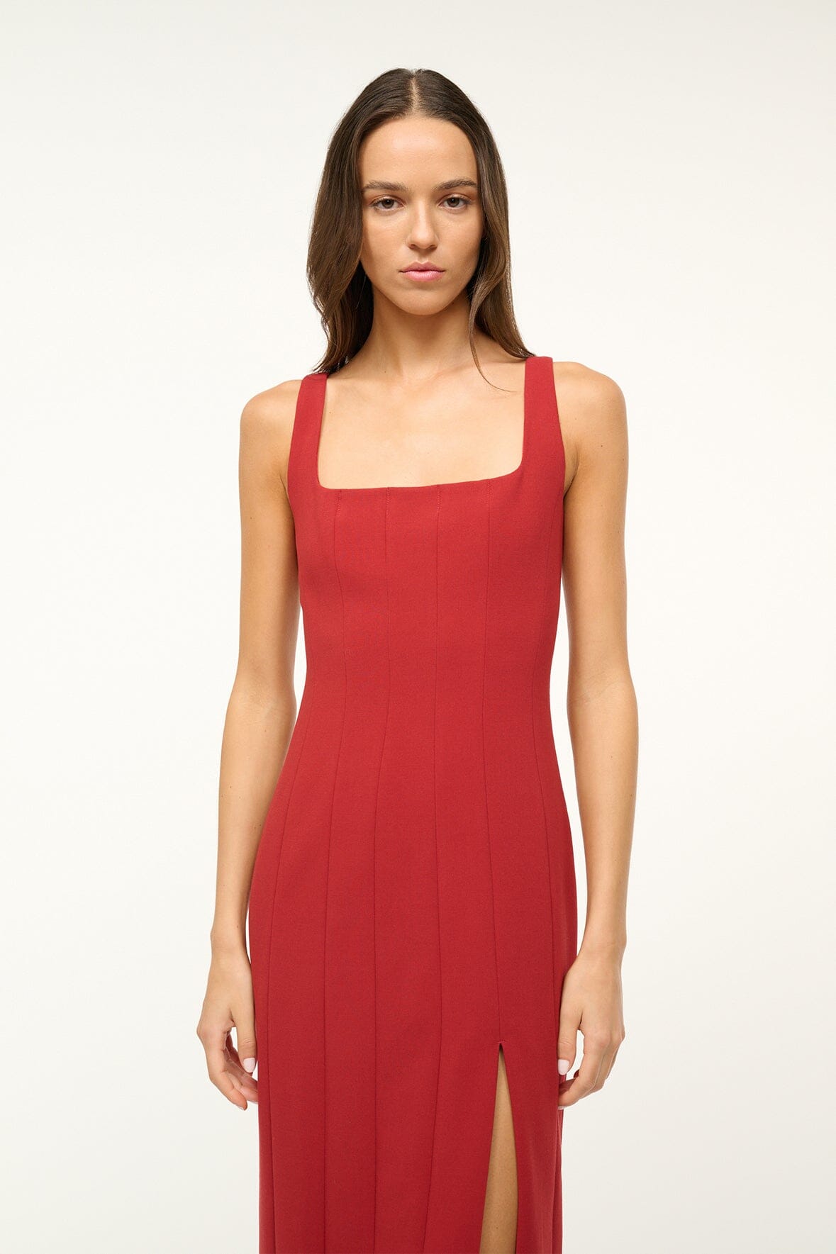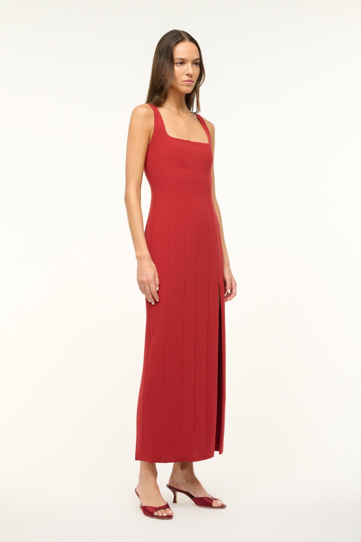 A sleeveless ankle length column dress constructed out of a structured crepe fabric. The Ankle Portrait Dress features a thigh high slit and flattering bodice seaming.