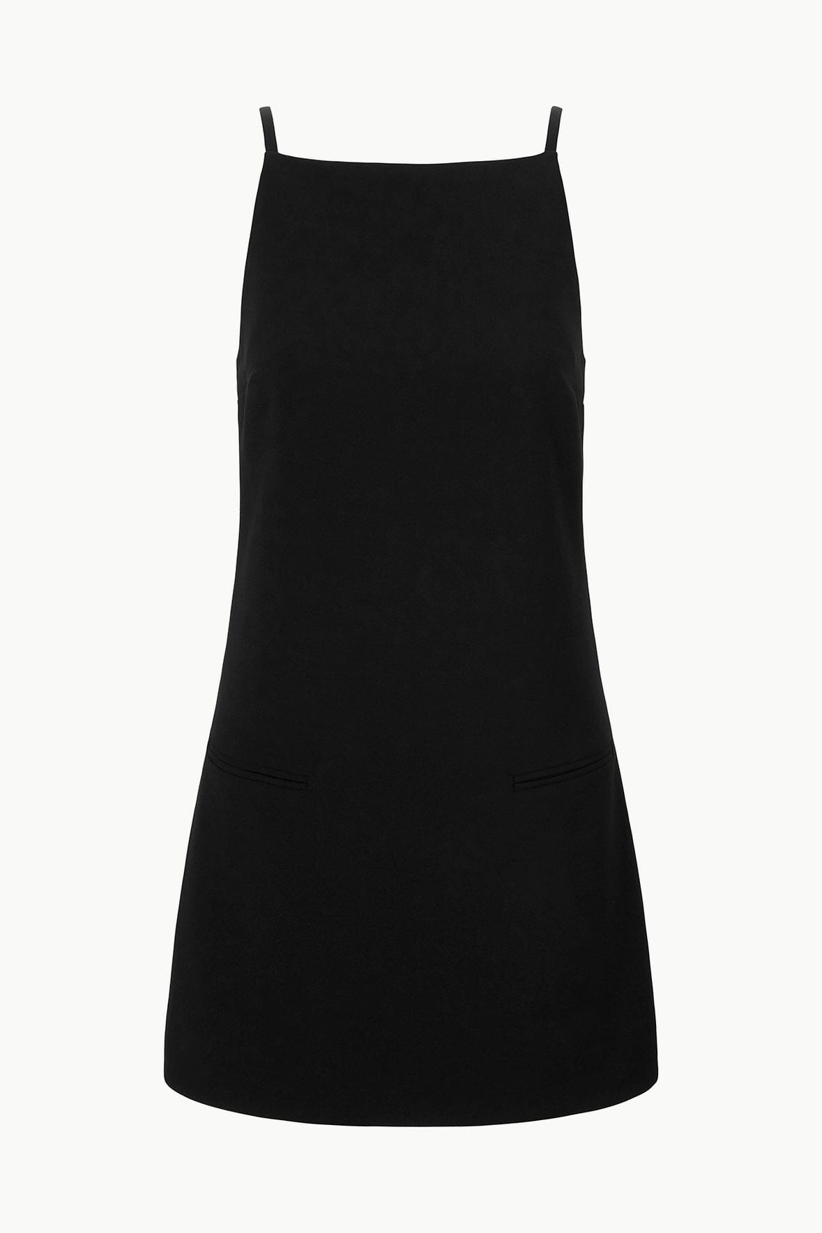A tailored mini dress with relaxed silhouette, this style features double welt pocket details at the front and a square neckline.