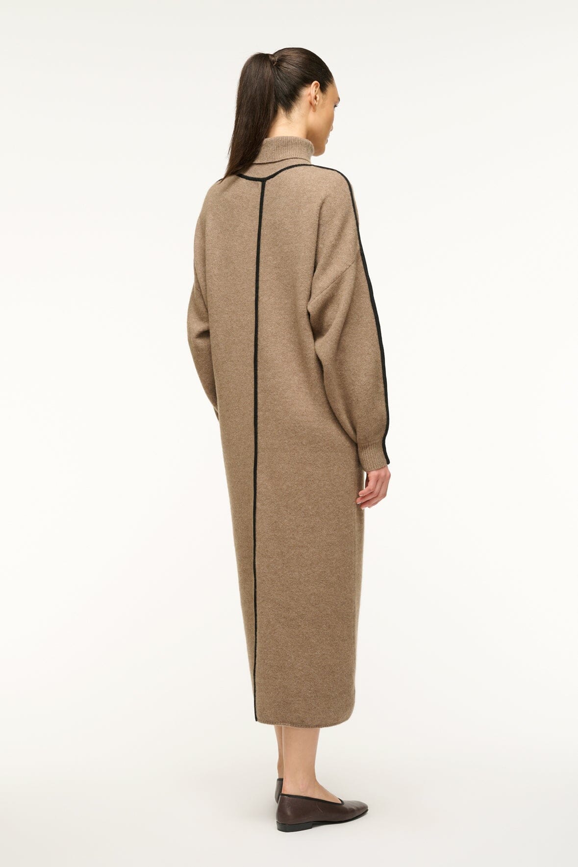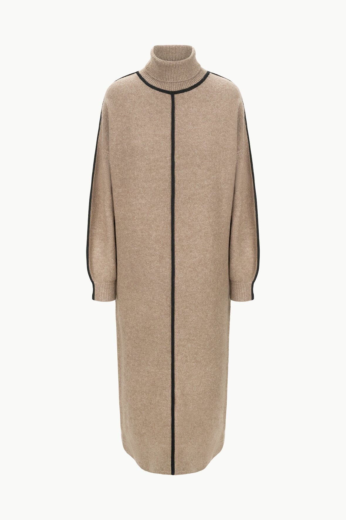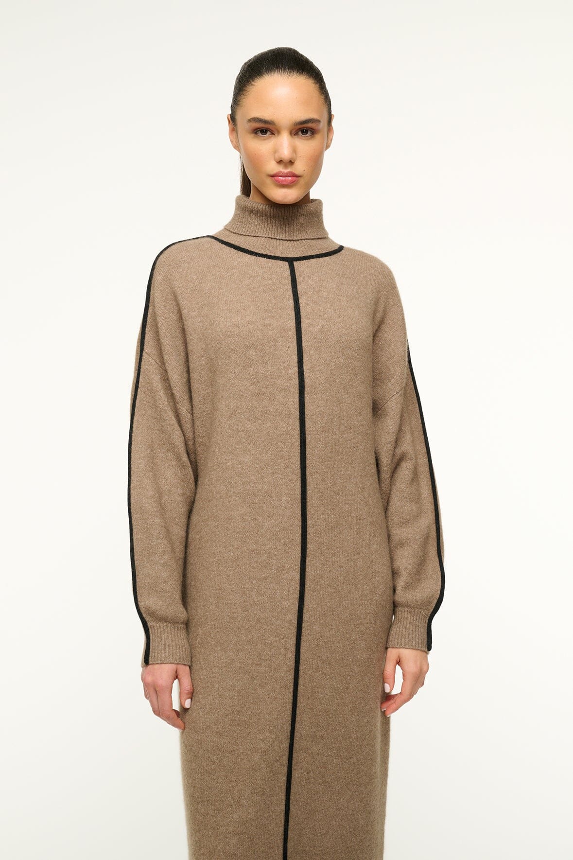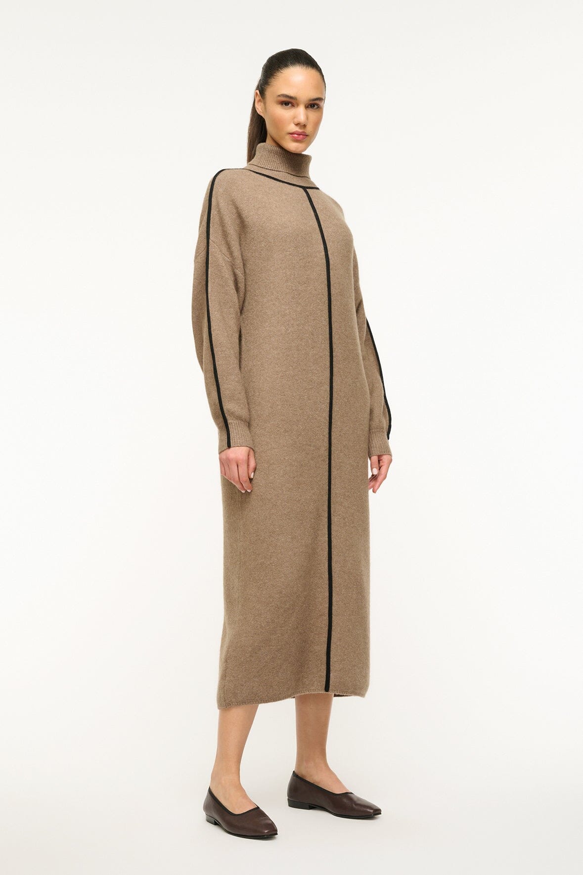 The Apres Dress is a cozy sweater dress with a turtleneck, and a contrast detail at the front, neckline, and sleeves. This style has an easy fit through the body and is a midi length.