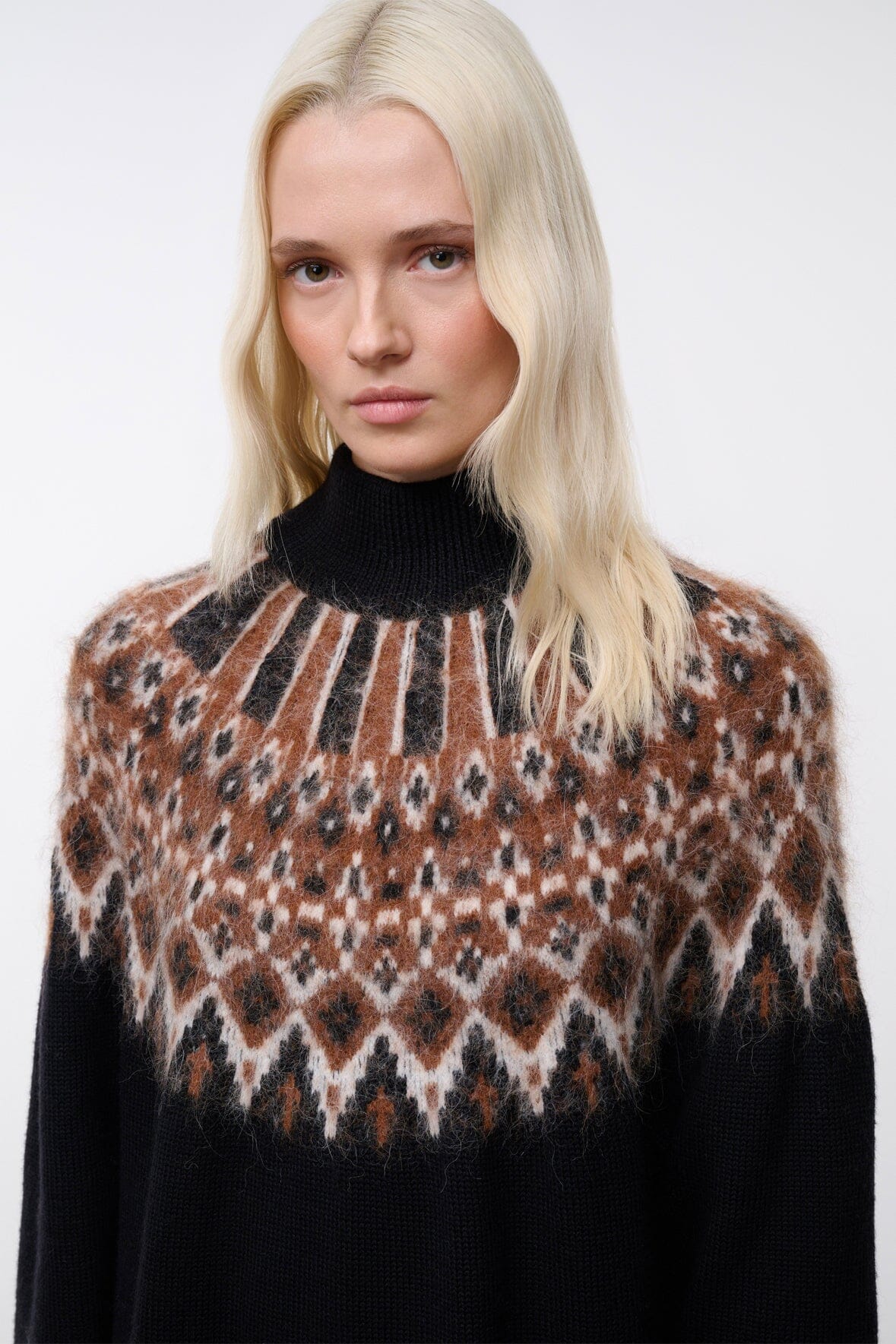 A cozy wool blend turtleneck dress, the Liza features a fairisle jacquard pattern and slightly boxy fit.