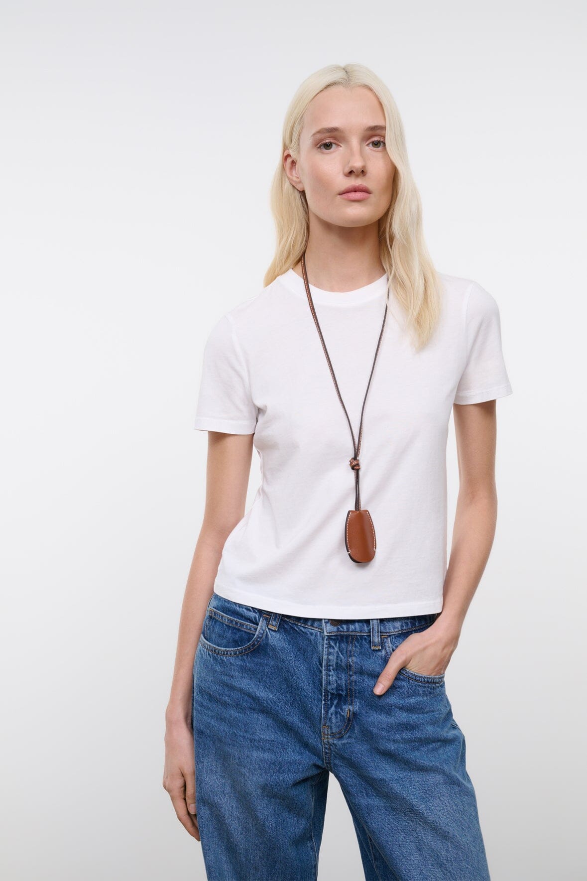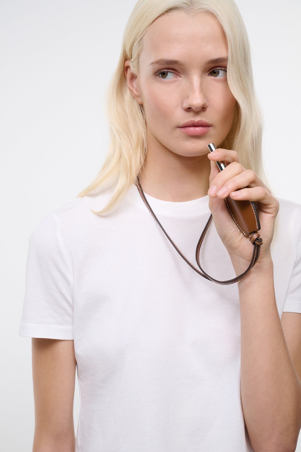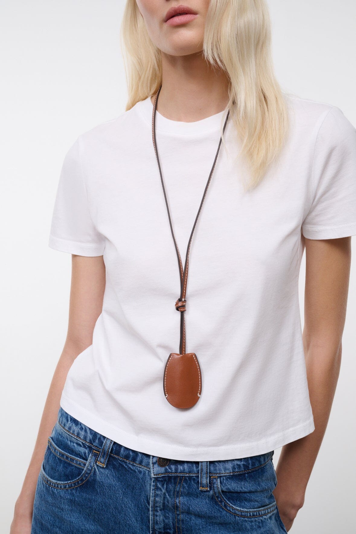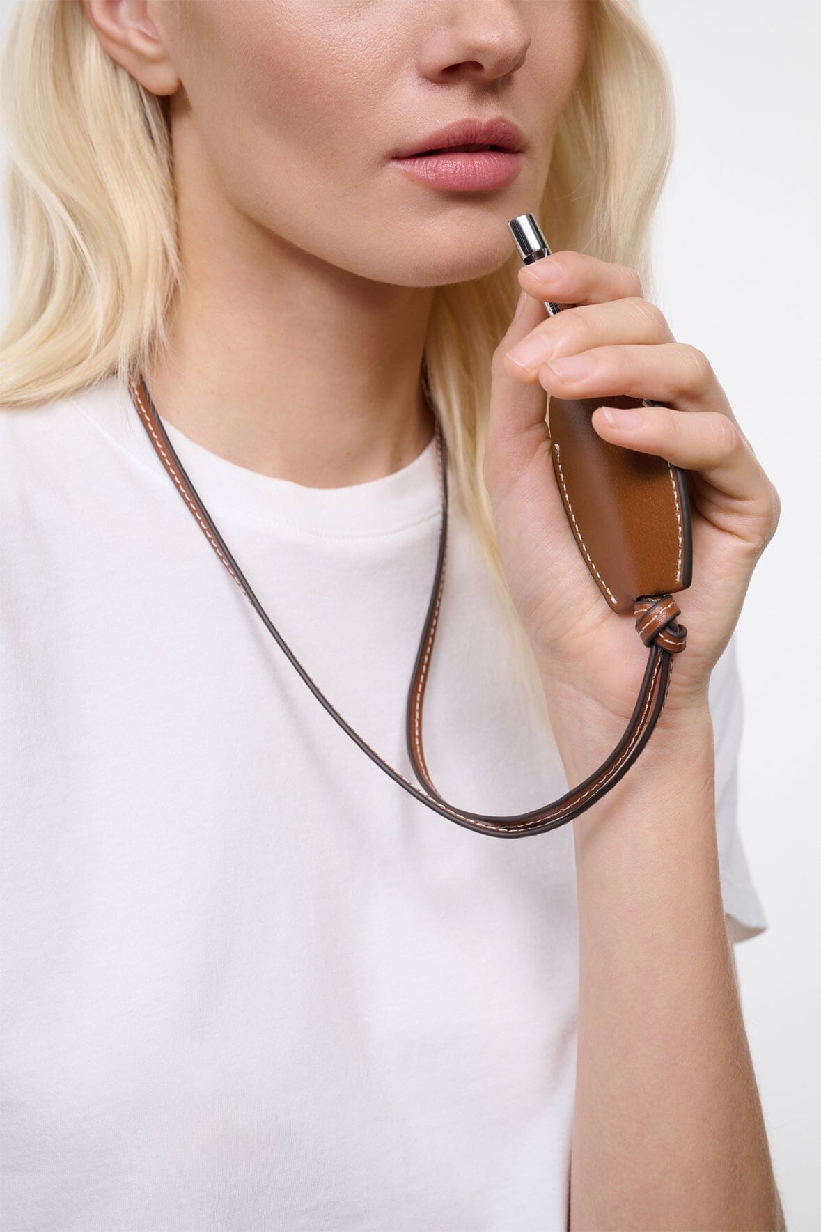 Our signature moon-shape featured in a leather keeper for a novel dog whistle. This style can be worn as a necklace or bag charm.