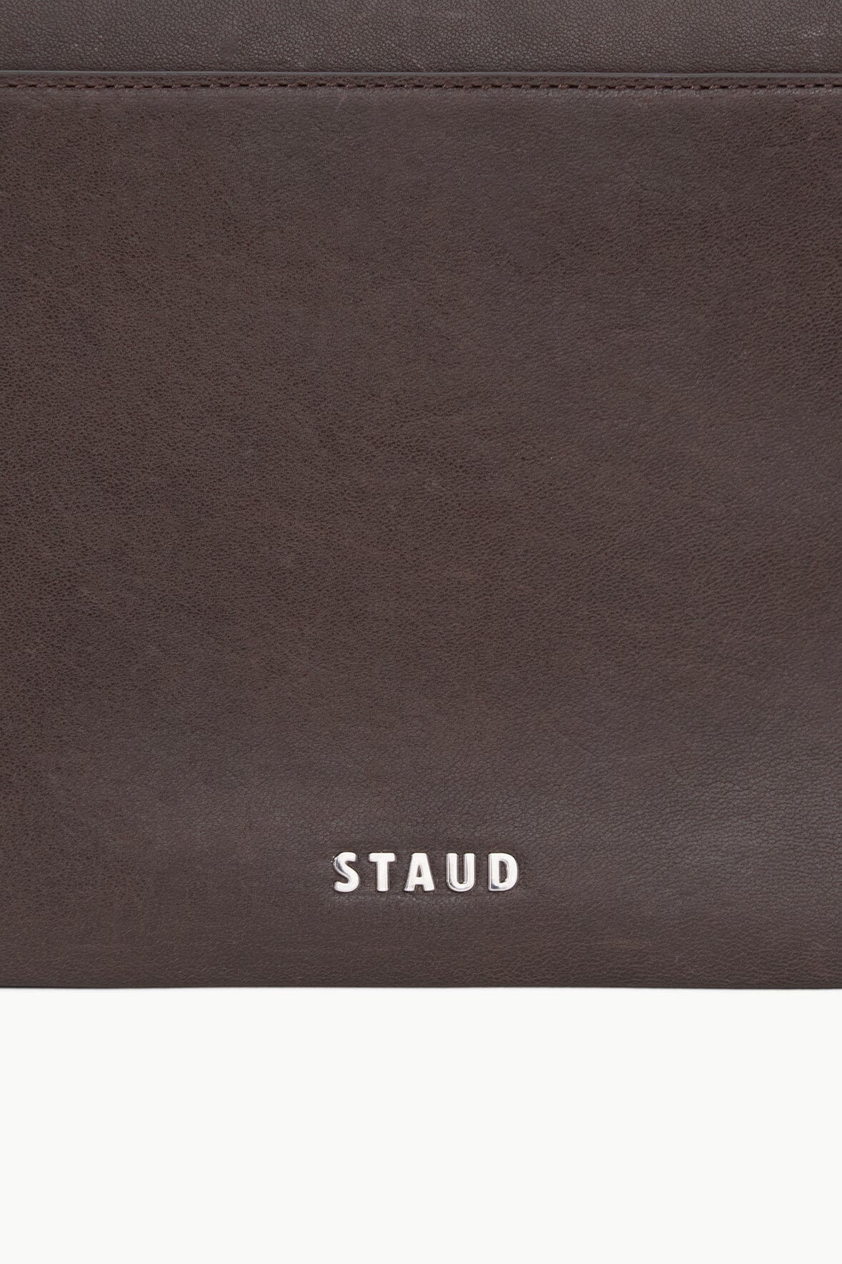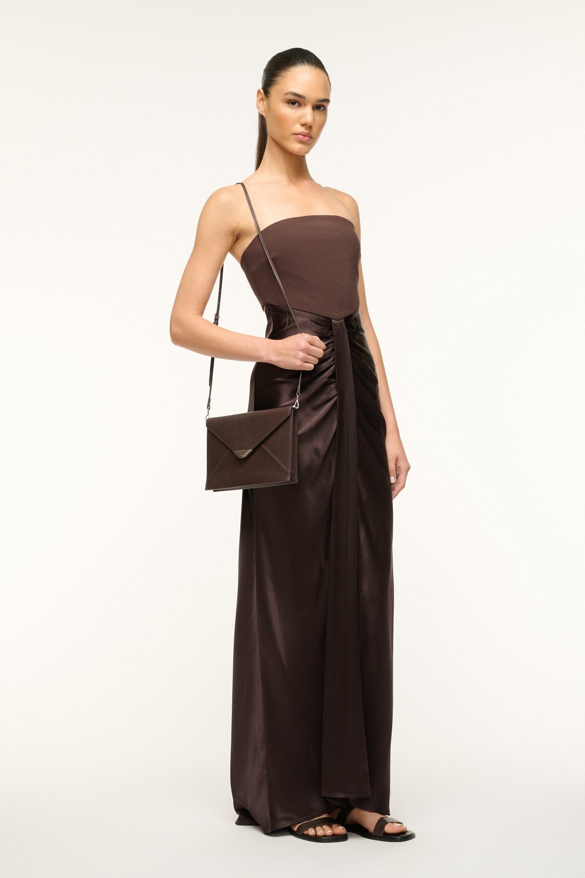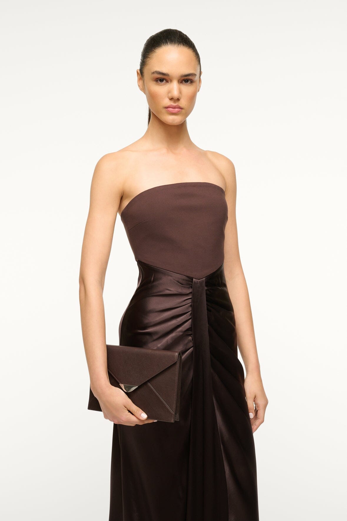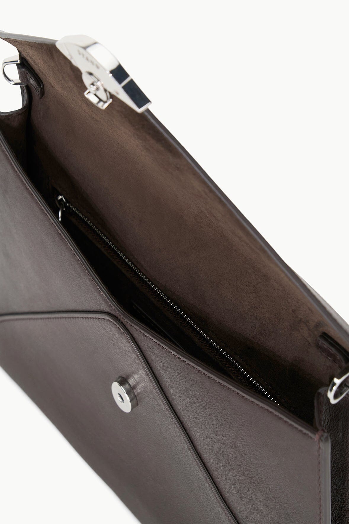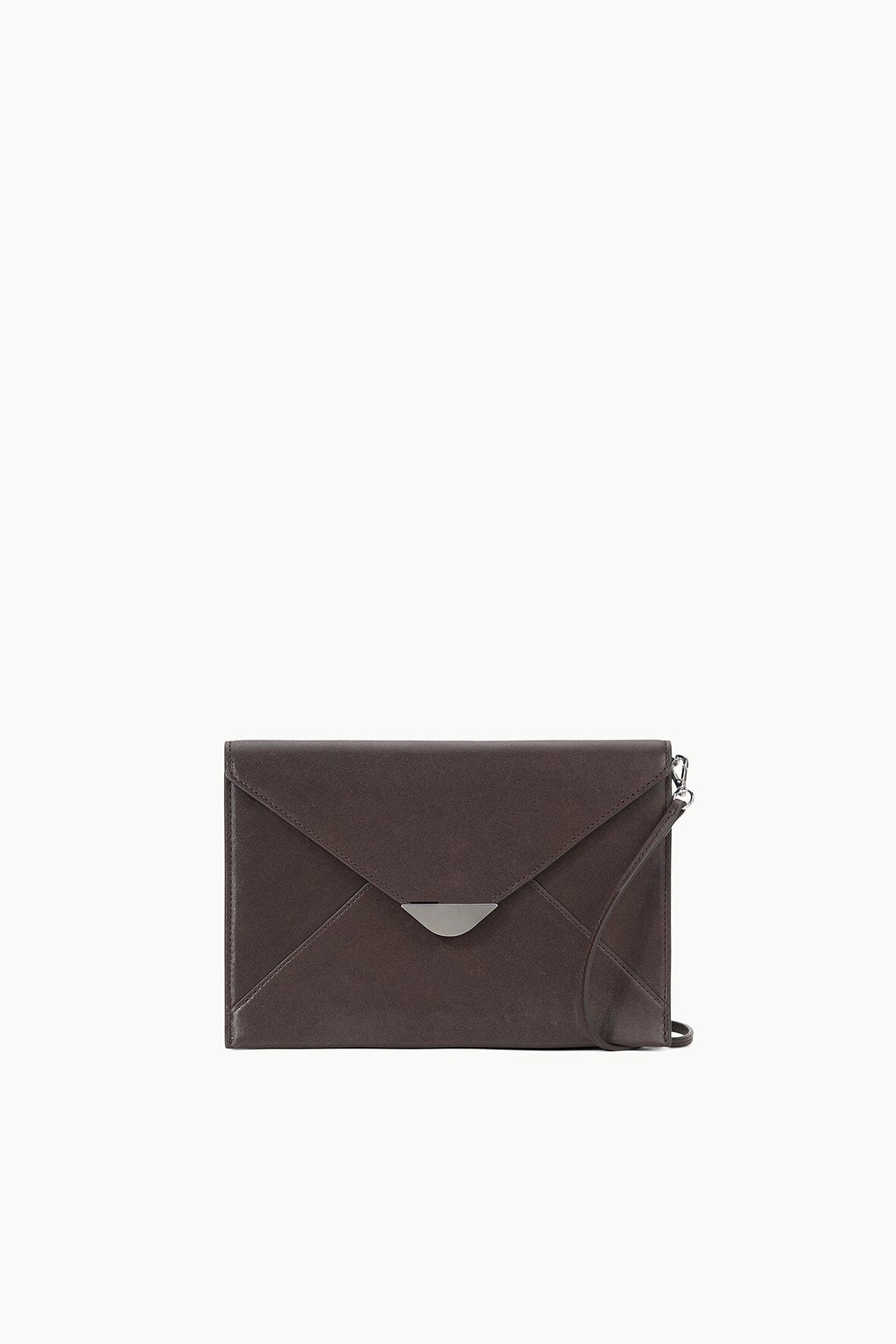 A leather evening clutch with metal finishes, this style features a removable leather crossbody strap and a metal snap closure.
