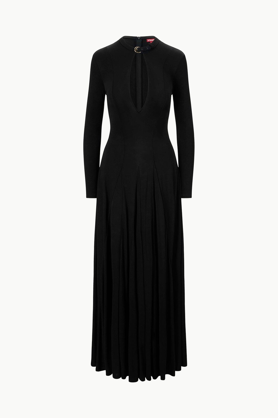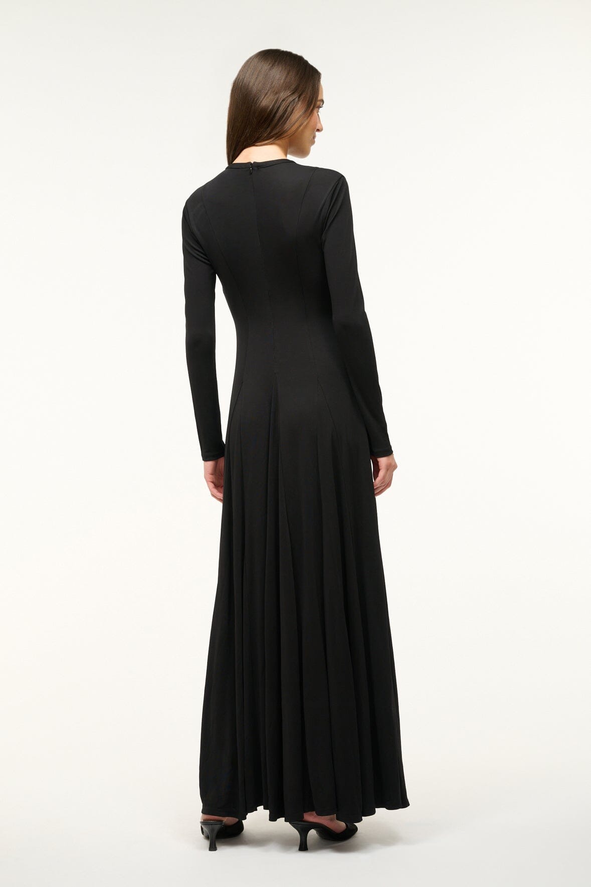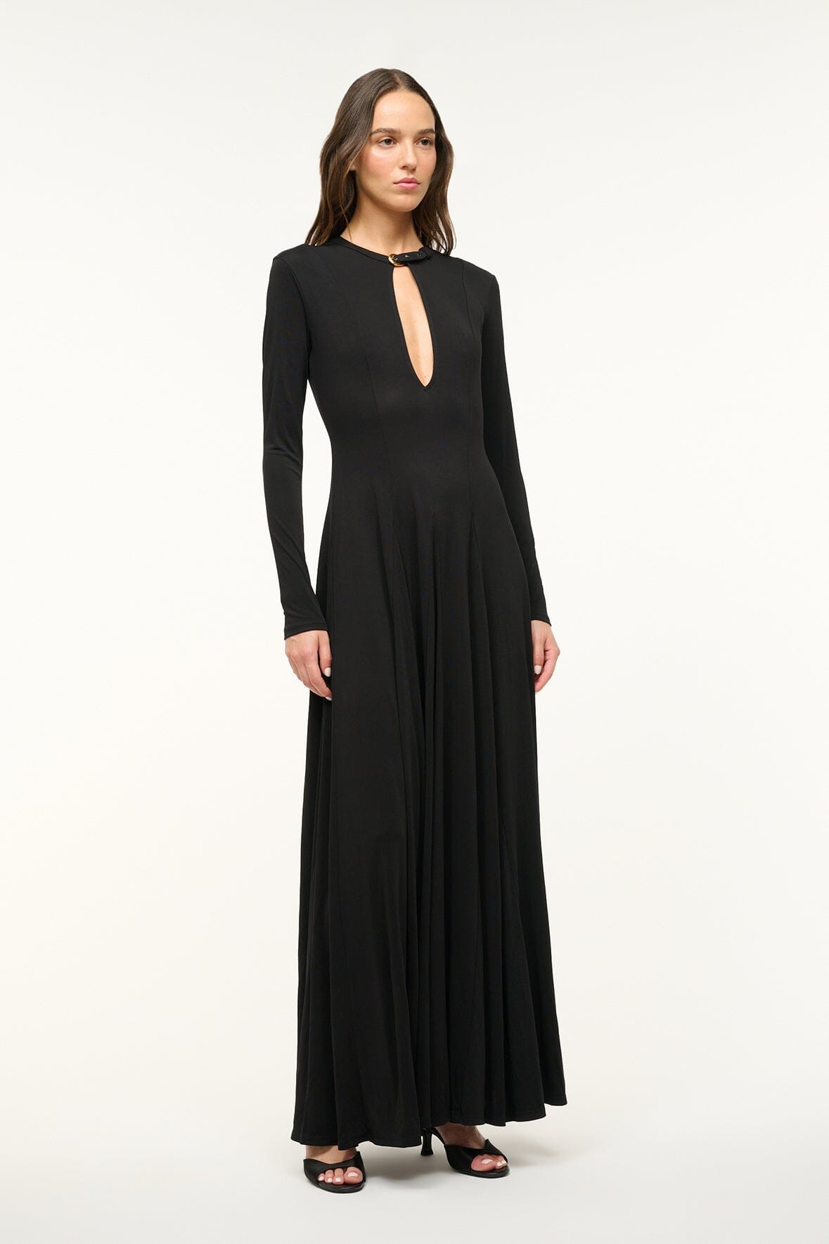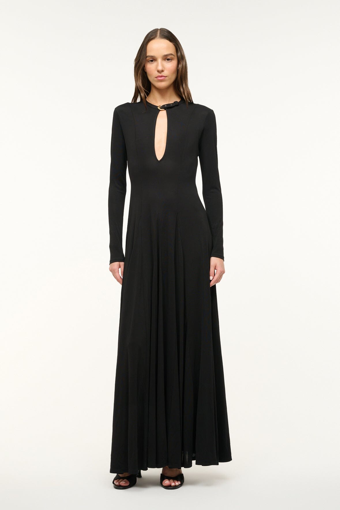 The Amerie Dress is a jersey long sleeve dress with a low v-neckline, a gold logo moon buckle closure, and a wide flowy sweep.