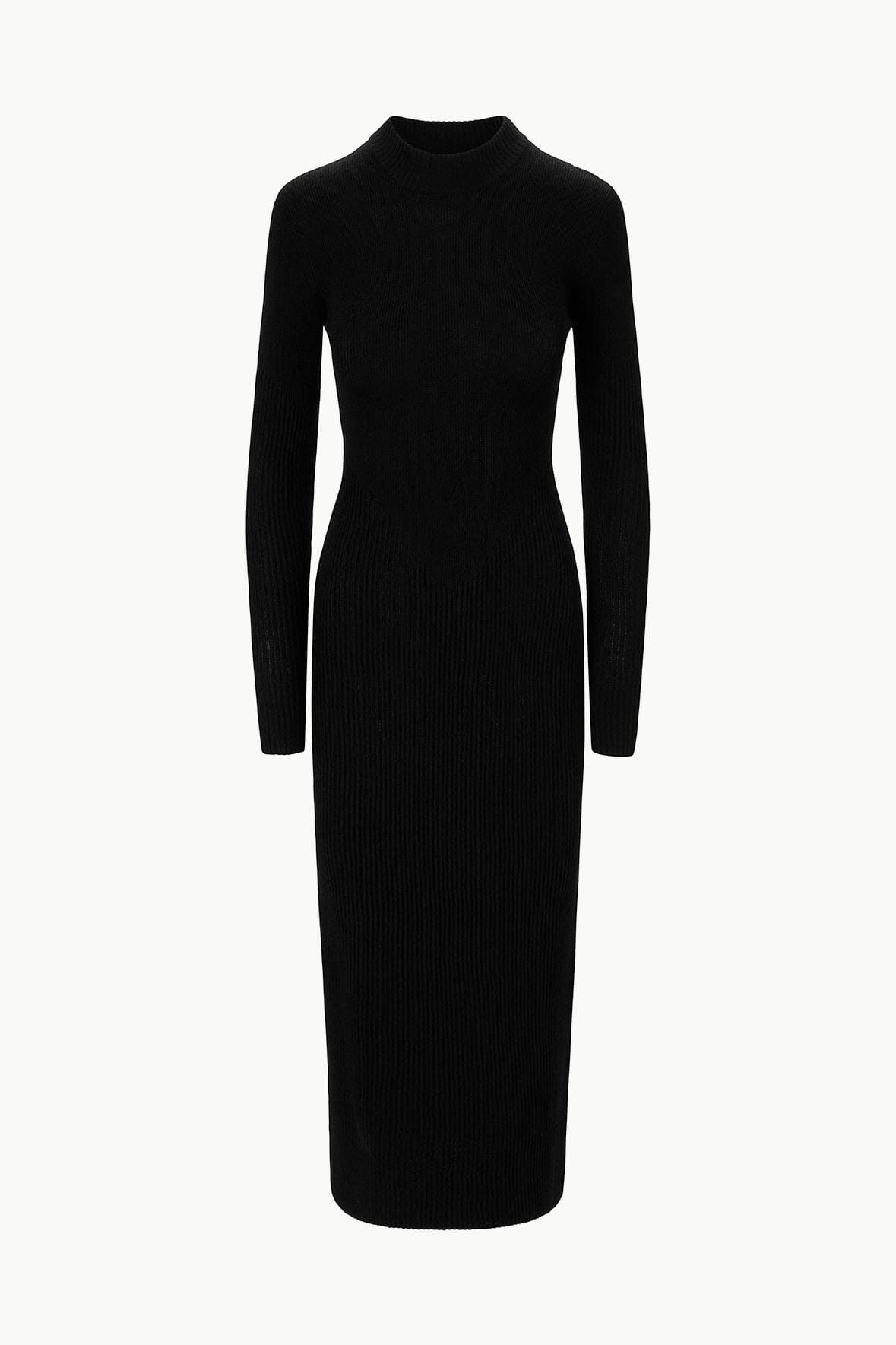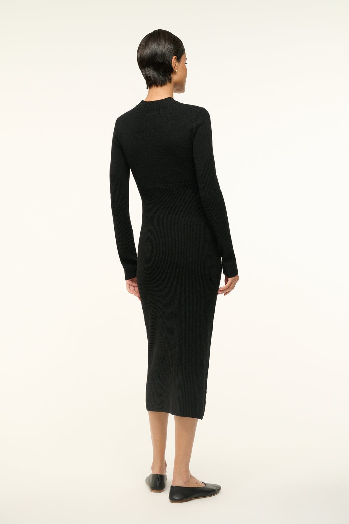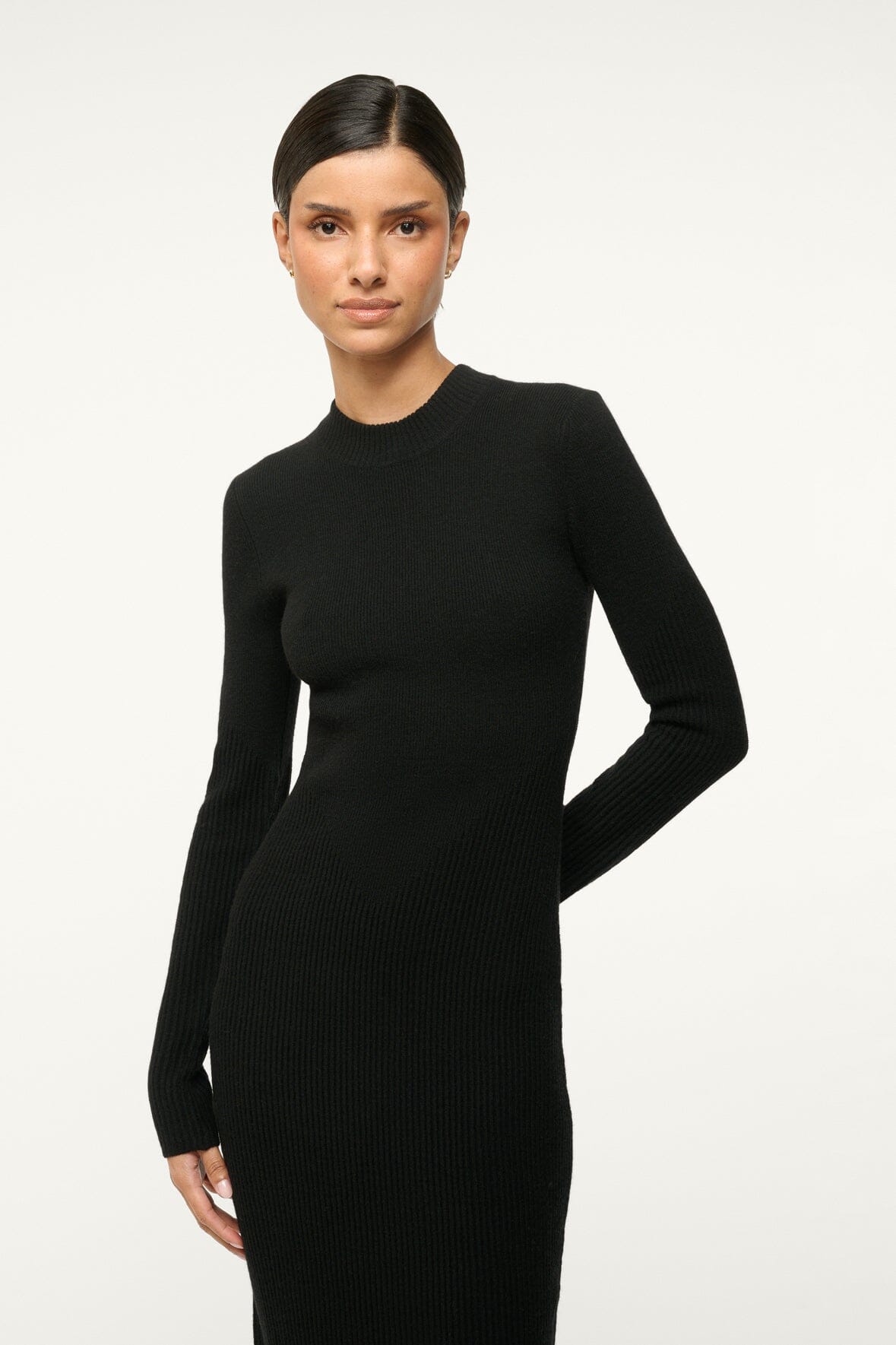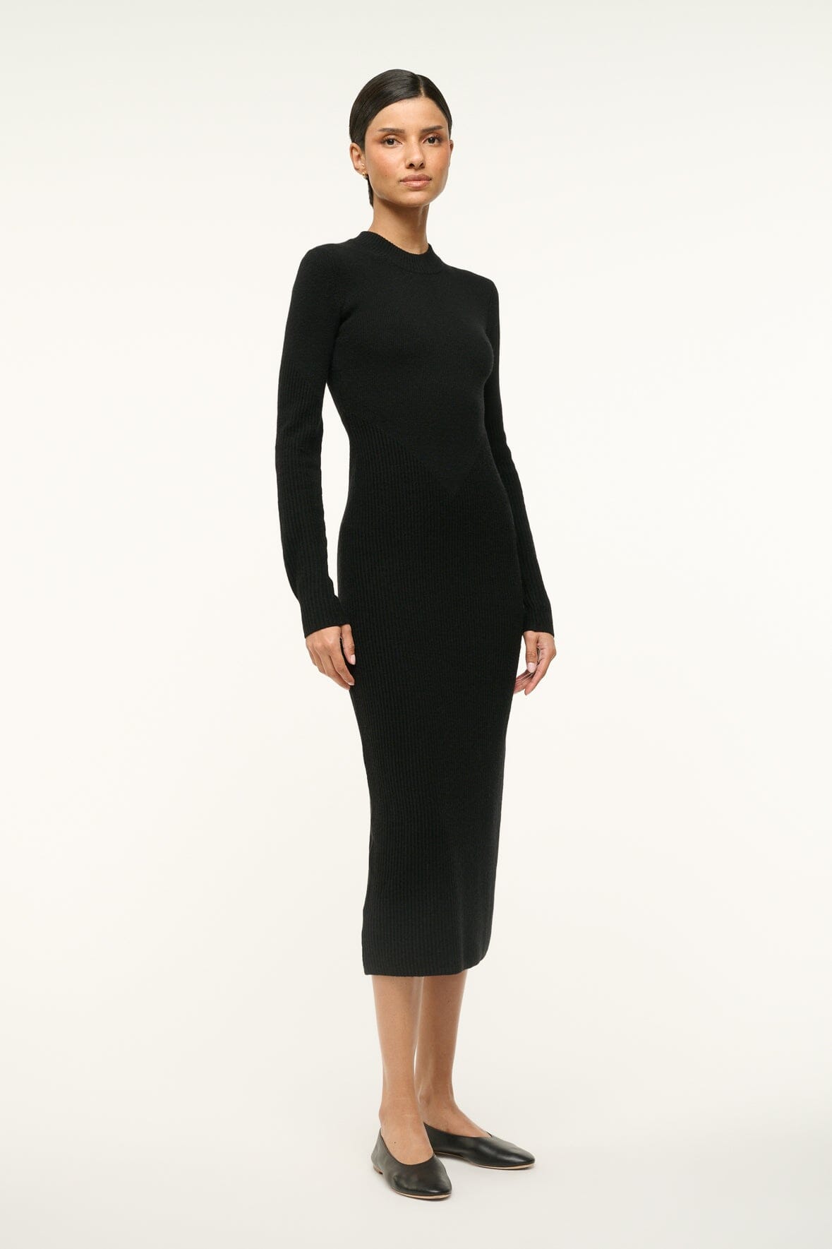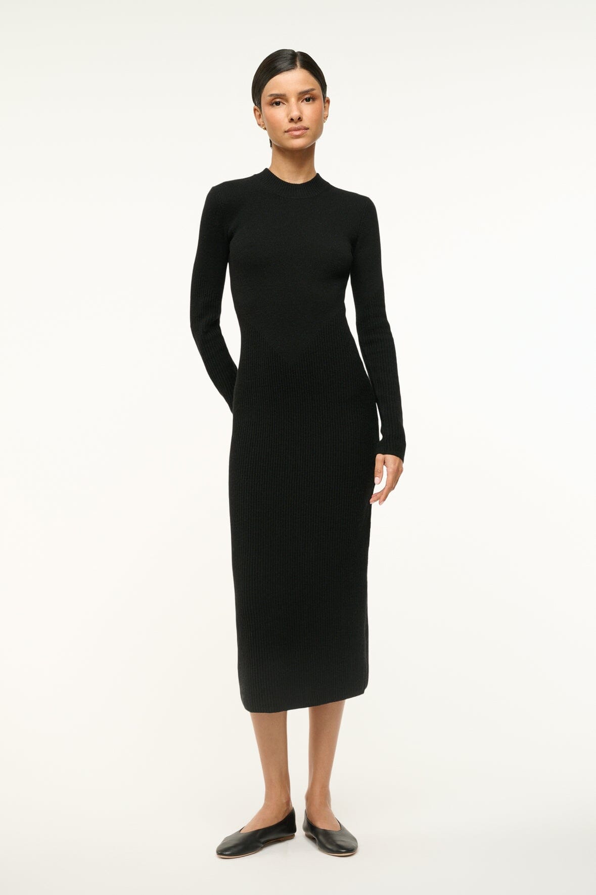 The Ramona Dress is a long sleeve fitted midi dress in a soft merino knit. This style has a mock neck and has ottoman stitch detailing for a flattering fit.