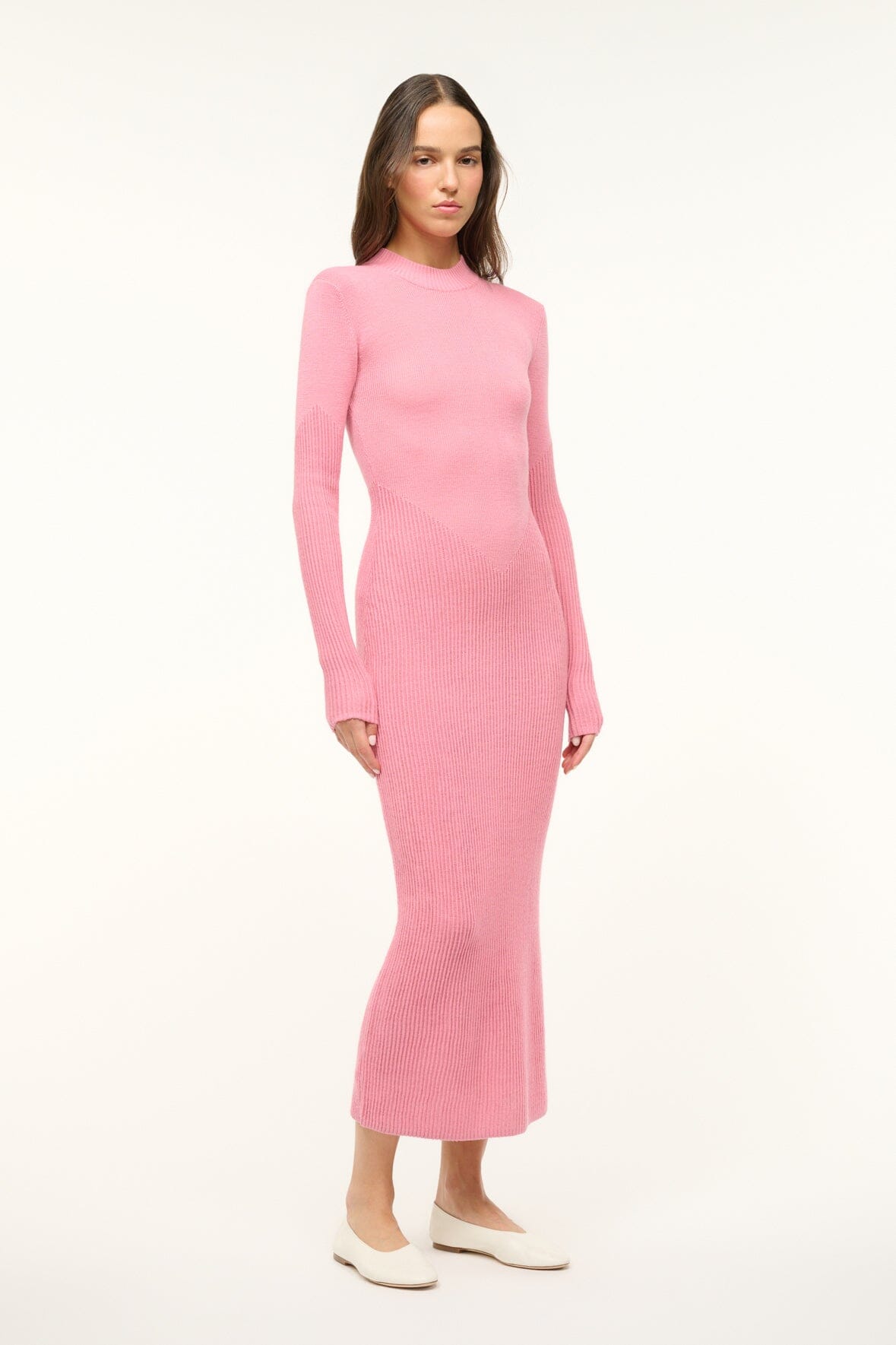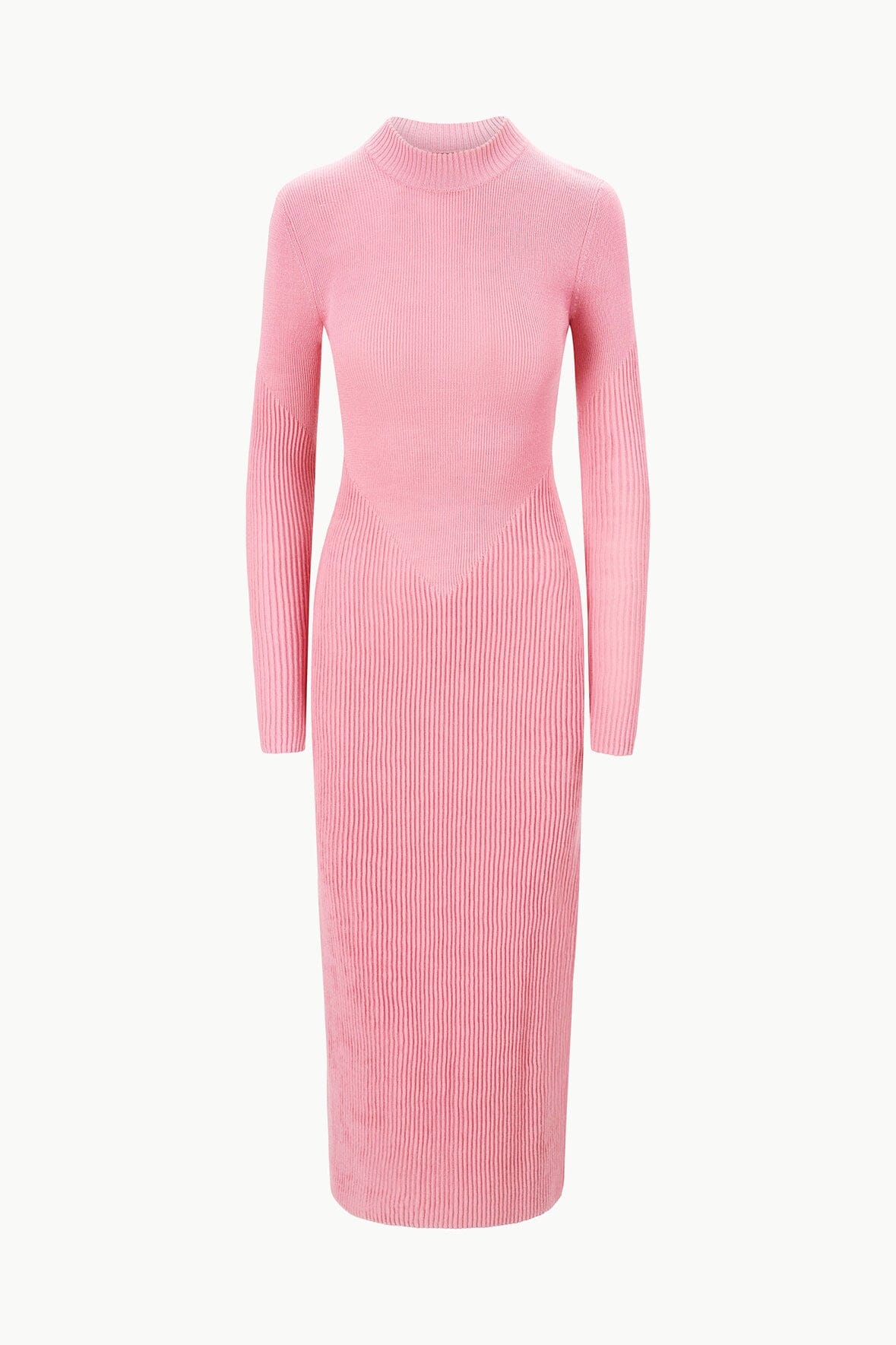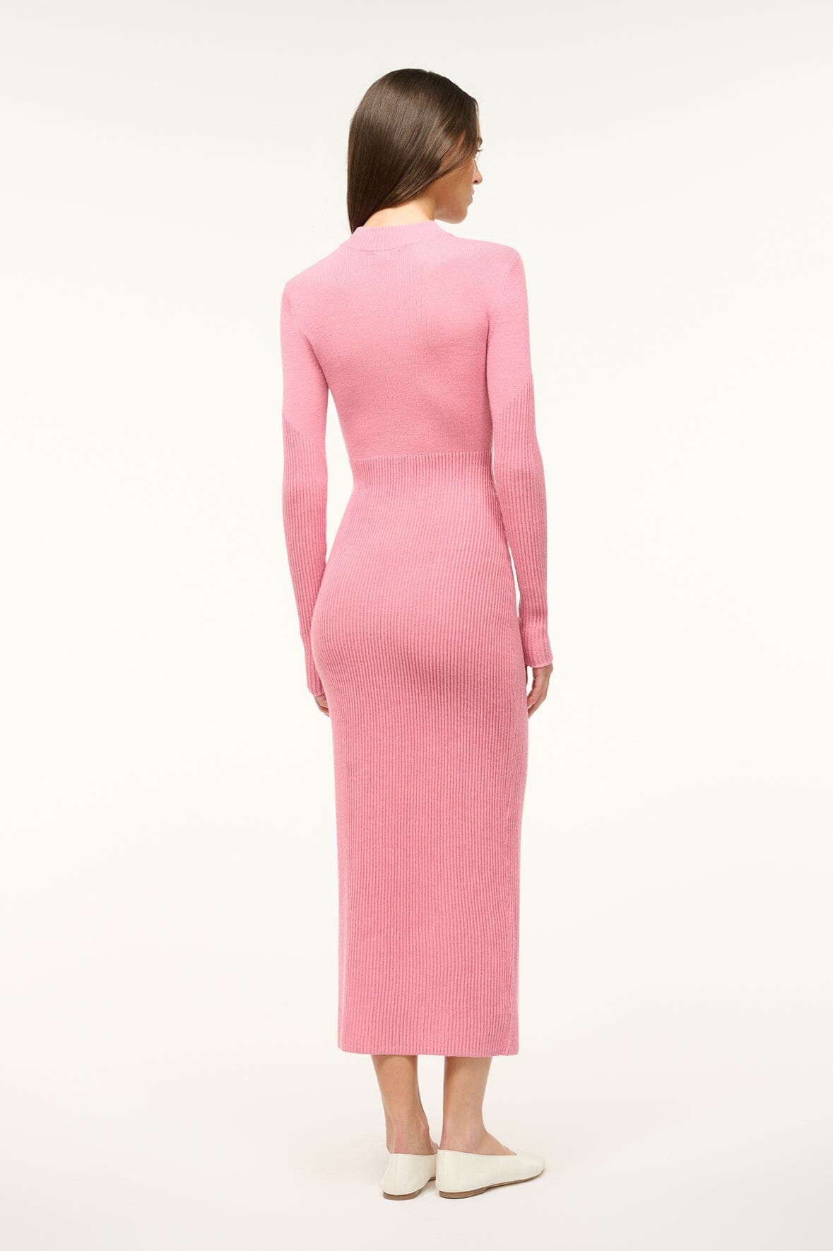 The Ramona Dress is a long sleeve fitted midi dress in a soft merino knit. This style has a mock neck and has ottoman stitch detailing for a flattering fit.