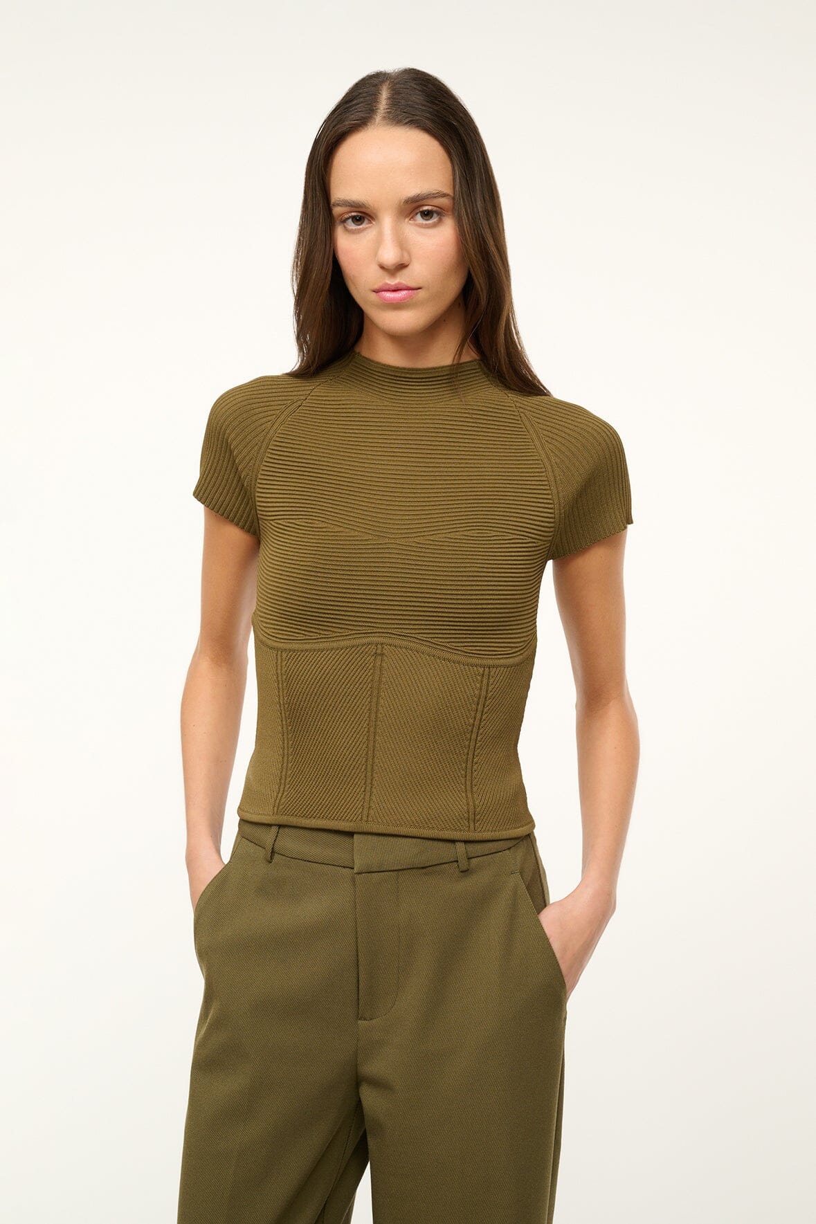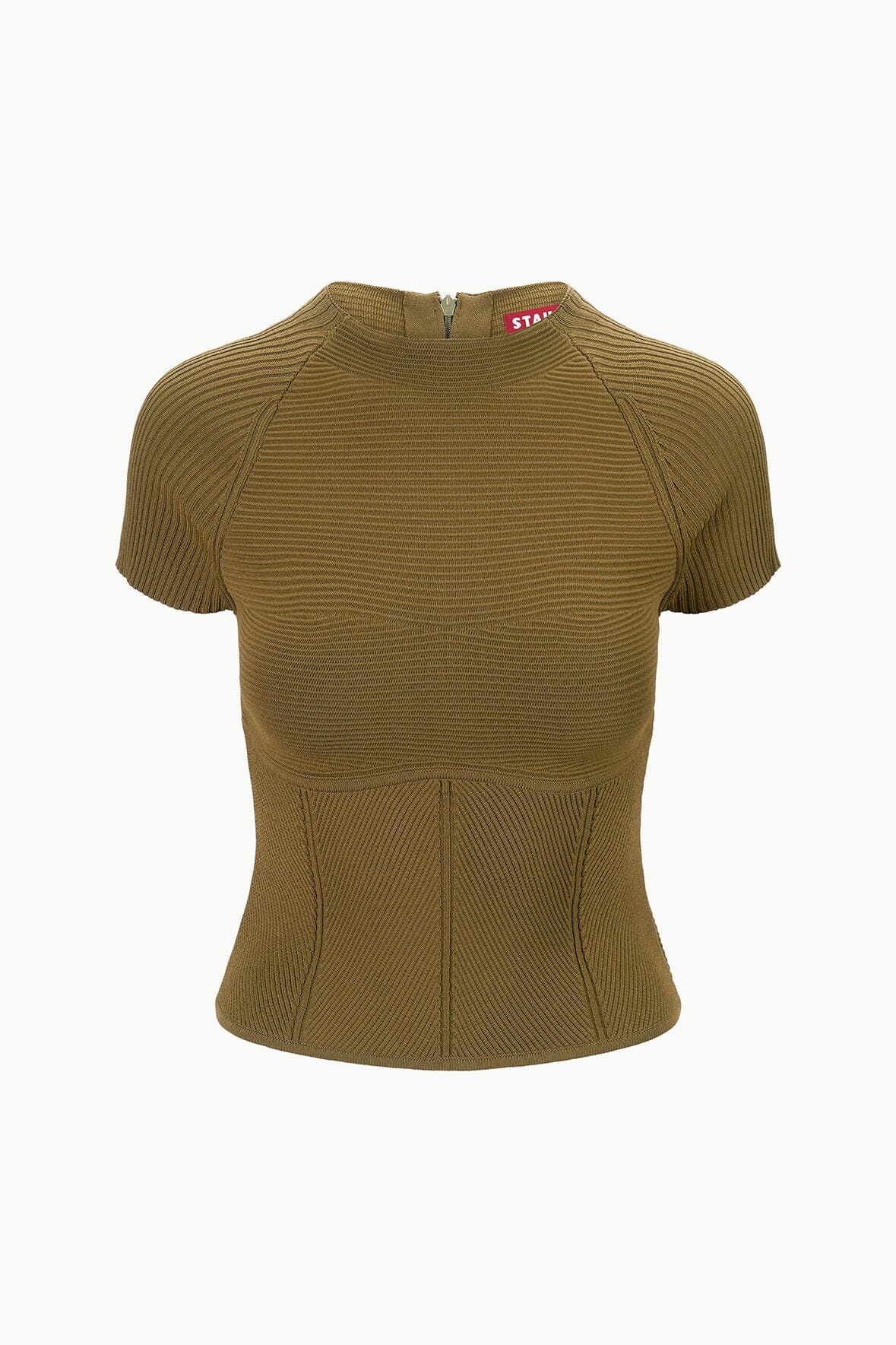 The Tigereye Top is a compact knit top with corset inspired seaming, a high crew neck and cap sleeves.