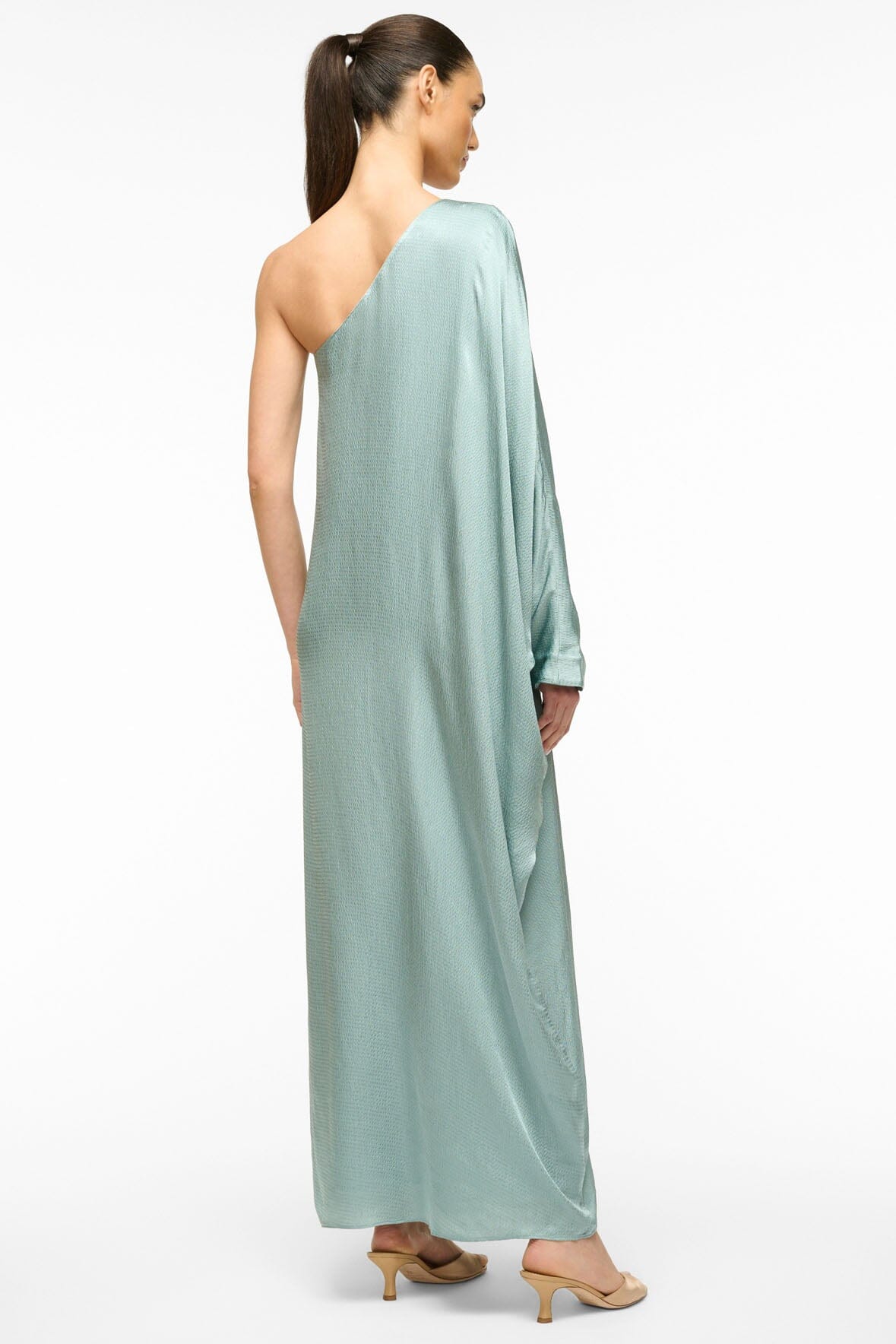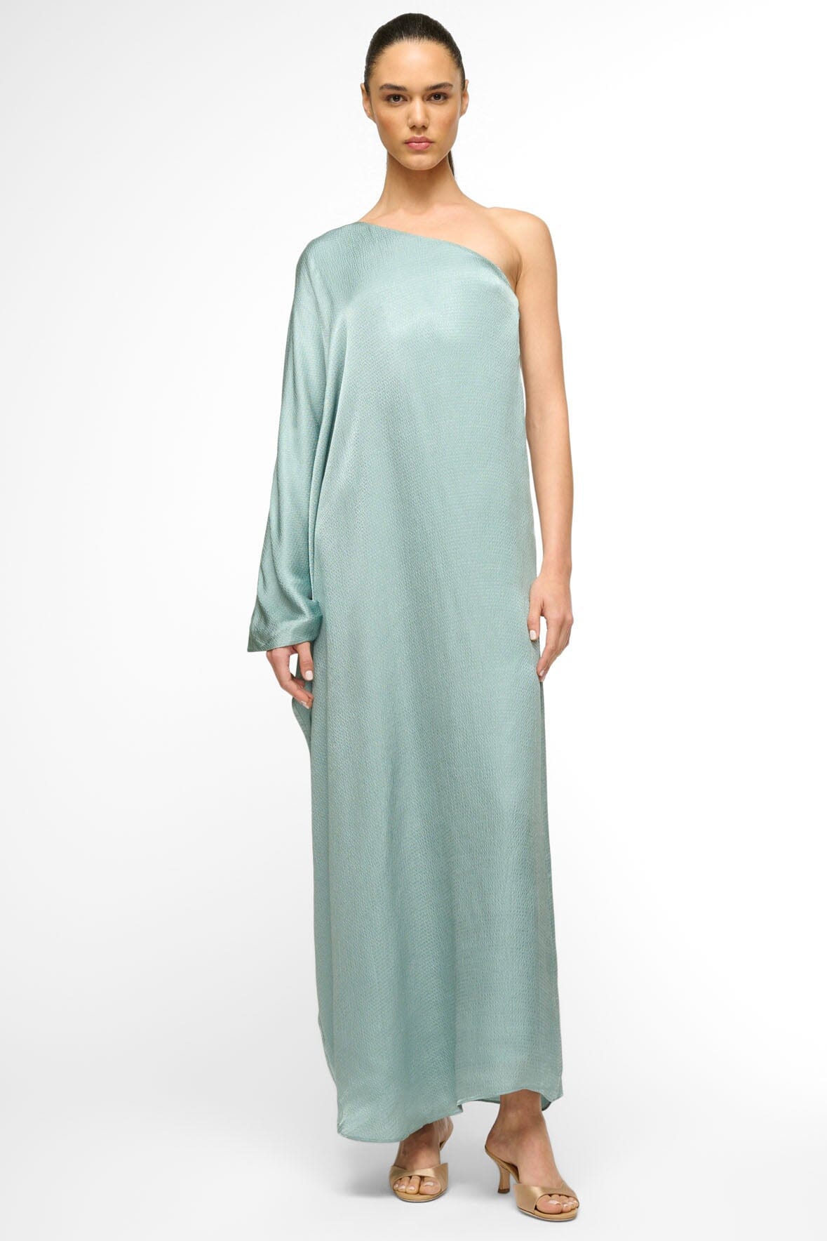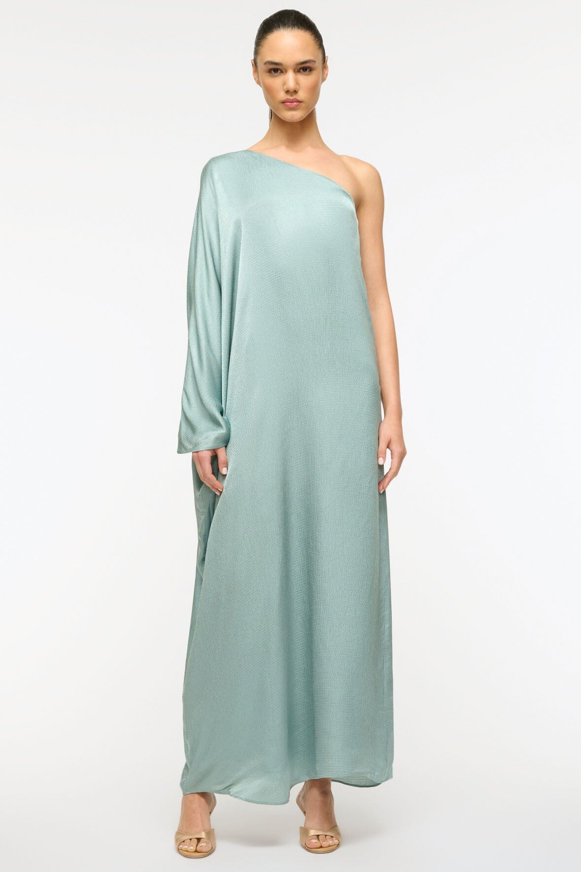 The Sonia Dress is a drapey, one shoulder maxi dress crafted from a hammered satin fabric. This style features a hidden zipper closure at the side and billowwy silhouette.
