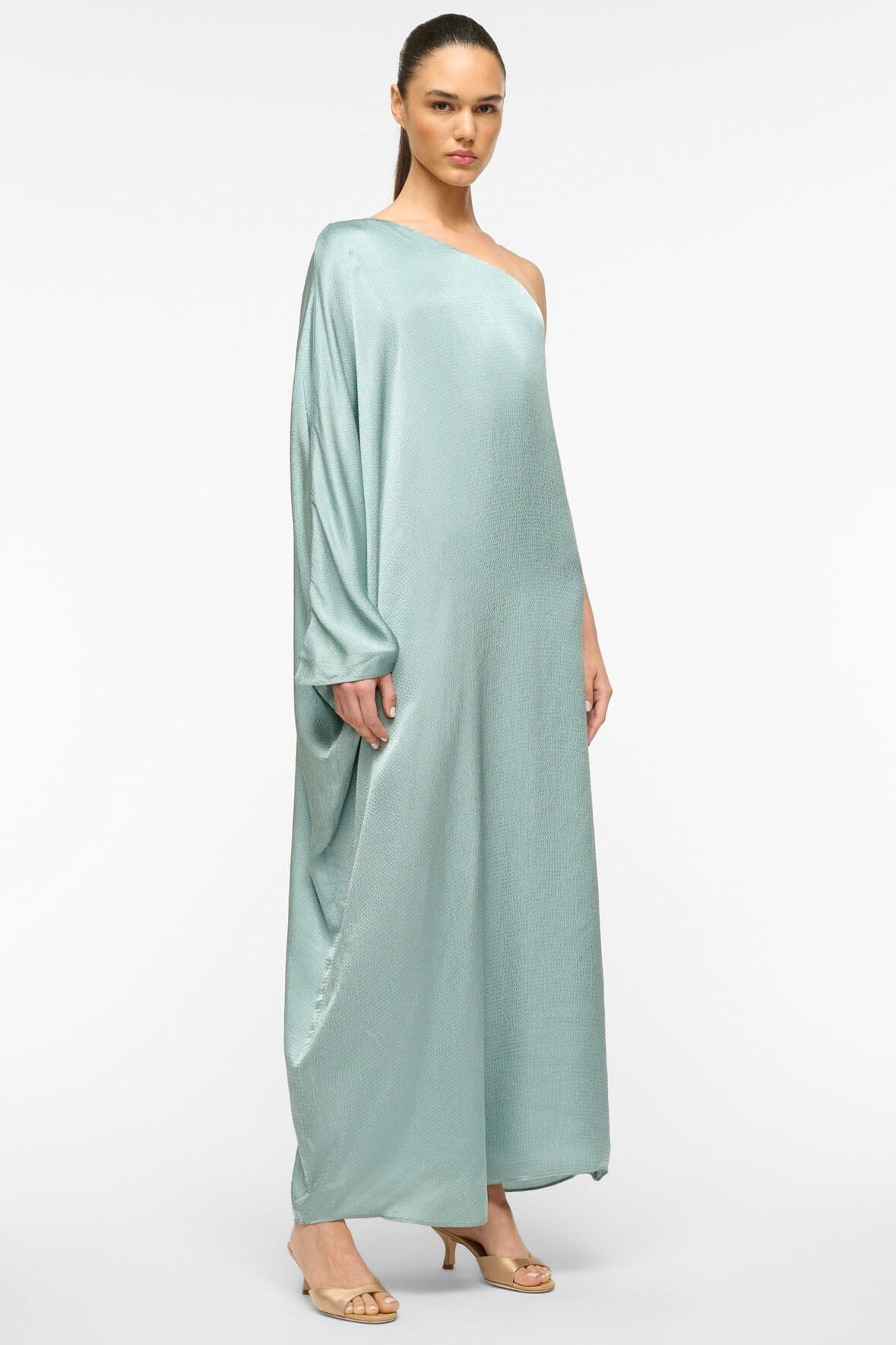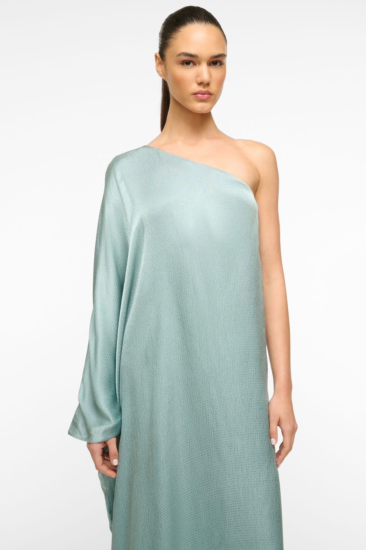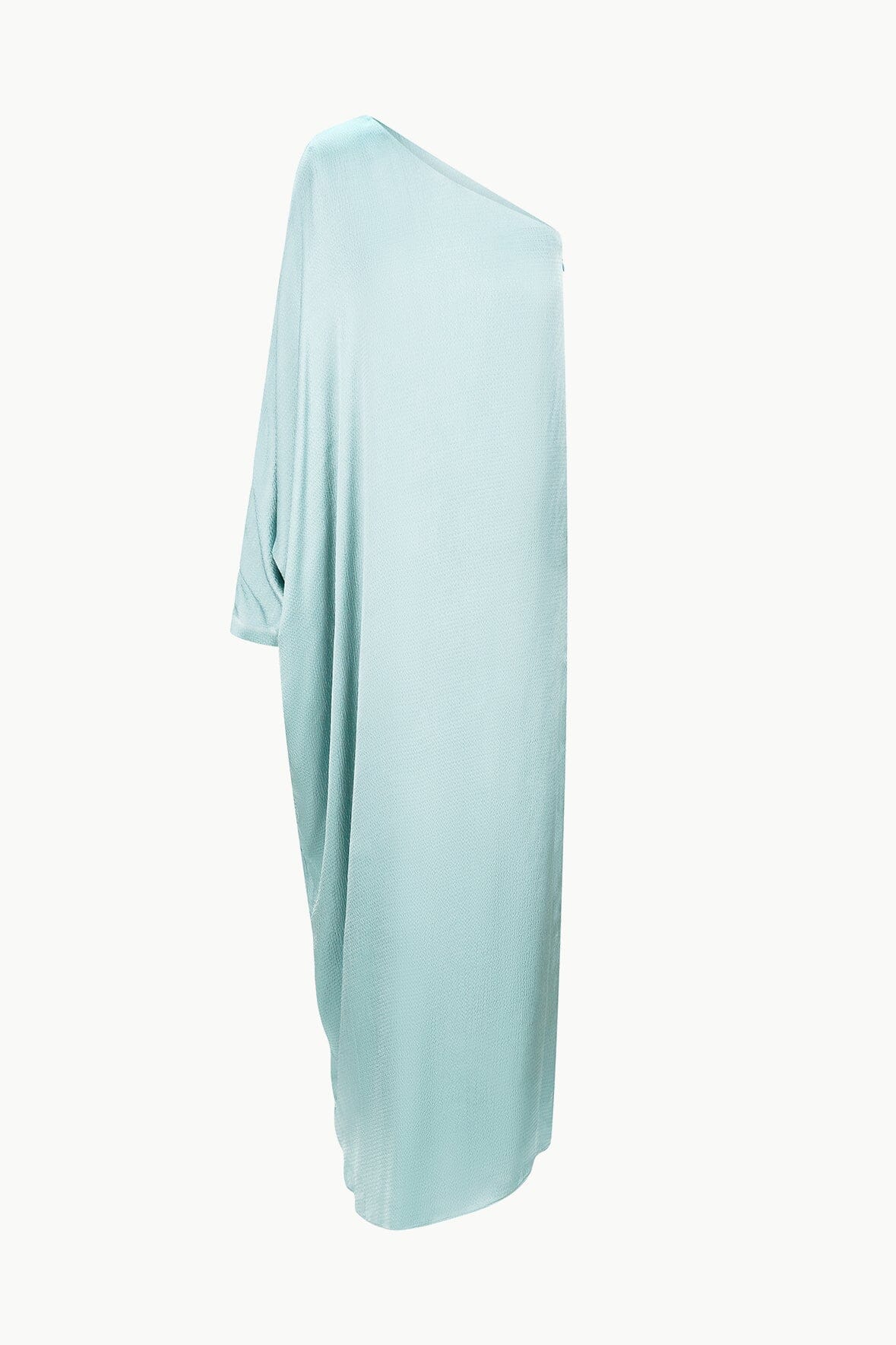 The Sonia Dress is a drapey, one shoulder maxi dress crafted from a hammered satin fabric. This style features a hidden zipper closure at the side and billowwy silhouette.