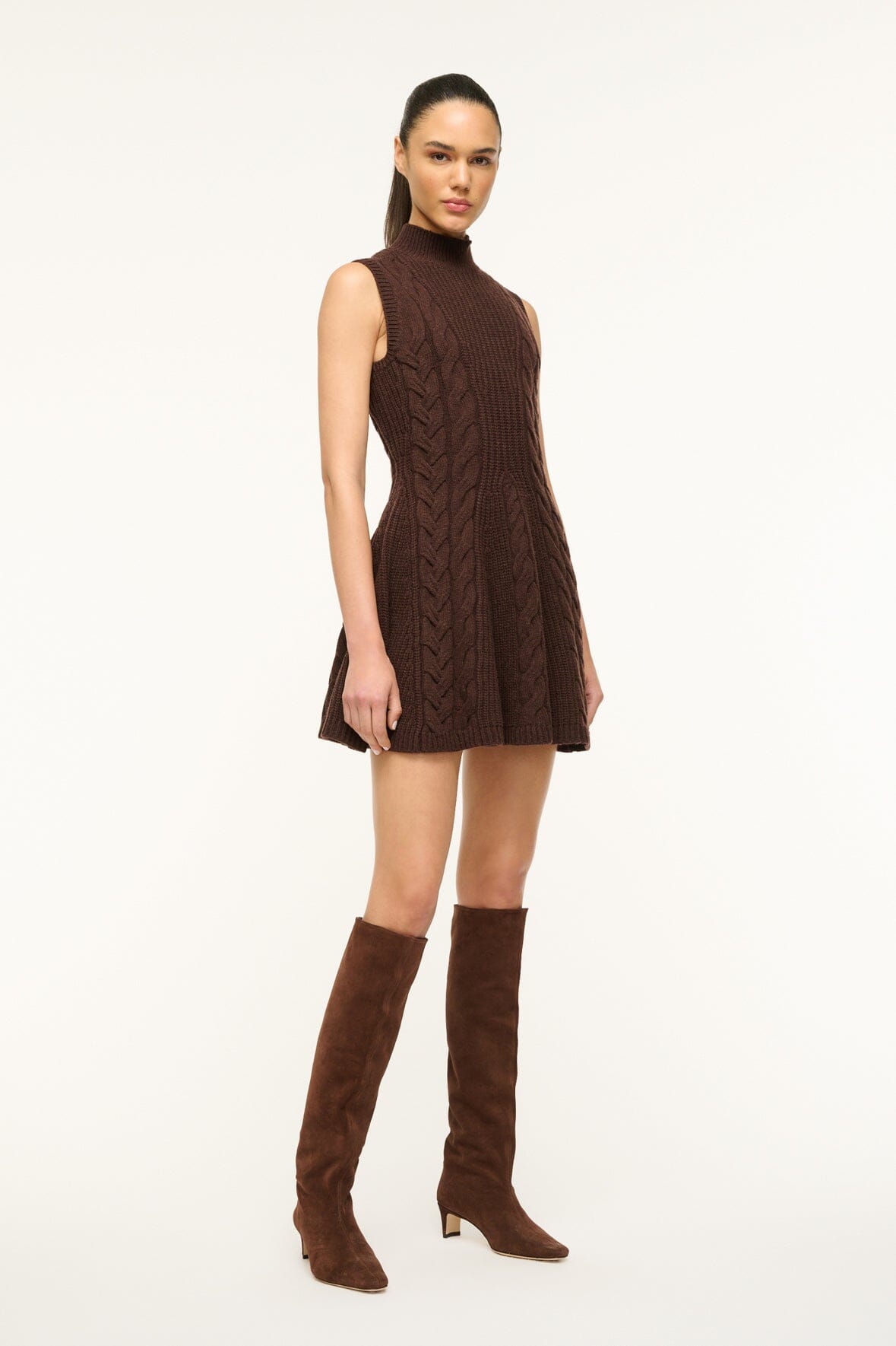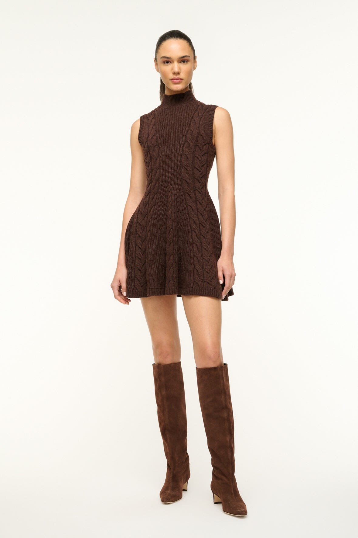 The Charade Dress is a mini length cable knit dress with a mock neck and full skirt.