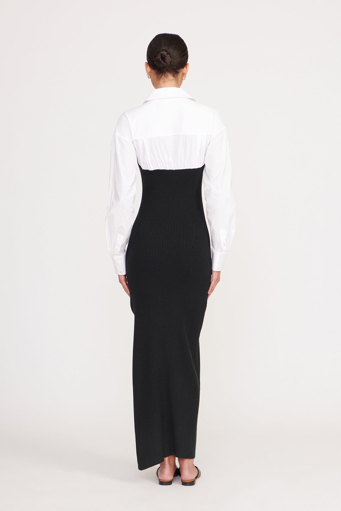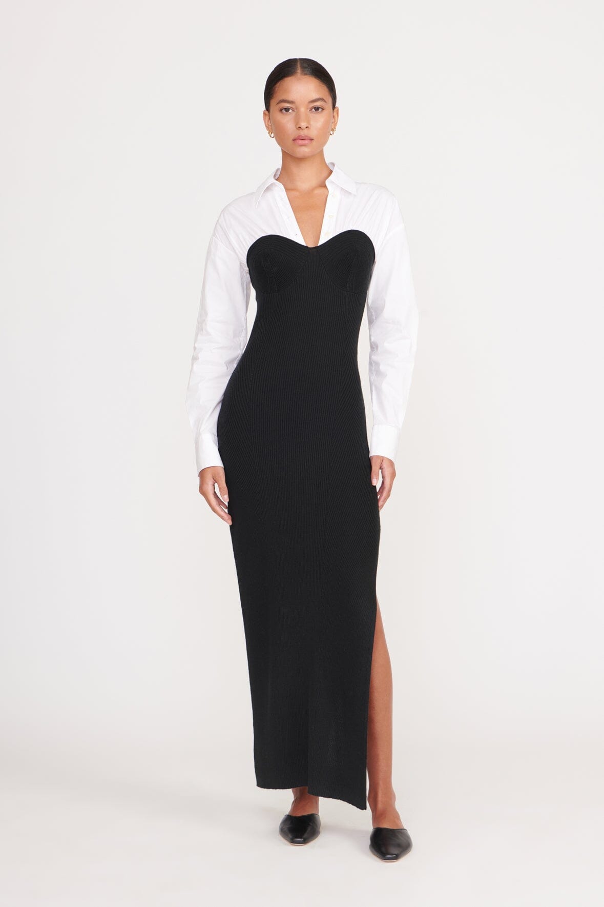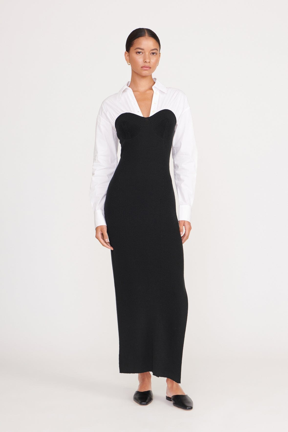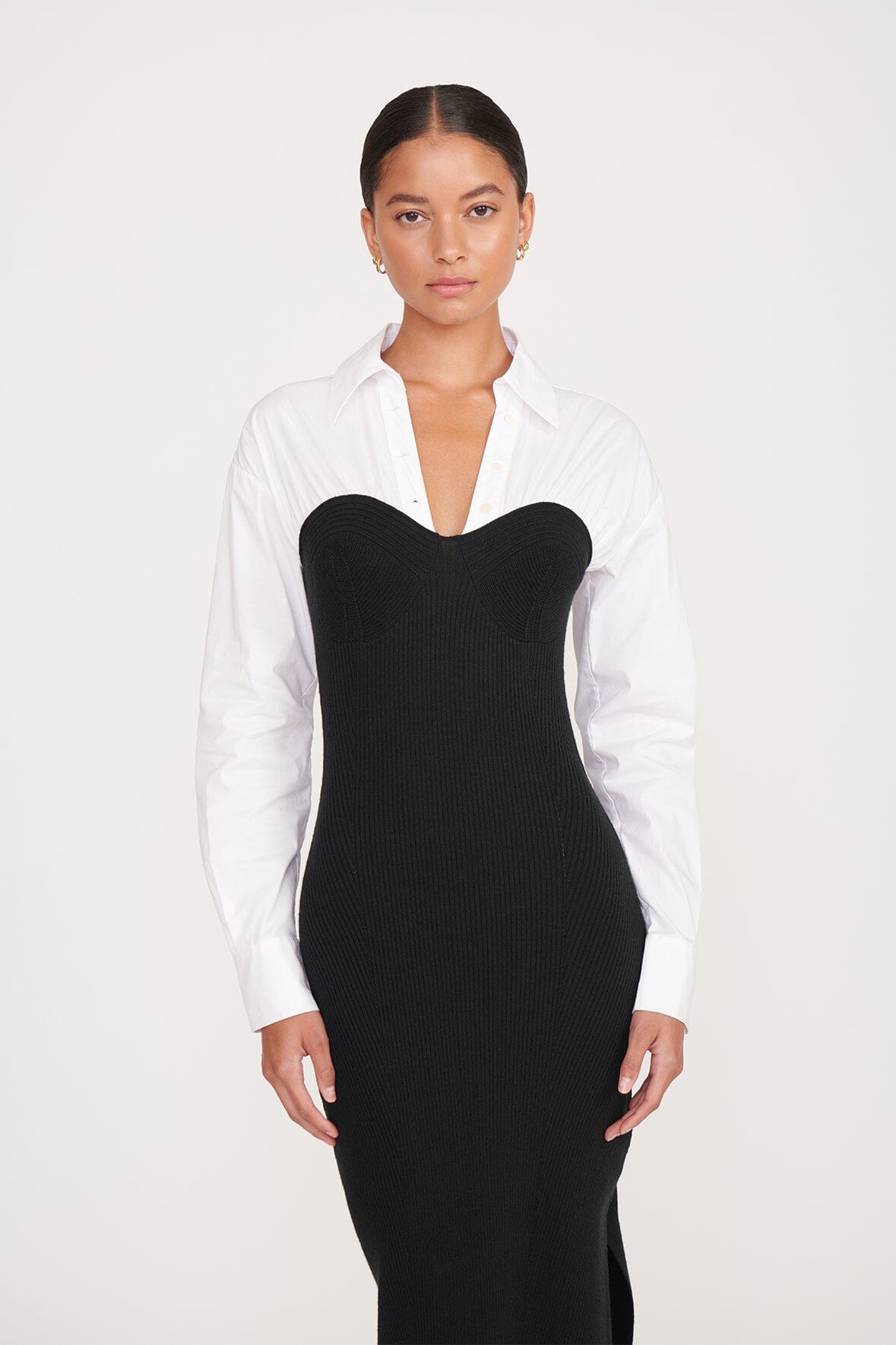 The Hazel is a poplin knit combo midi dress. The dress has fully fashion corset detailing attached to a long sleeve poplin shirt.