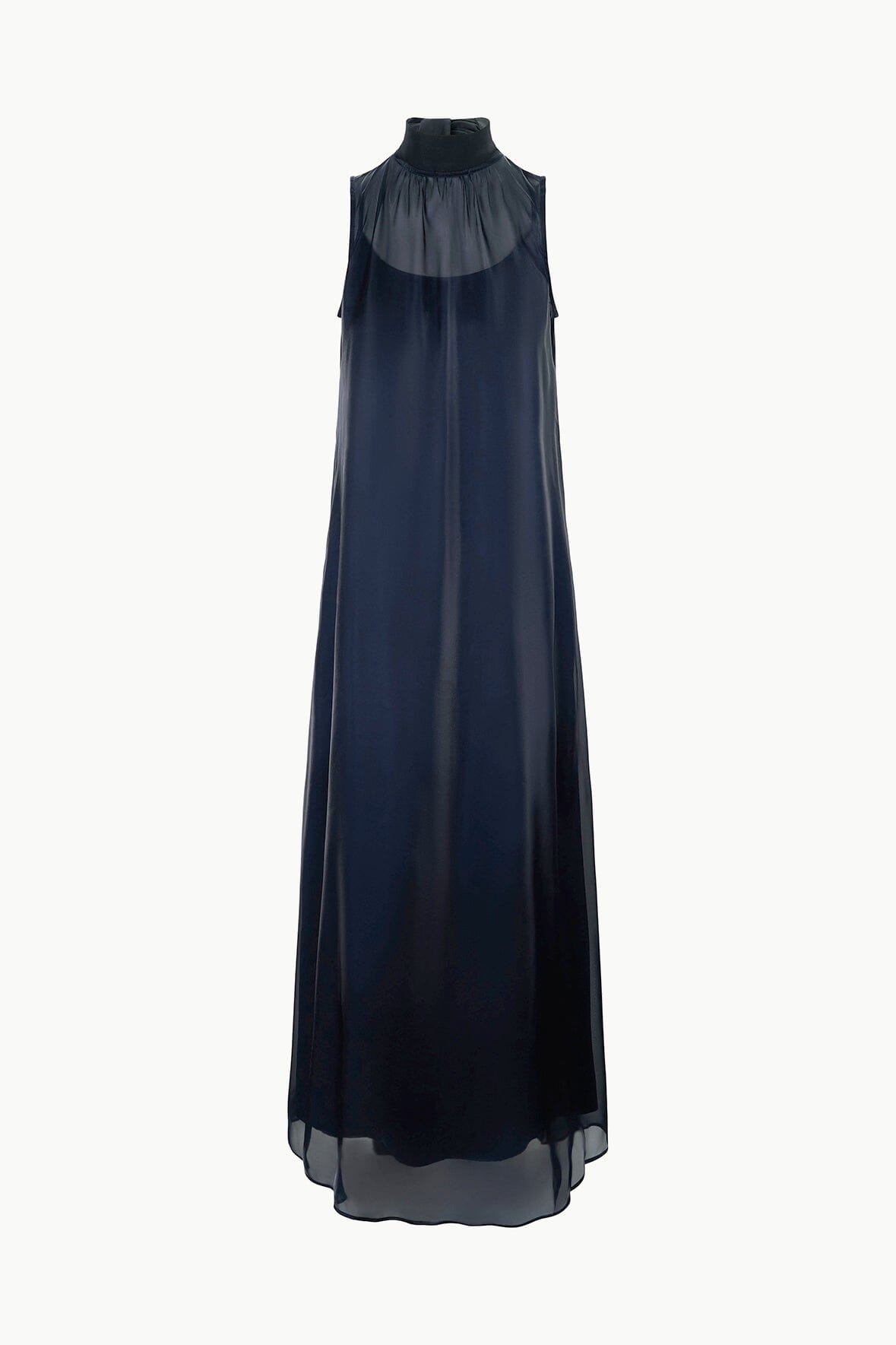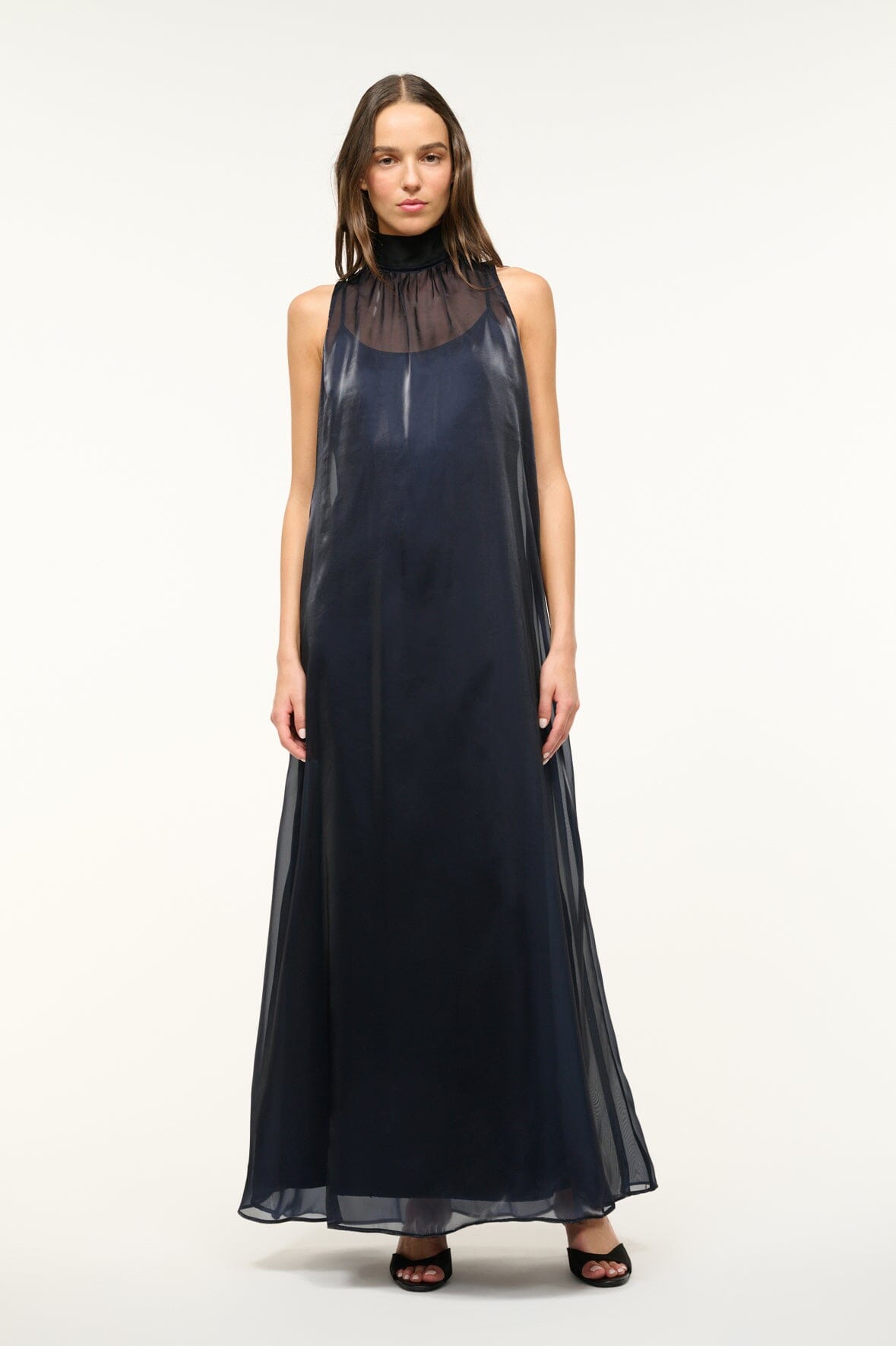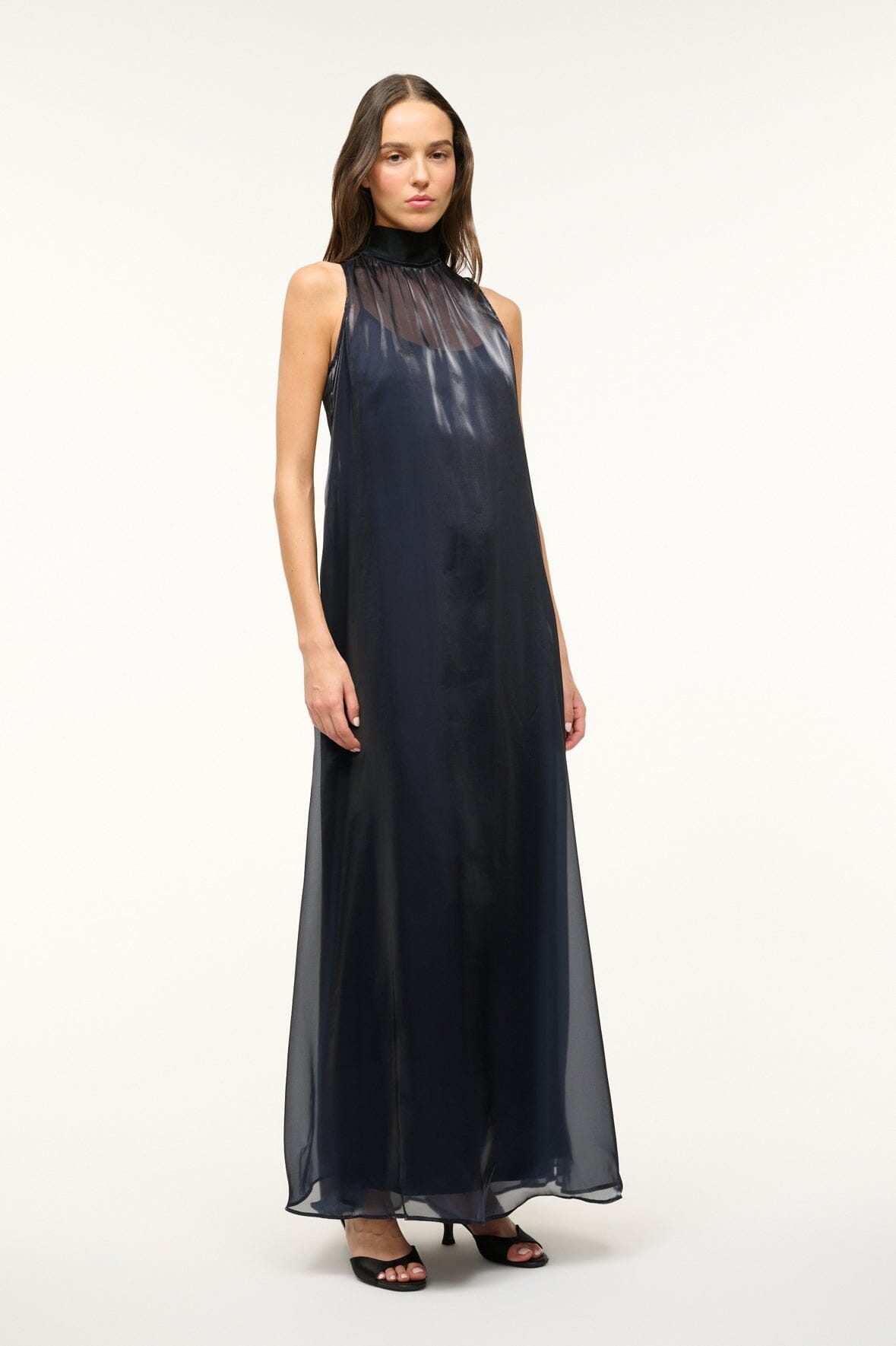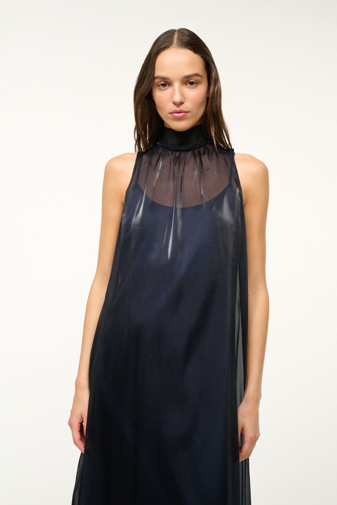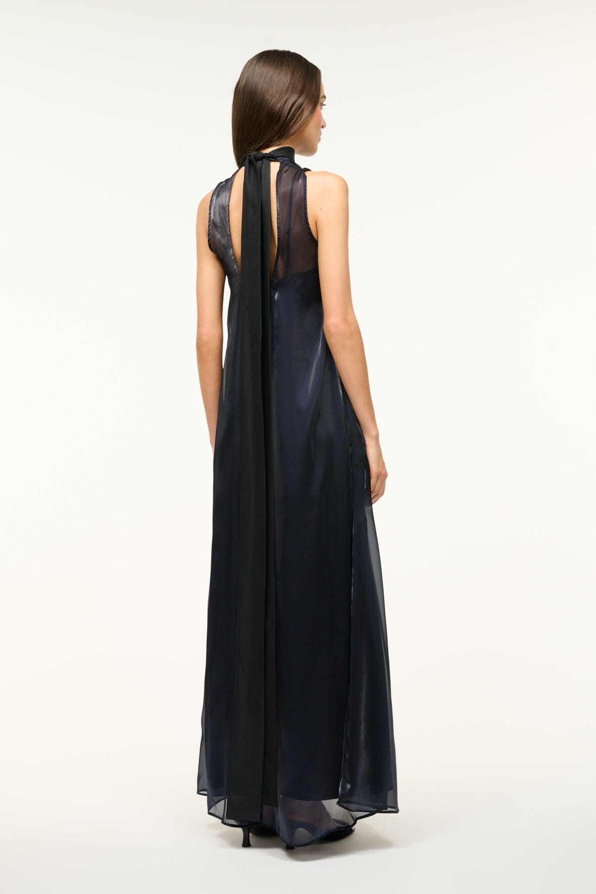 The Albee Dress is an organza sleeveless dress featuring a high neck with a functional tie in the back. This style is sheer and features an interior slip.