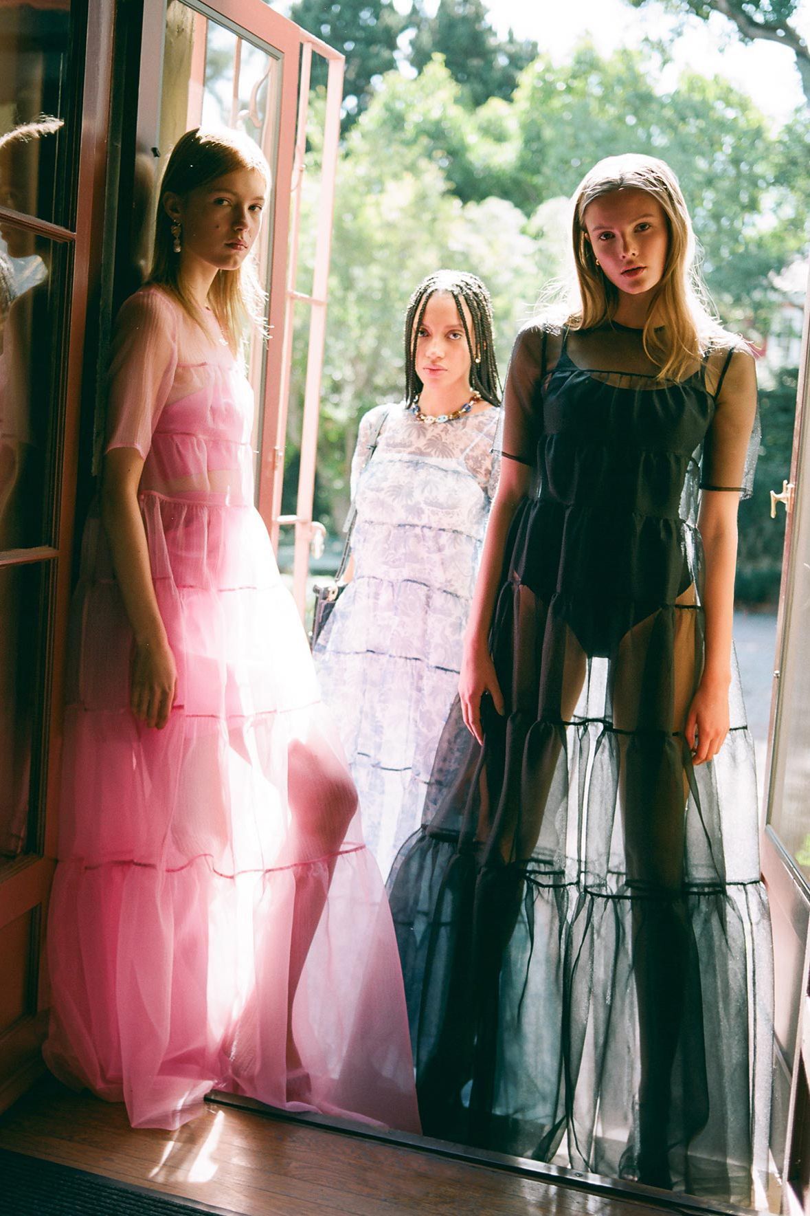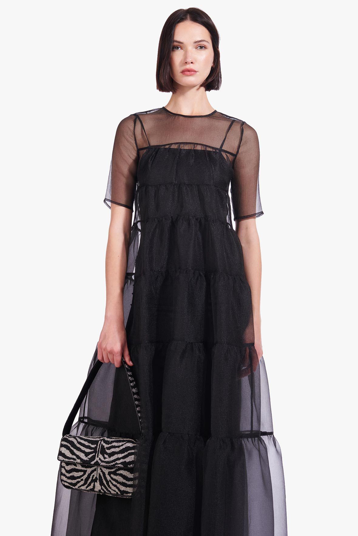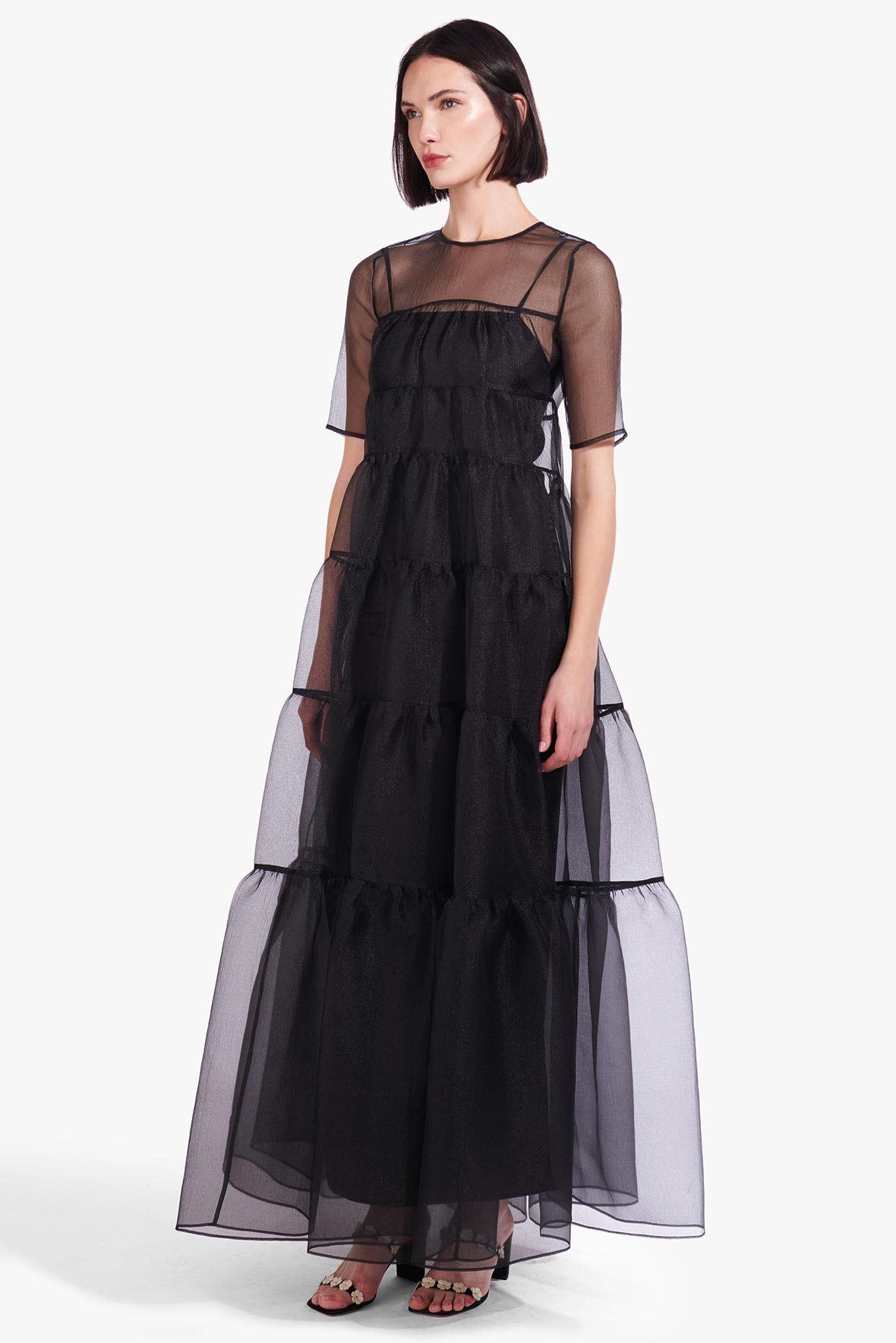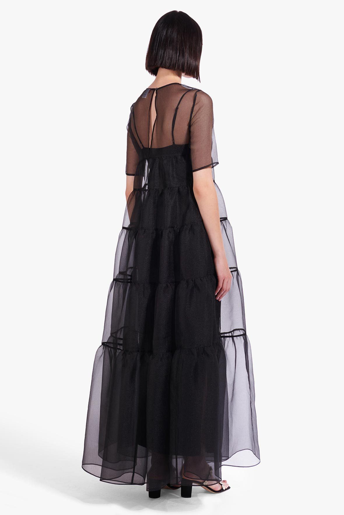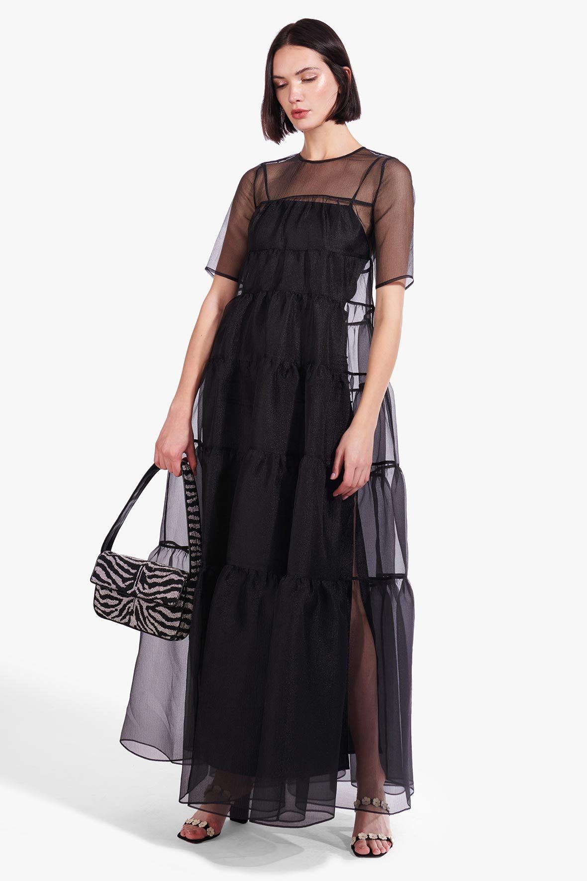 The Hyacinth Dress in sheer organza is a tiered maxi with a single back button closure. Includes an inner slip.