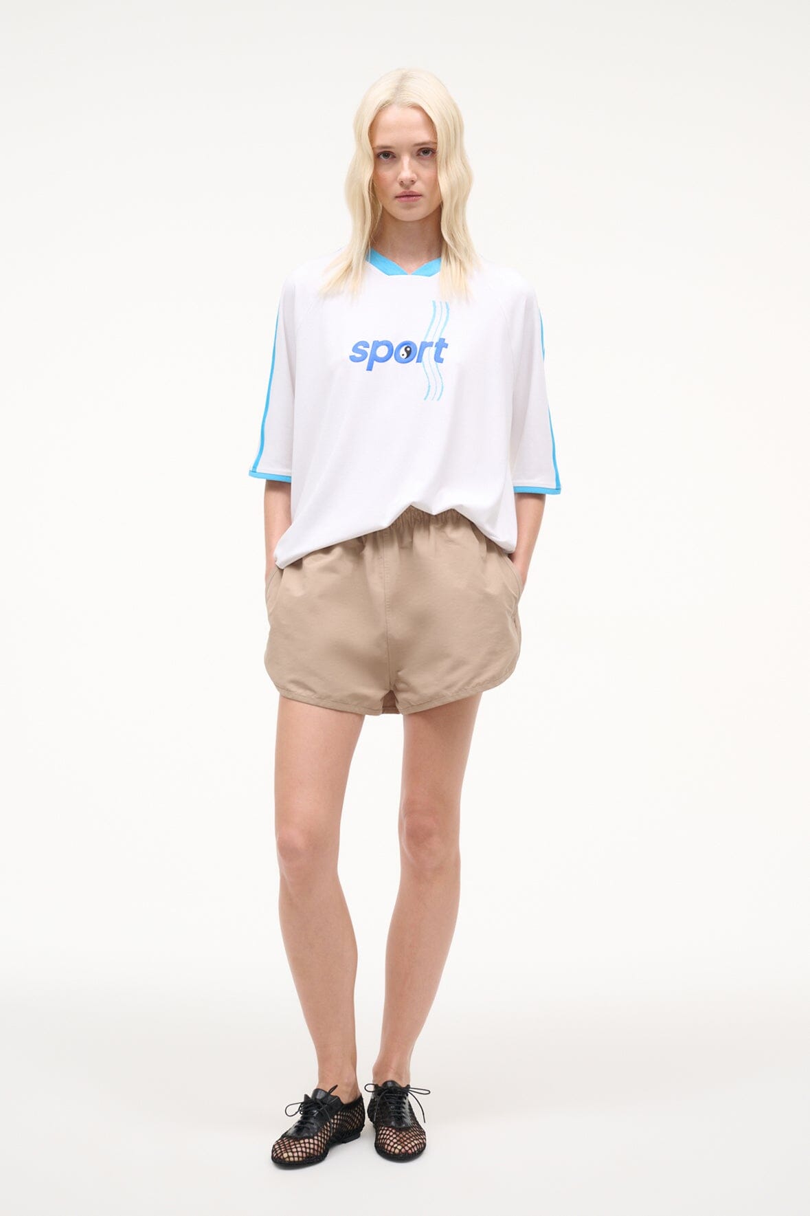 Flare-fit mini shorts designed for movement and style. Crafted from lightweight nylon with a mid-rise cut and elasticized waistband for a secure, comfortable fit.