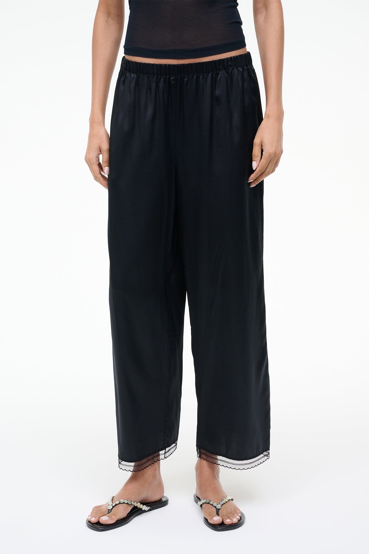 Effortless elegance meets refined comfort in this cropped silk pant. The pull-on elastic waistband ensures a secure, adjustable fit, while 100% silk delivers a luxurious drape and subtle sheen. Delicate lace trim at the hem adds a sophisticated finishing touch. Perfect for transitional dressing.