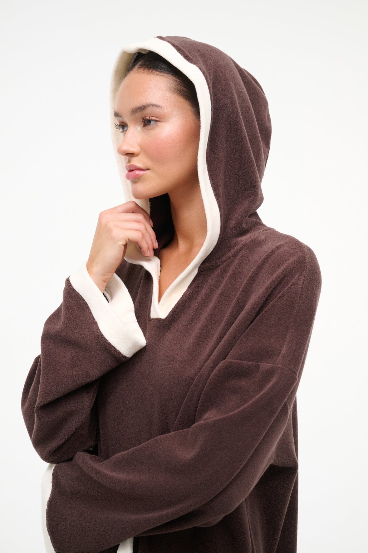 The Anona Dress is a relaxed terry cover-up with a cozy hood and functional front pocket. Perfect for effortless layering over swimwear or as a standalone piece for casual comfort.