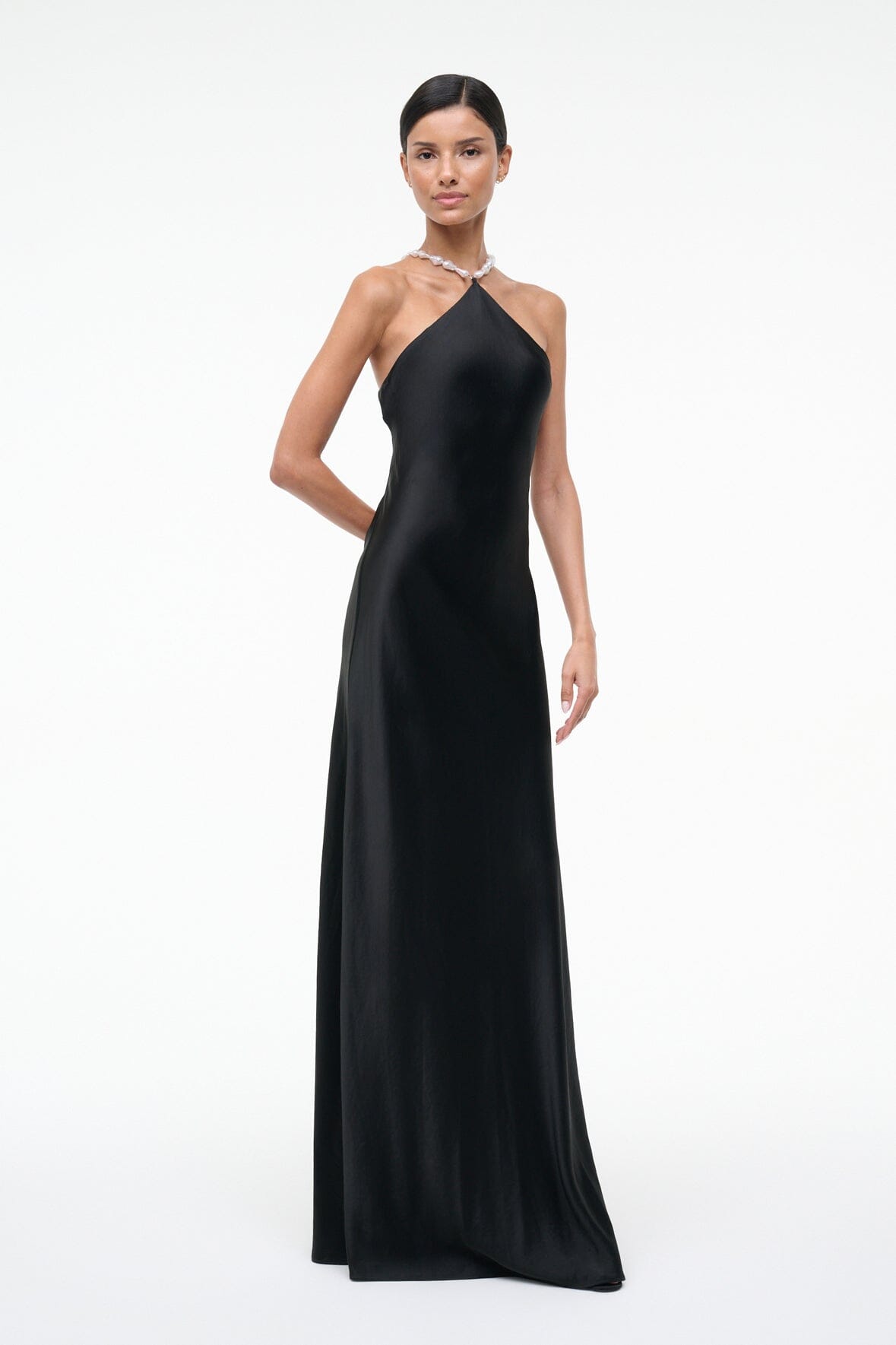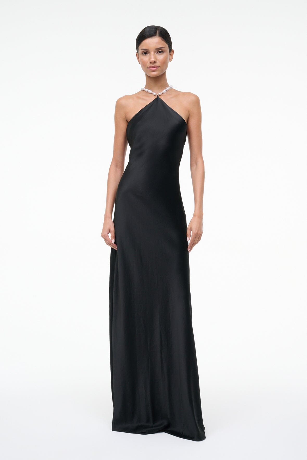 The Cadence is a floor length slip dress featuring a halter neckline with beaded pearl straps. This dress is crafted in satin and has a hidden back zipper.