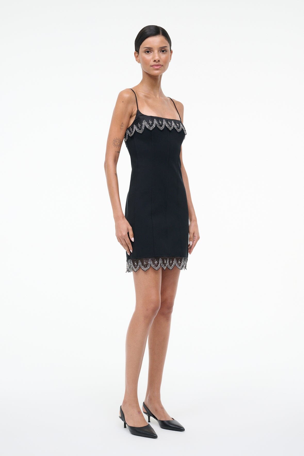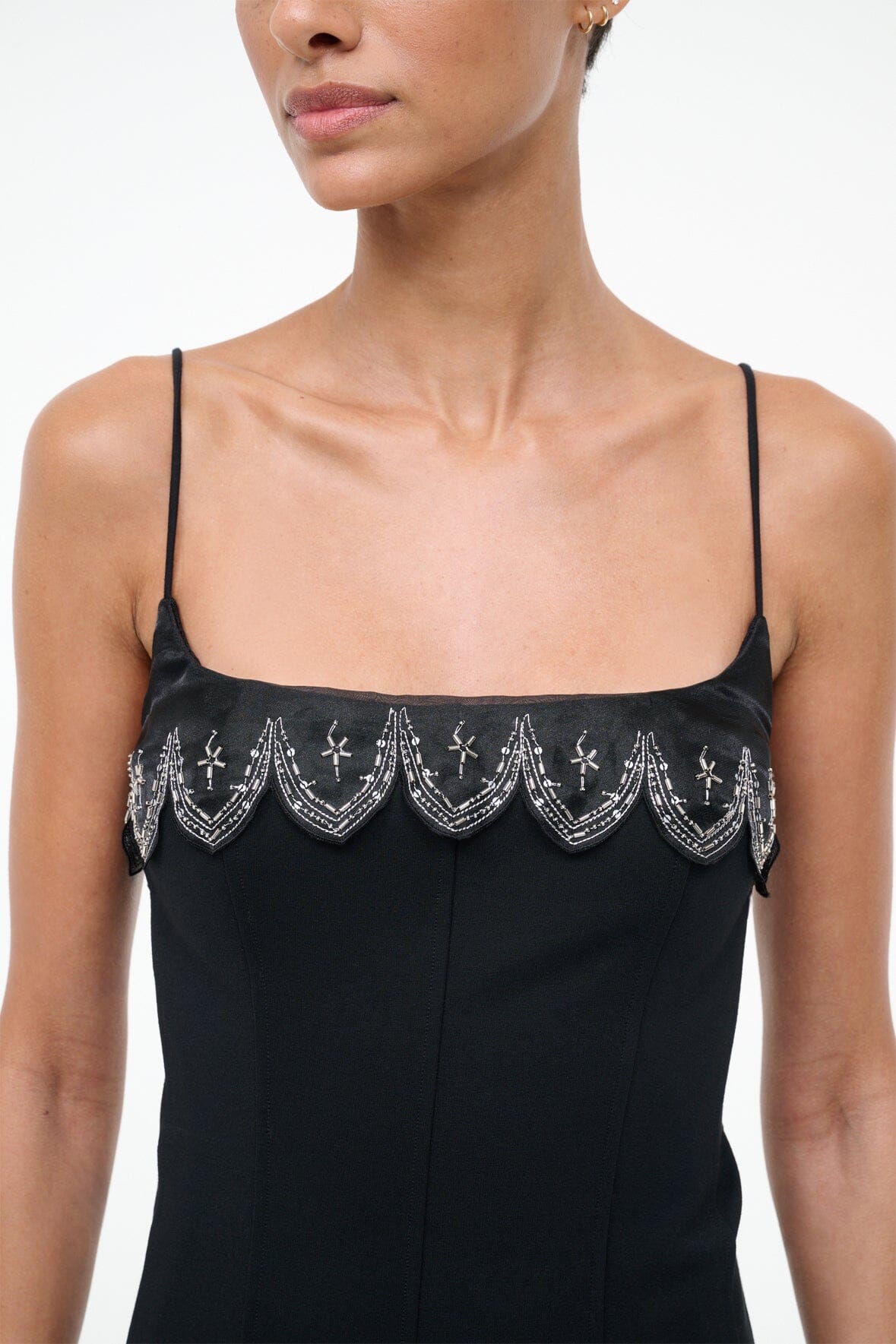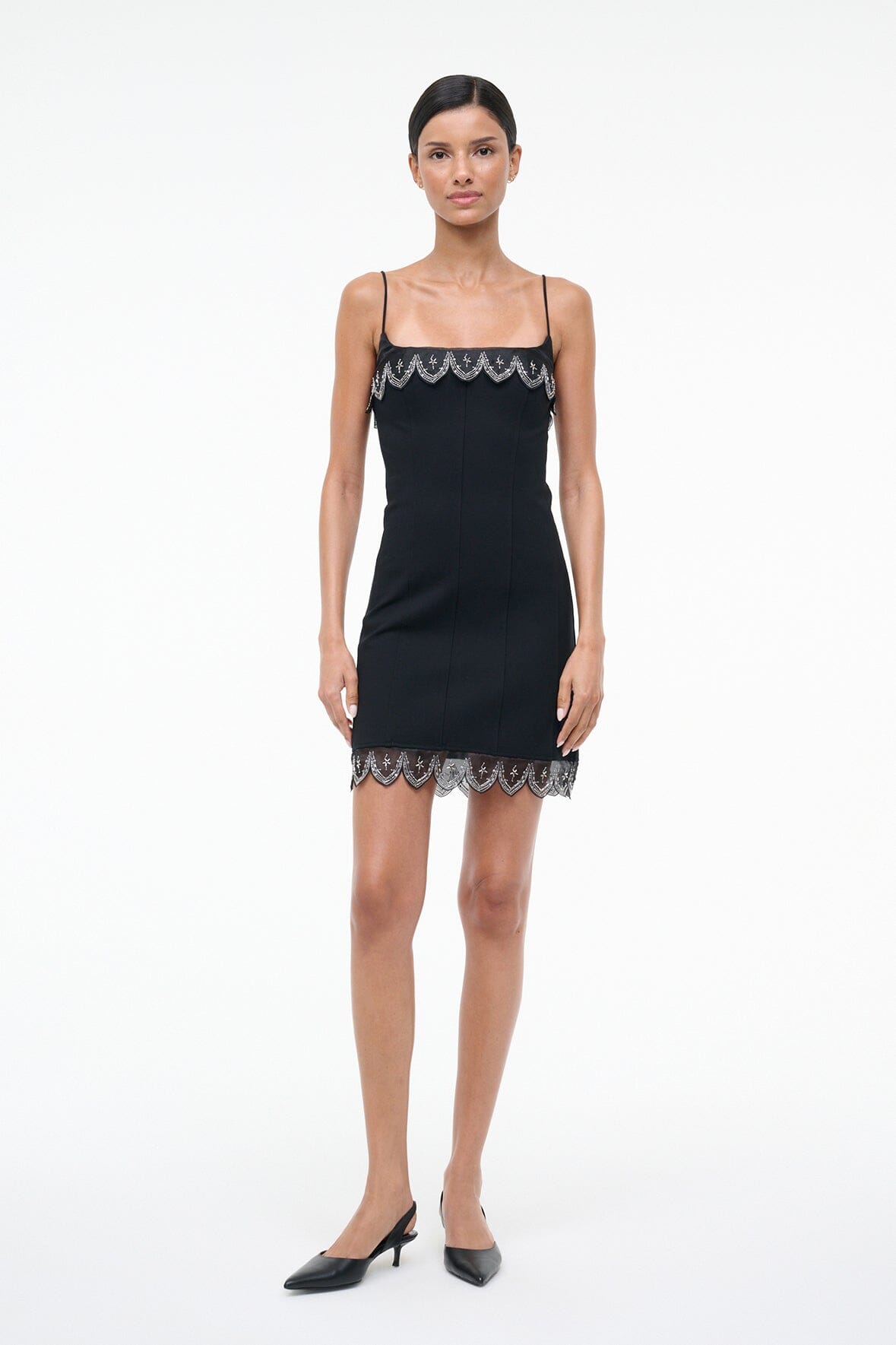 The Colette Dress is a holiday mini dress with a sheer embellished scalloped trim. This style features spaghetti straps, a fitted body, and a hidden zipper.