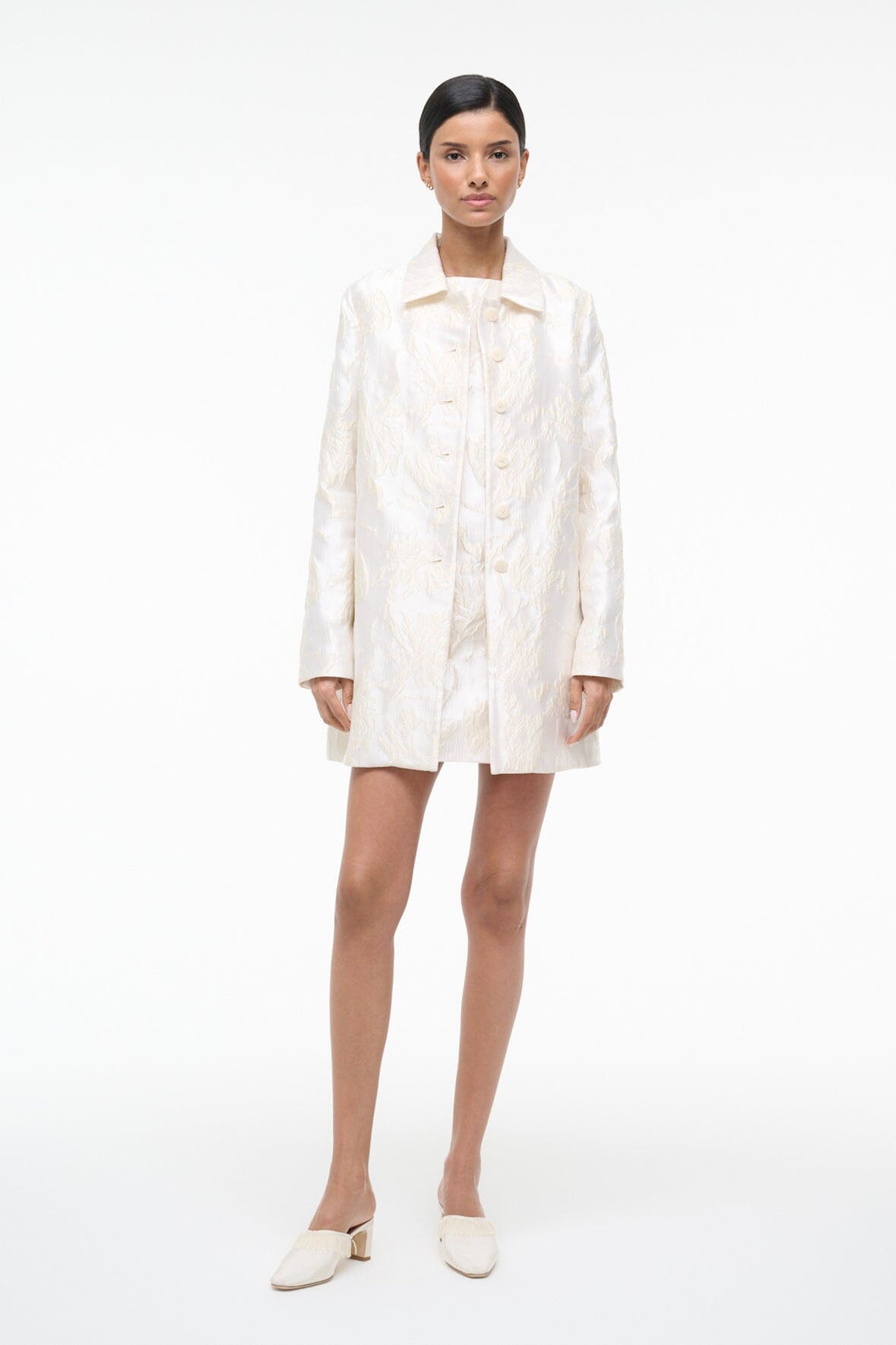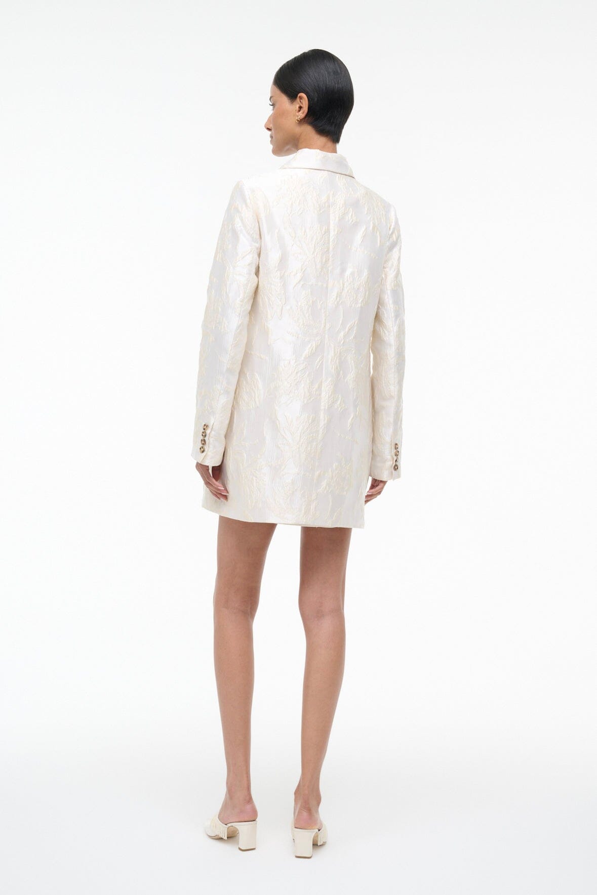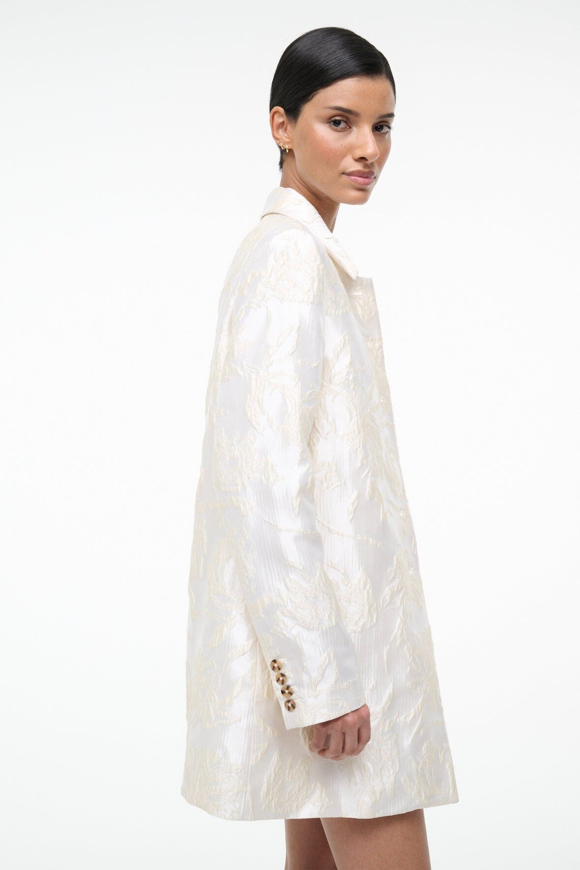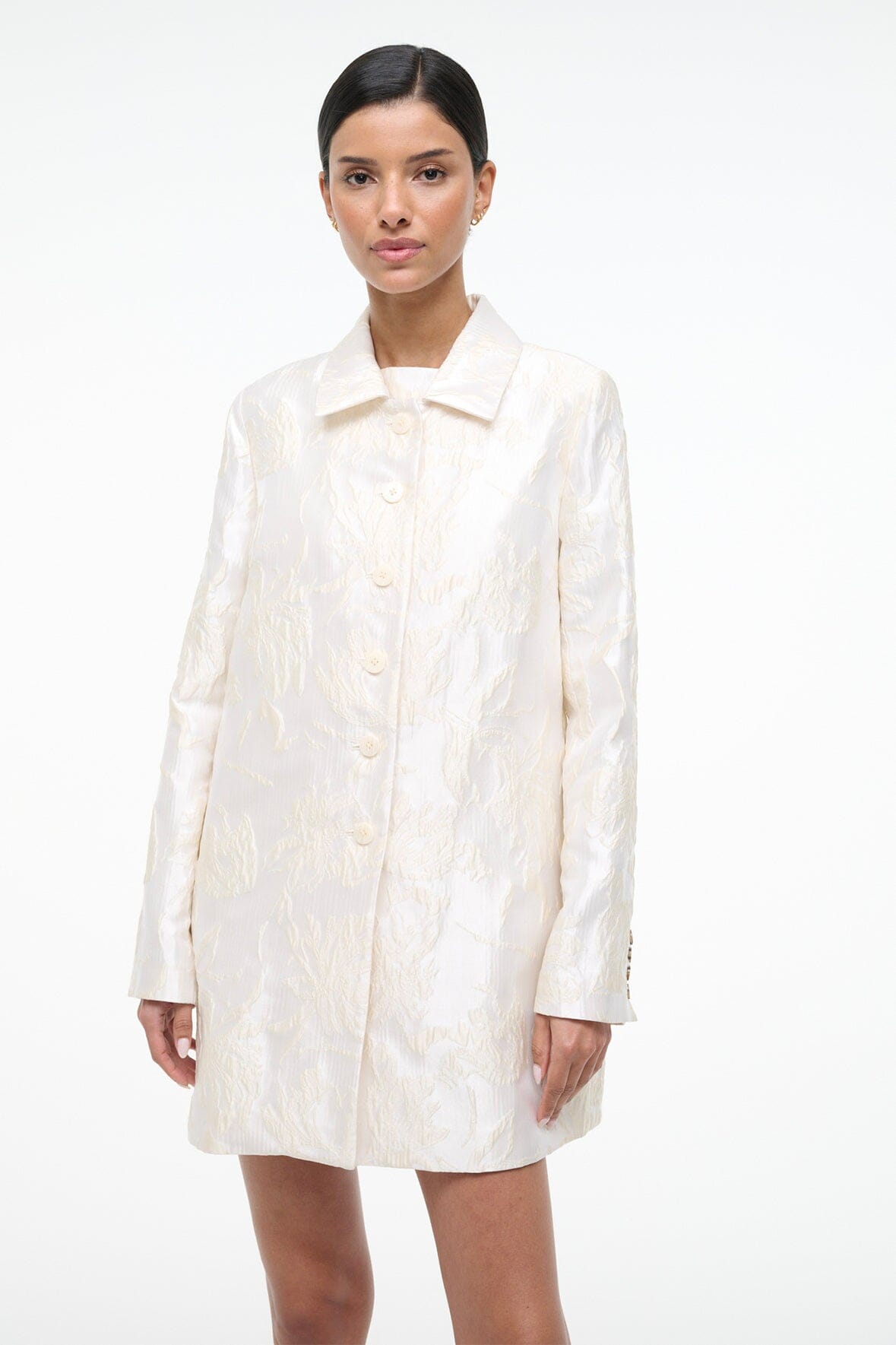 Elevate your outfit with this floral metallic brocade jacket, featuring striking contrast buttons that add dimension and polish. Designed to coordinate seamlessly with the matching Mimi Dress, it's the perfect layering piece.