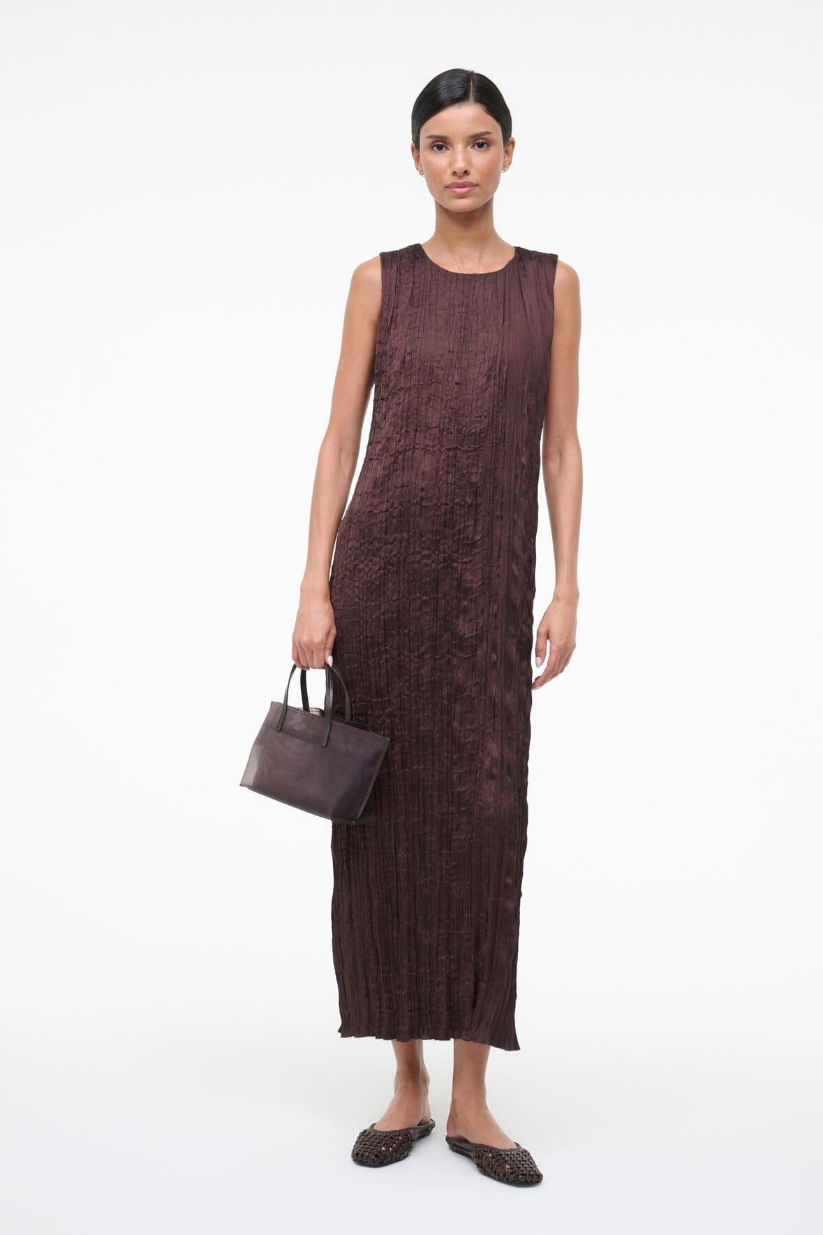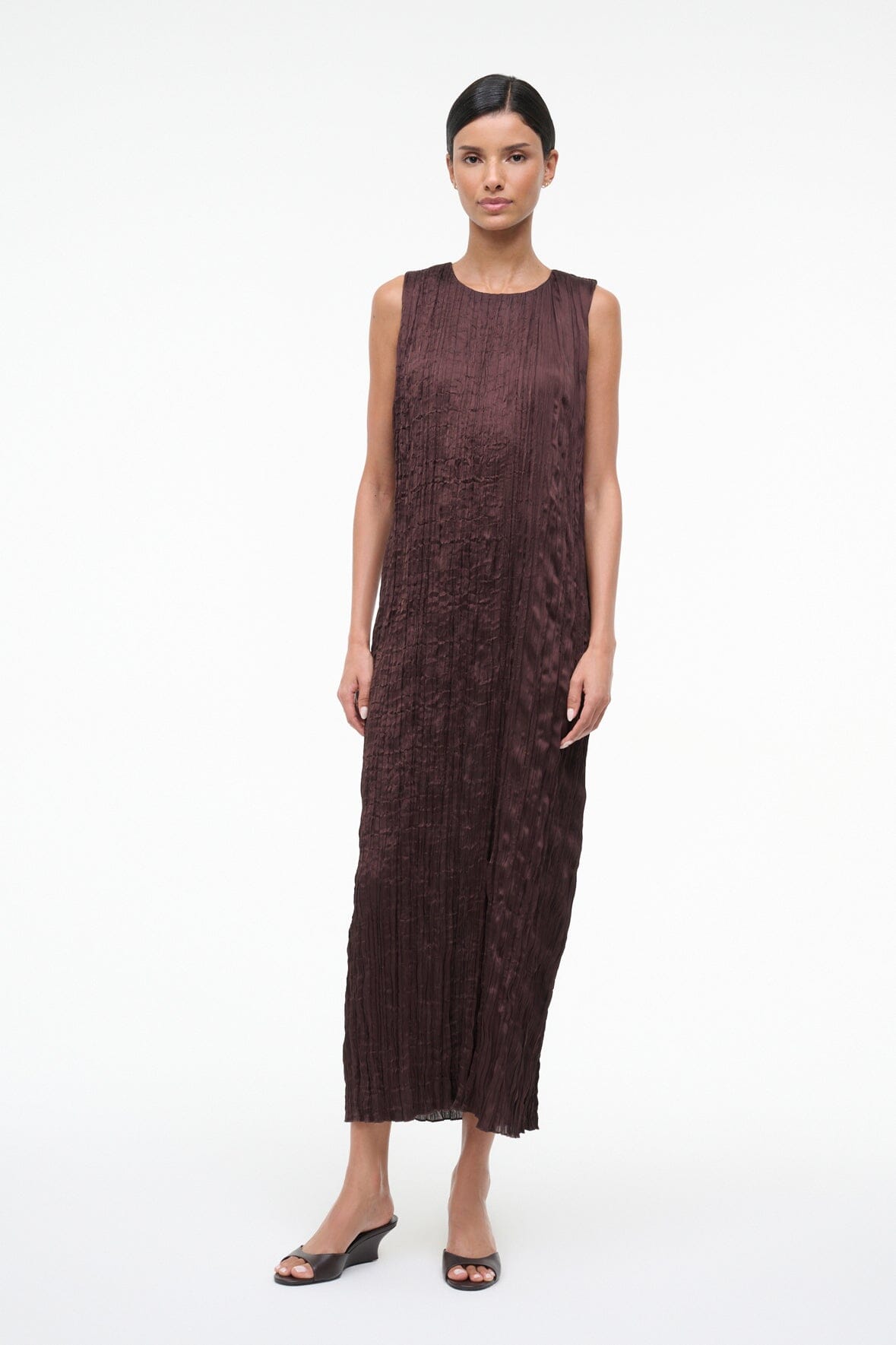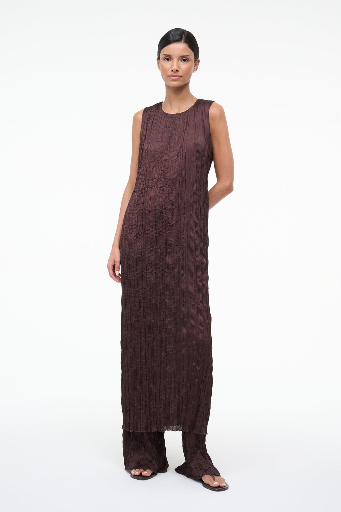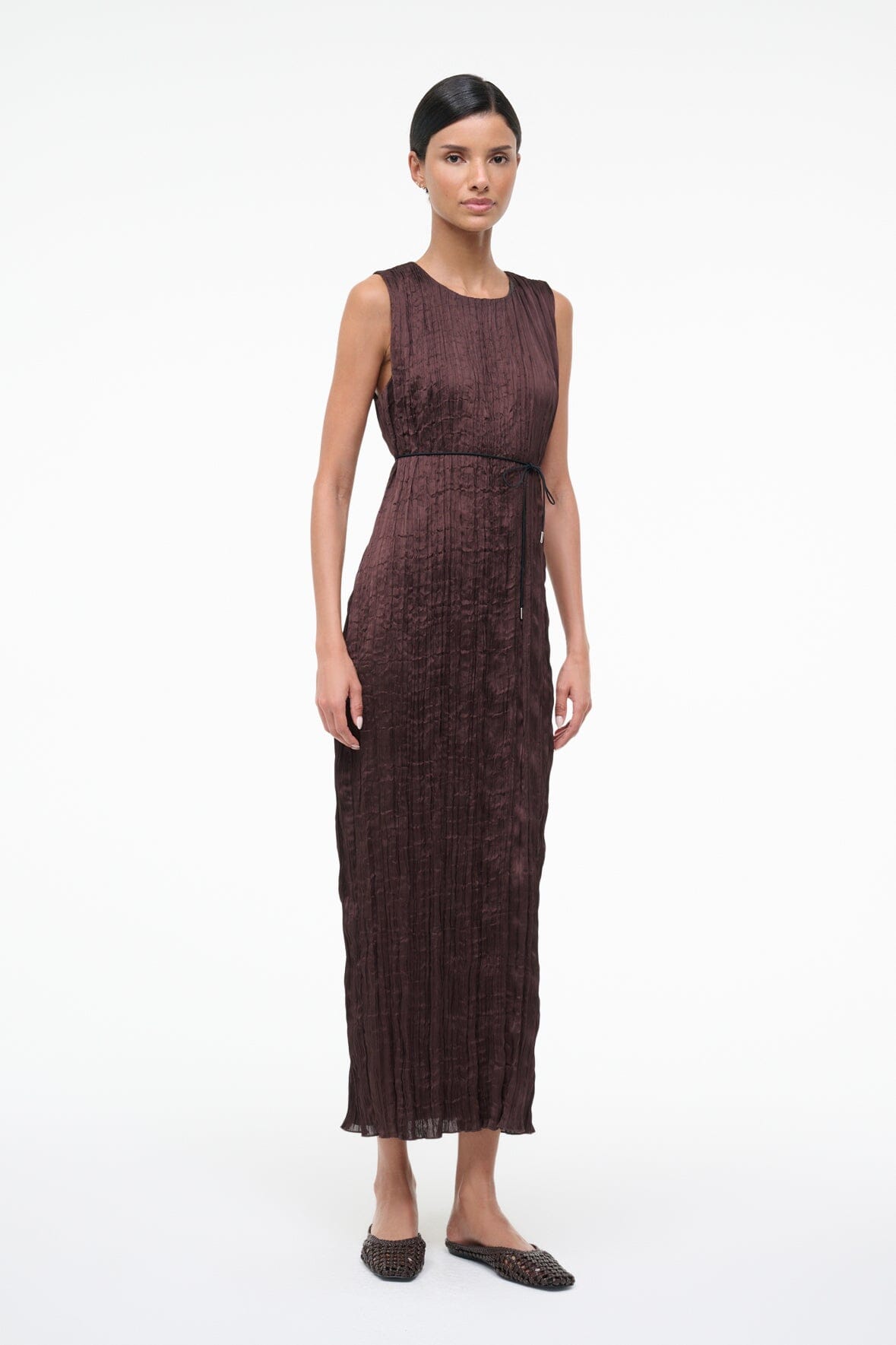 The Mizu is a plisse midi length column dress with a removable waist tie. It can be layered over the Nami Pant for a coordinated set or dressed up with a heel for a night out.