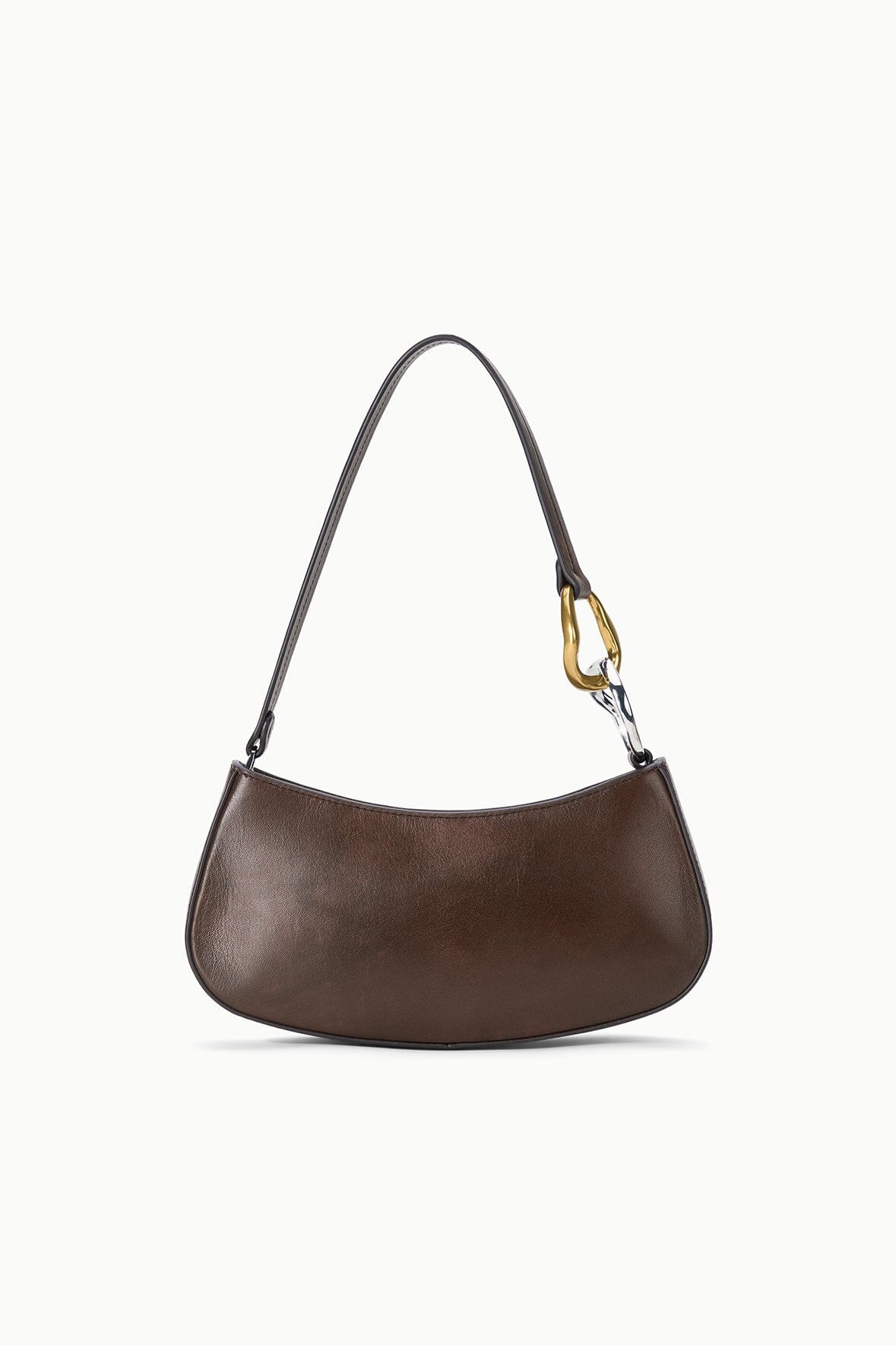 The Ollie Bag is a mini shoulder bag made out of metallic leather. This style features a two-tone hardware design on the strap and a zip closure.