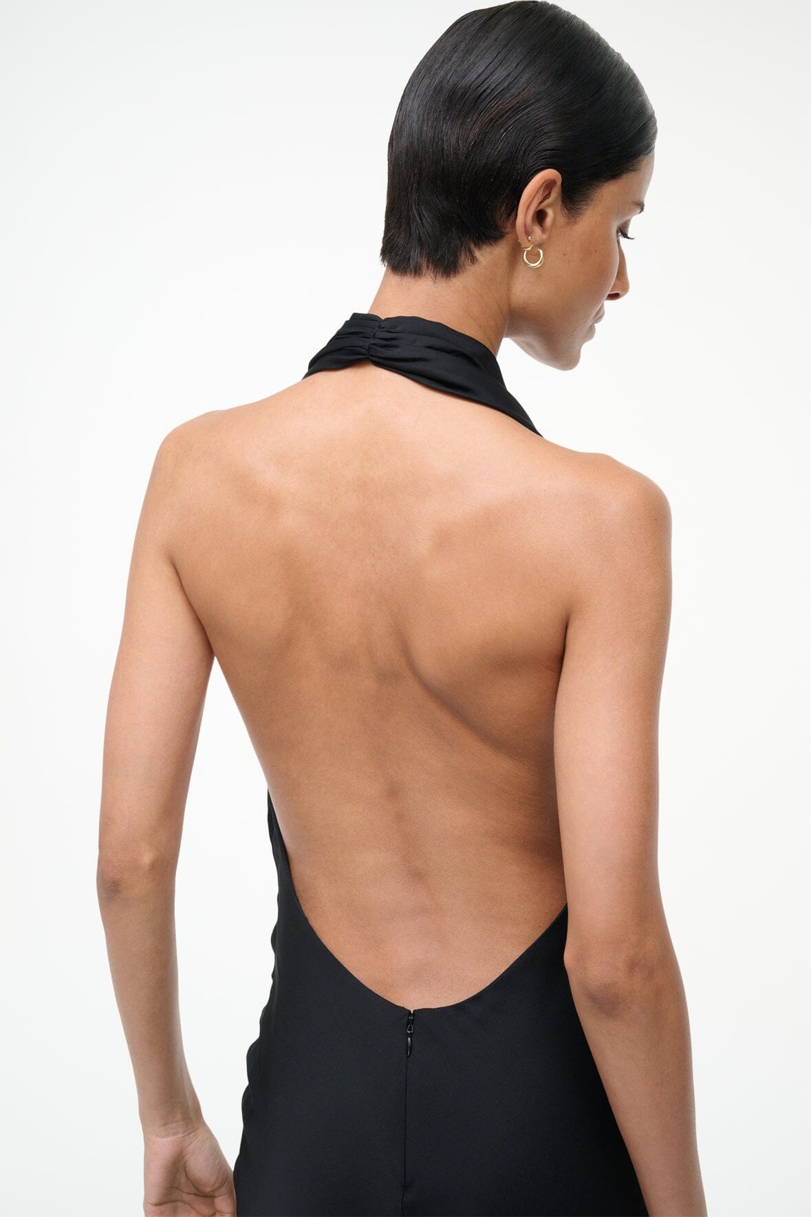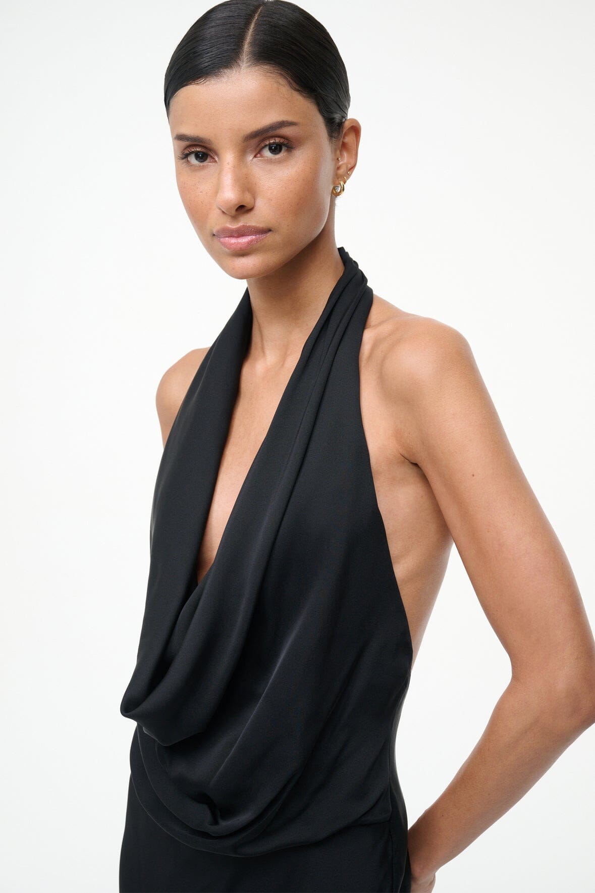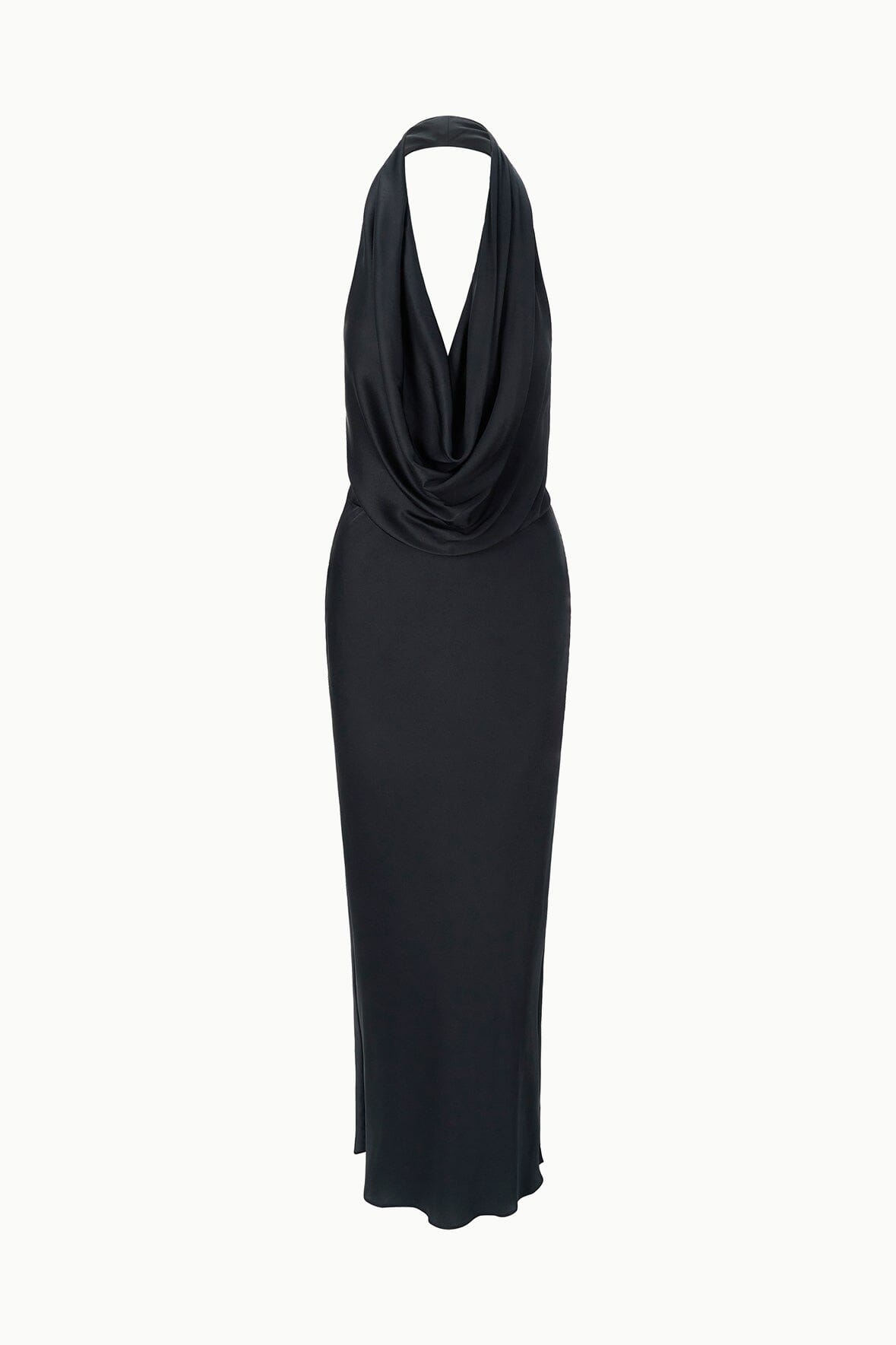 The Poppi dress is a halter maxi that features a softly sculpted cowl neckline and daring backless silhouette for a head-turning look.