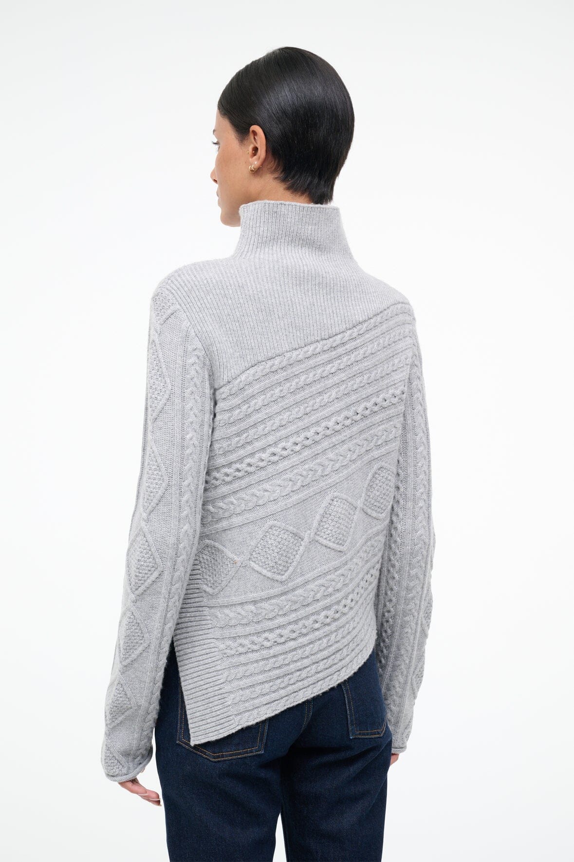 A cable knit turtleneck sweater made from a wool blend. The Sidney features an asymmetrical hem and diagonal knit pattern.