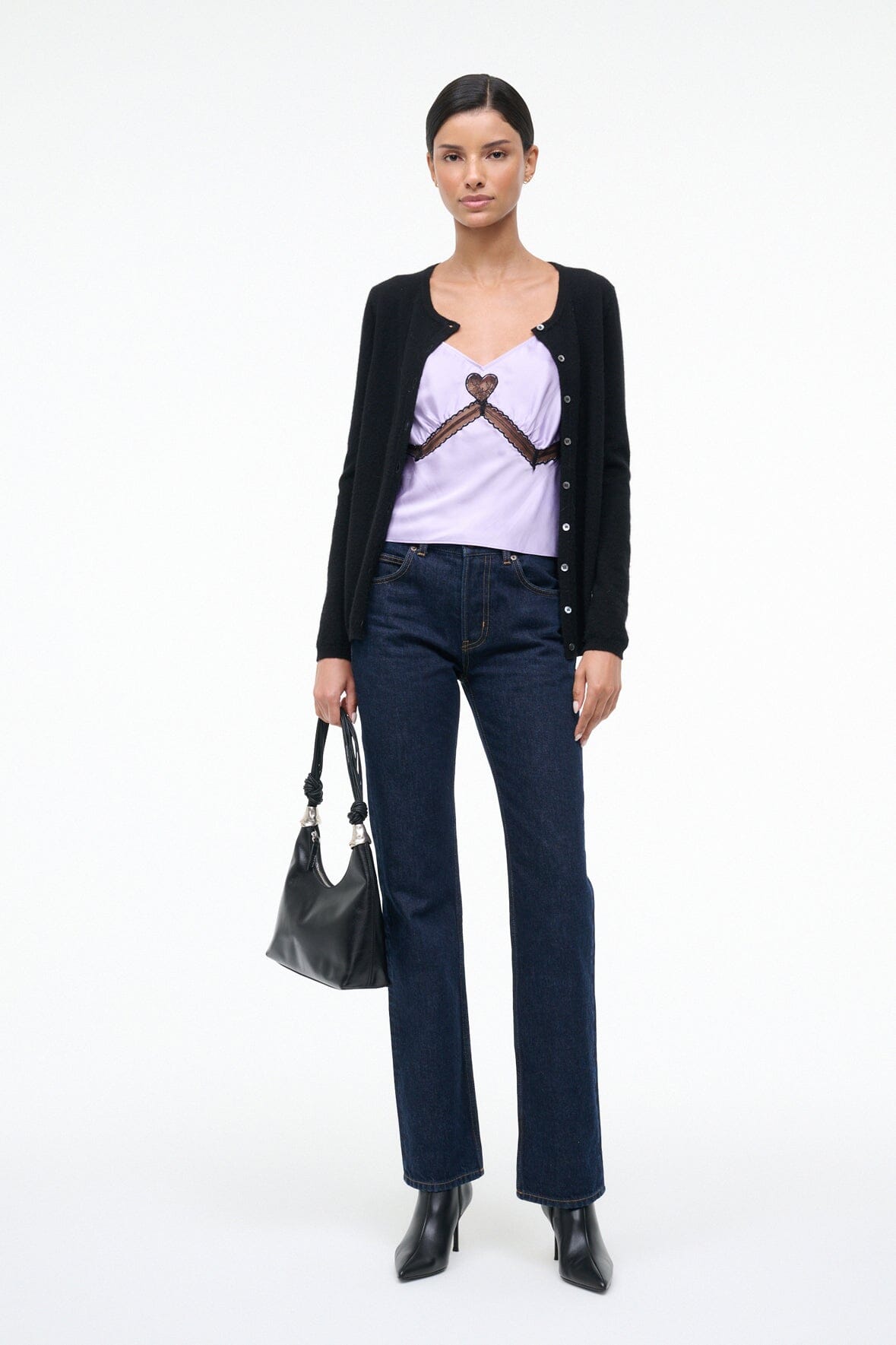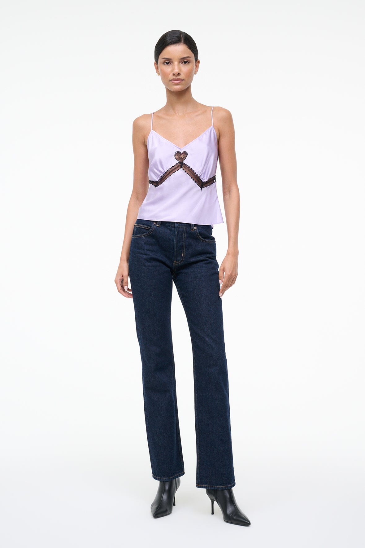 Crafted in a luxurious stretch silk satin, the Terra is an easy slip cami with spaghetti straps, and lace cutout details at the bust.