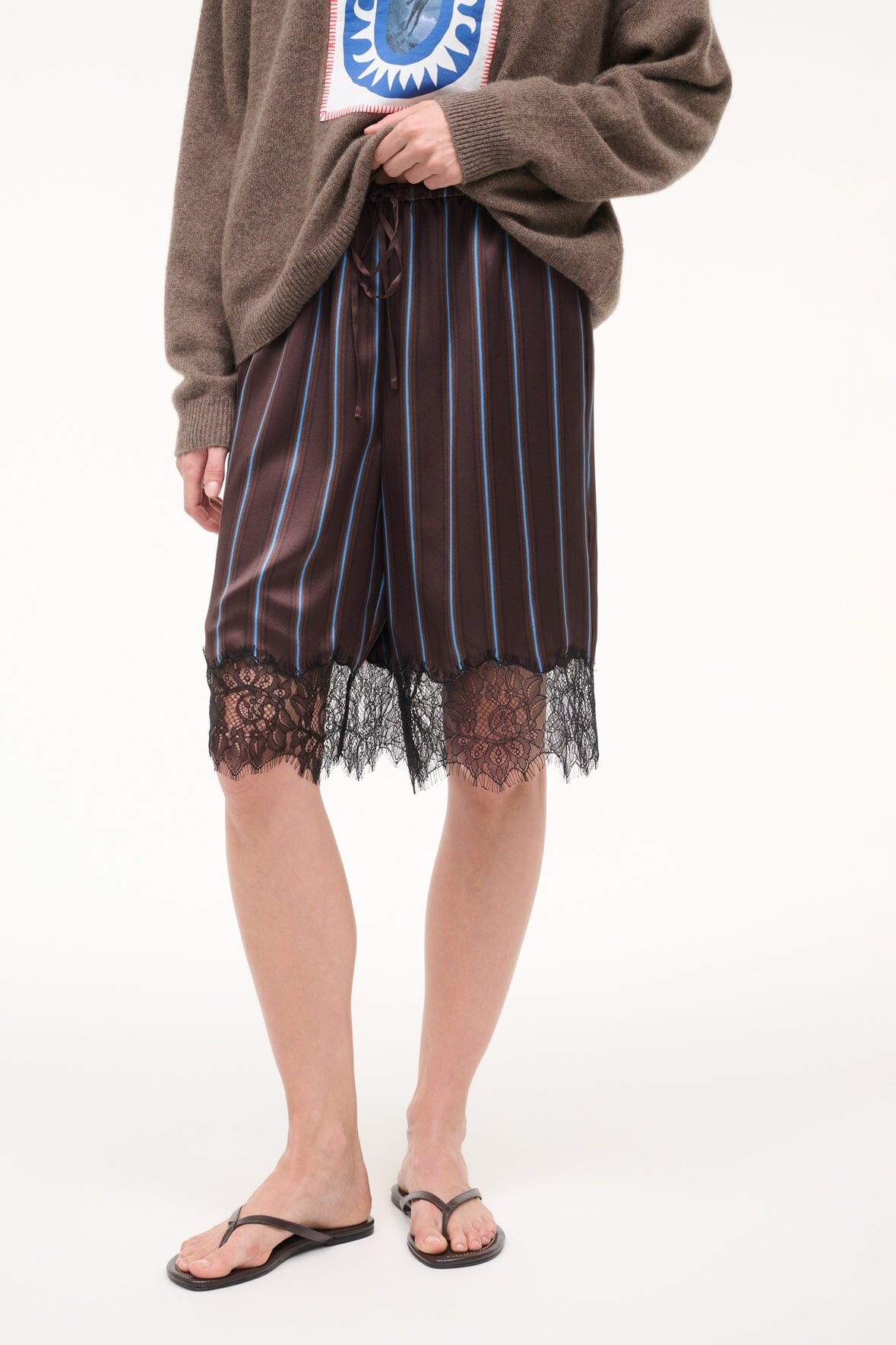Effortless elegance meets comfort in this silk bermuda short. Crafted from luxurious 100% silk with a delicate lace trim hem and adjustable drawstring waist, it's the perfect piece for warm-weather dressing. Versatile enough for casual days or dressed-up occasions.