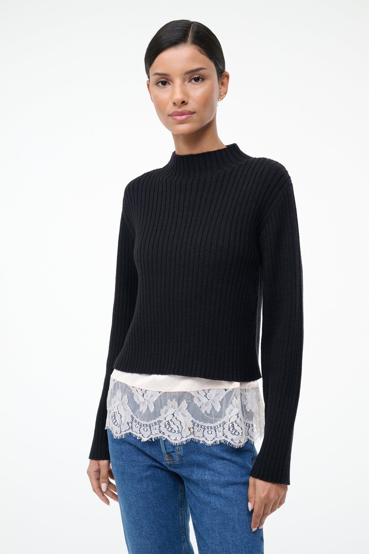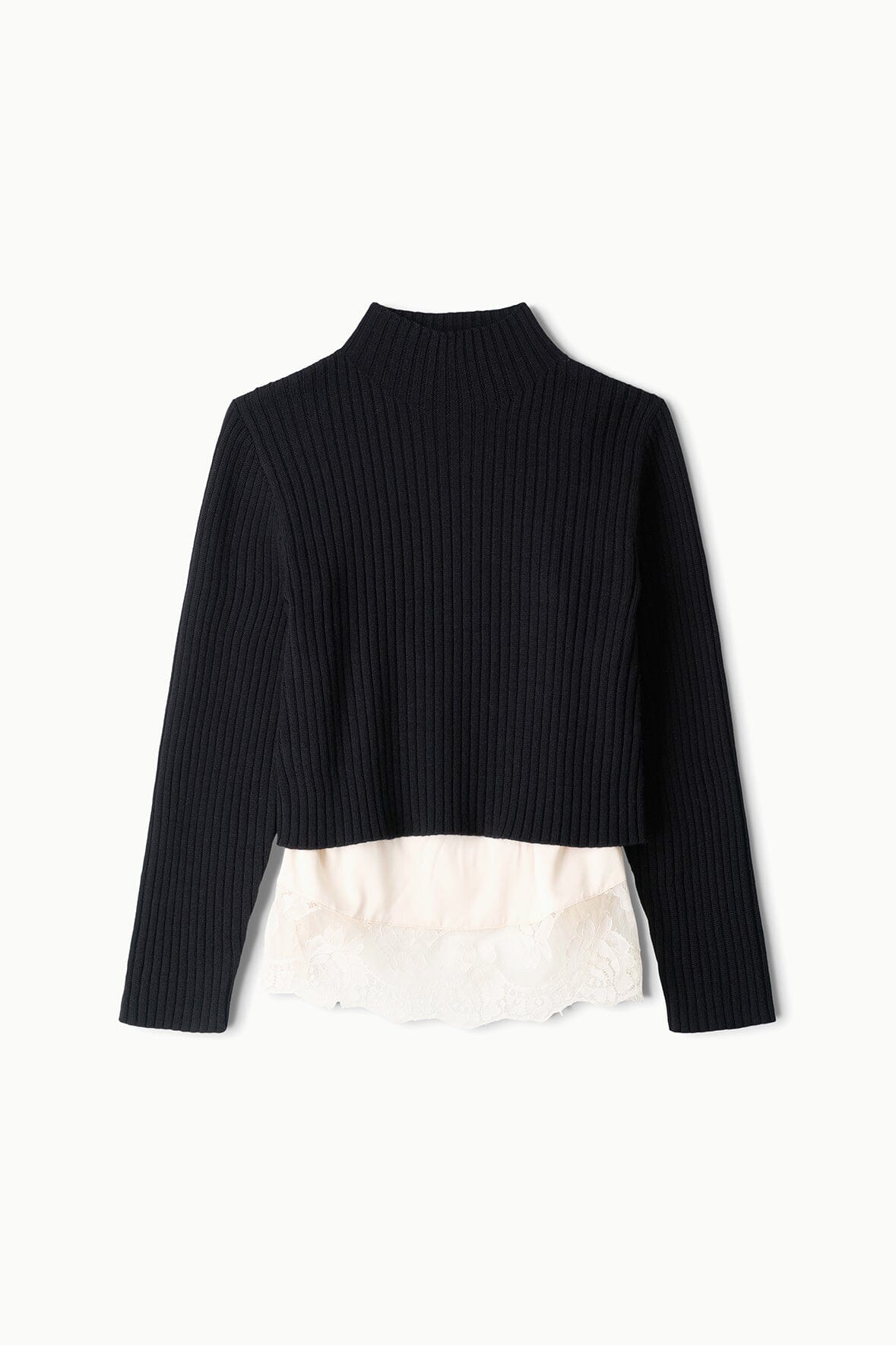 The Willow is a wool blend sweater that features a mock neck, long sleeves, and a layered contrast lace hem for pre-styled ease.