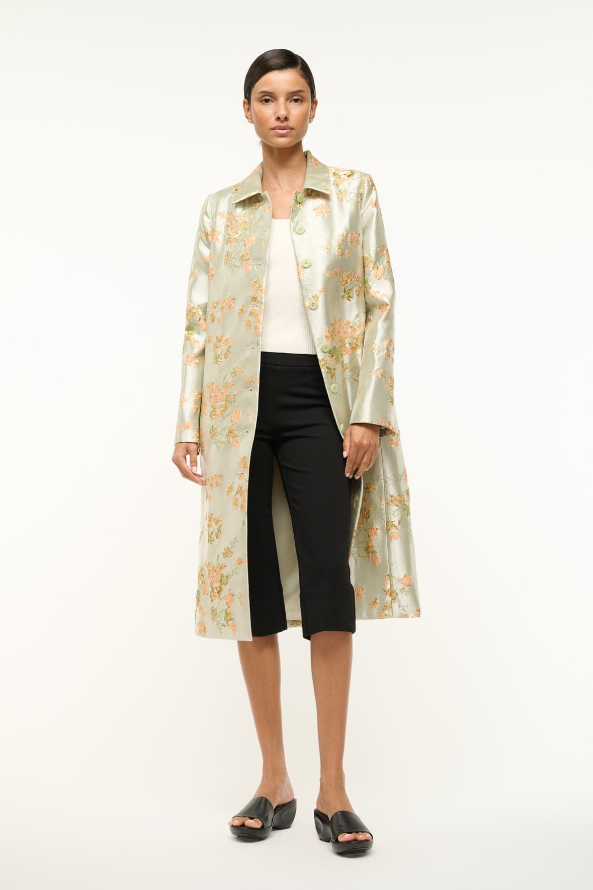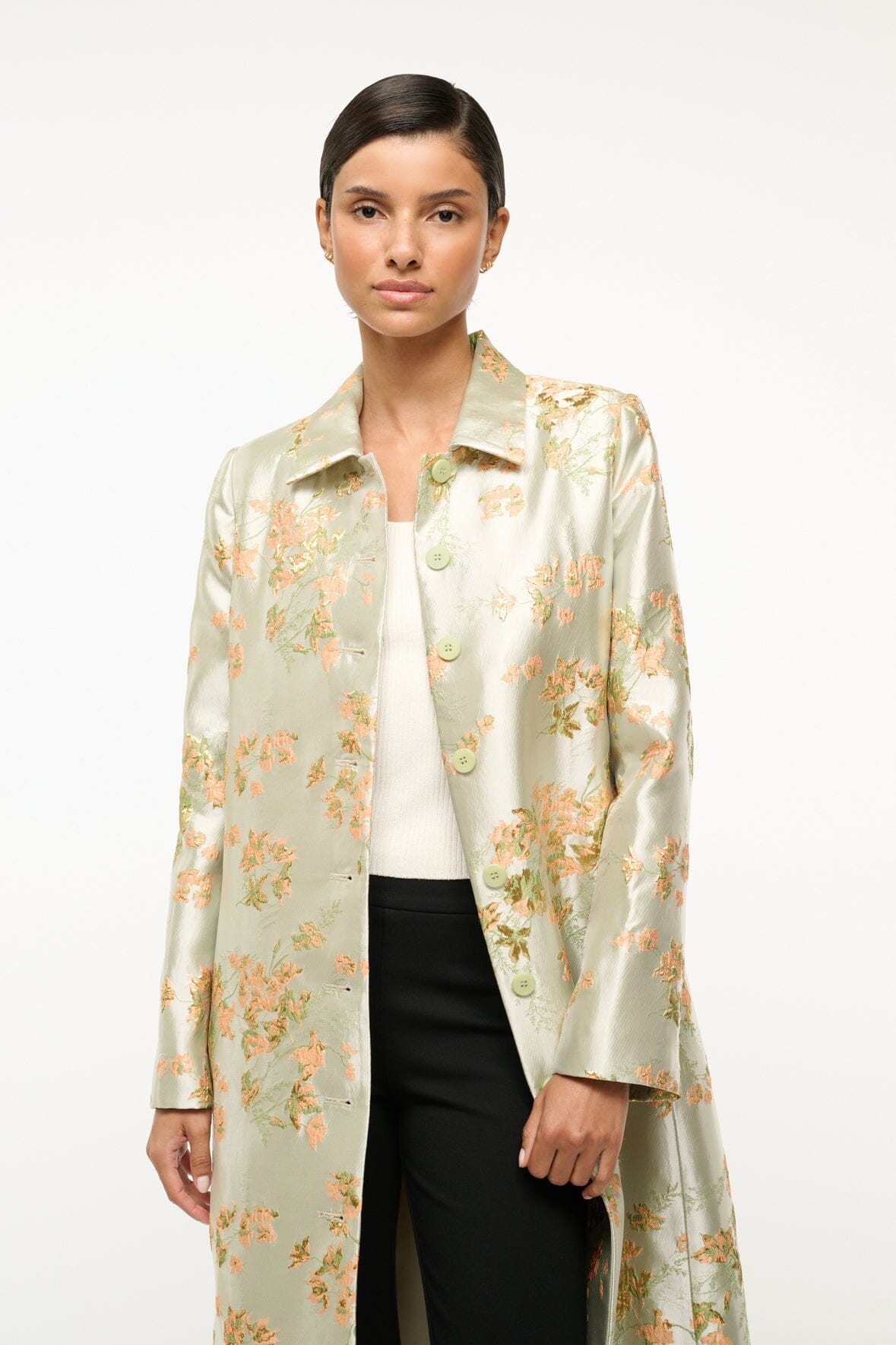 A single-breasted overcoat made from a floral metallic brocade fabric perfect for the Holidays. The Antoinette features side pockets and contrast buttons.